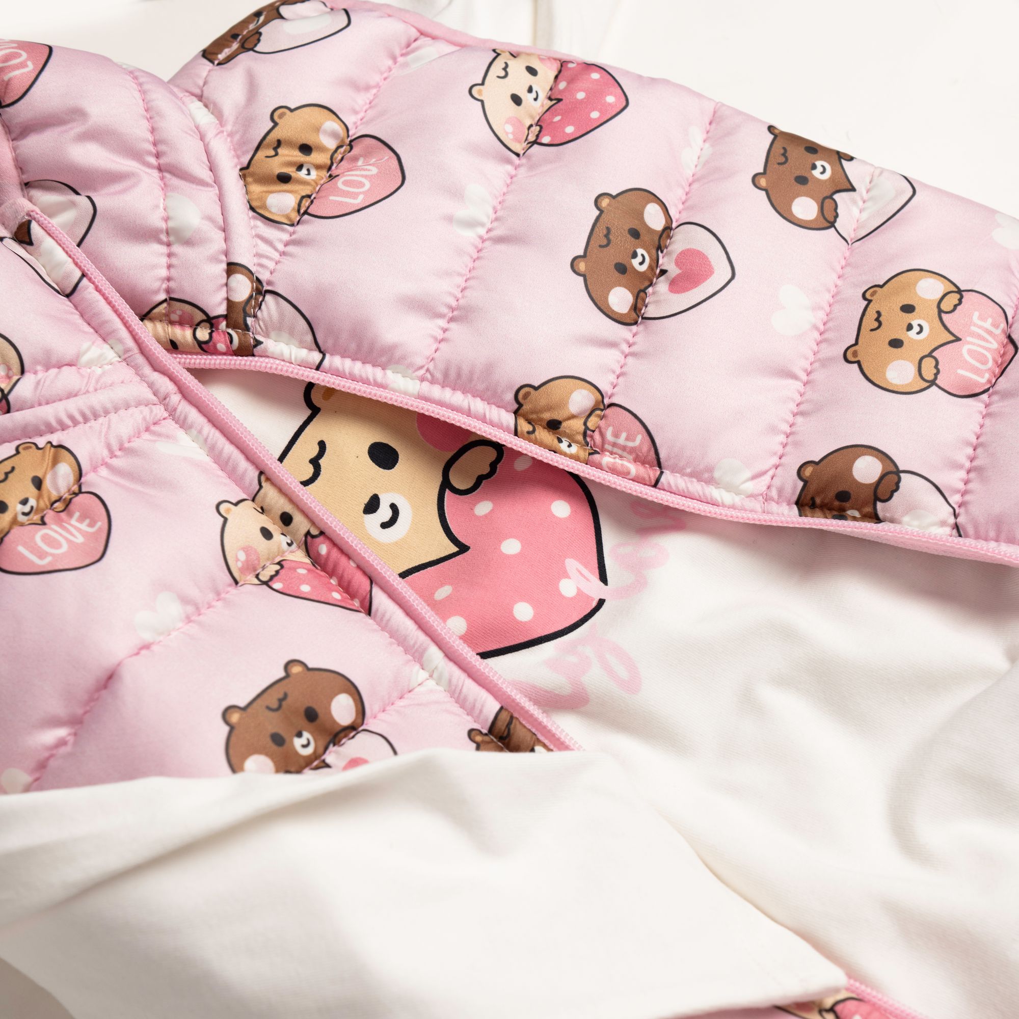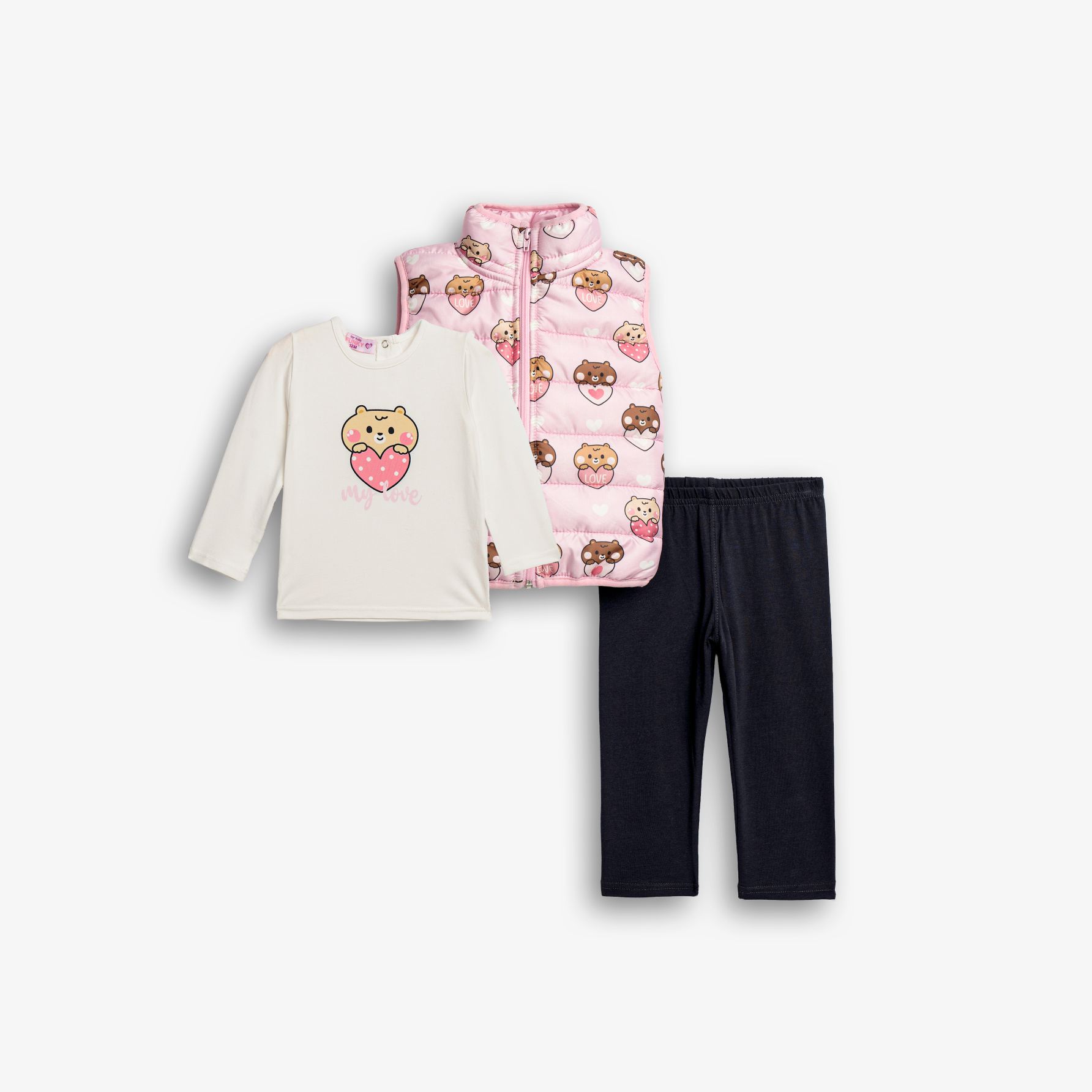 Σετ 3 τεμάχια τζάκετ αμάνικο με τύπωμα (αρκουδάκια) allover και μπλούζα κοντομάνικη κάλτσα λύκρα με τύπωμα και κολάν κάλτσα λύκρα σε χρώμα ροζ πούδρας/εκρού/ανθρακί για κορίτσι μηνών