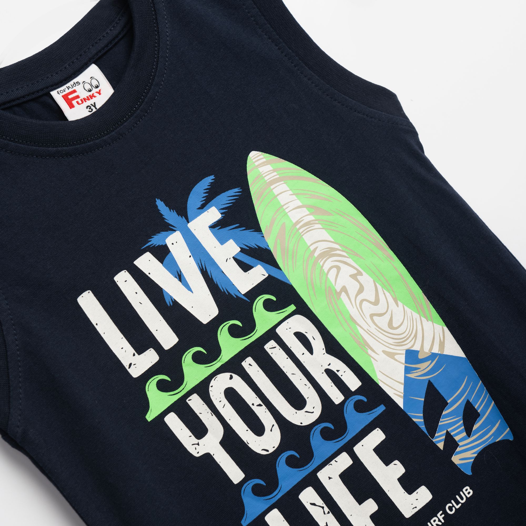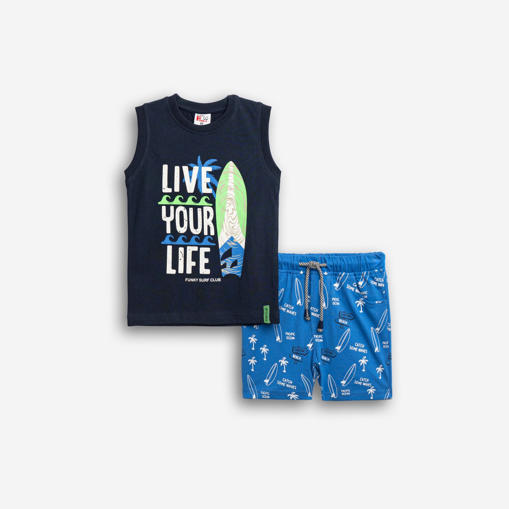 Set sleeveless shirt with printing (live your life) and corduroy up to knee with printing in color light blue/light rua for boys 1-6 years