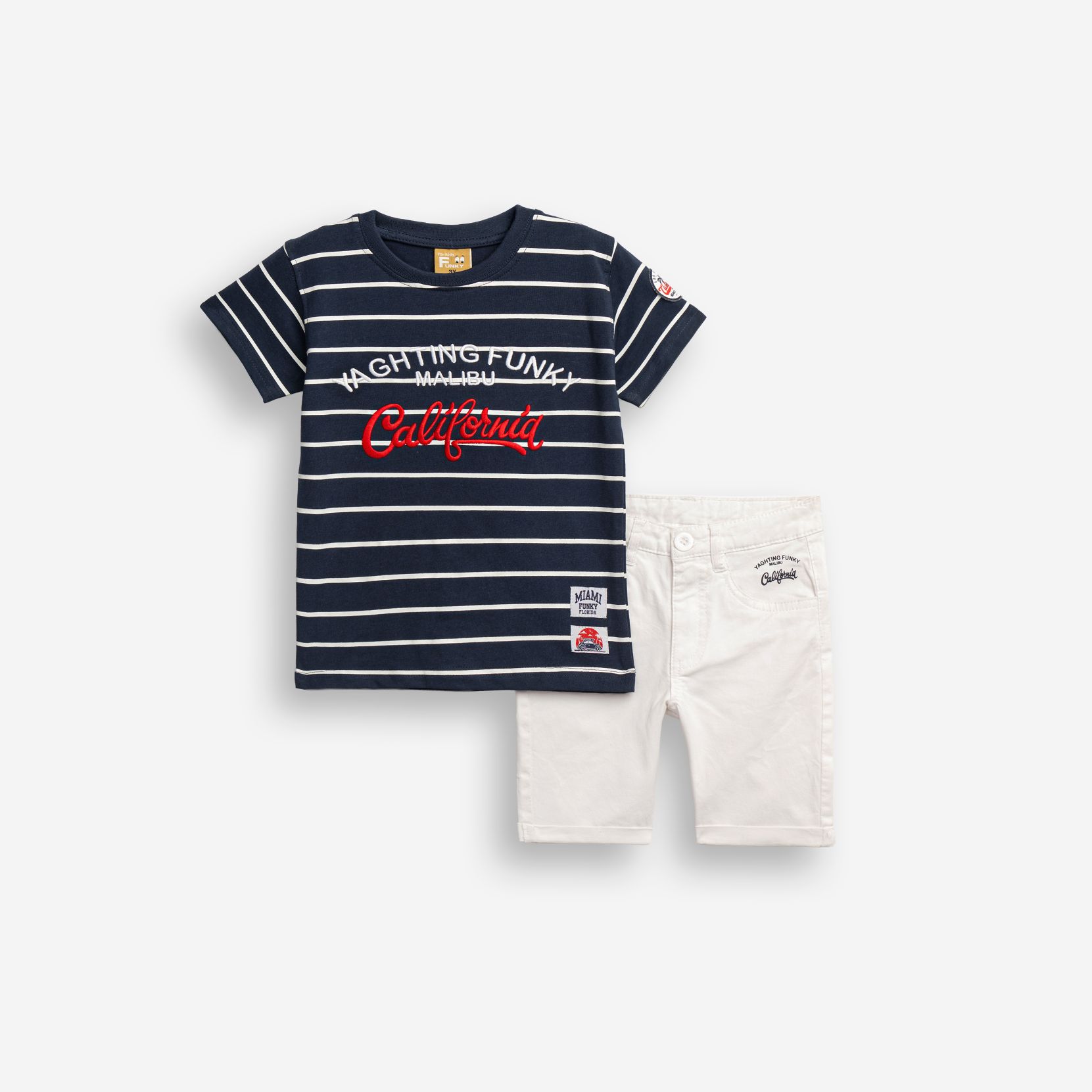 Set T-shirt with printing (yachting) and corduroy stable up to knee with pockets in color blue striped/white for boys 1-6 years