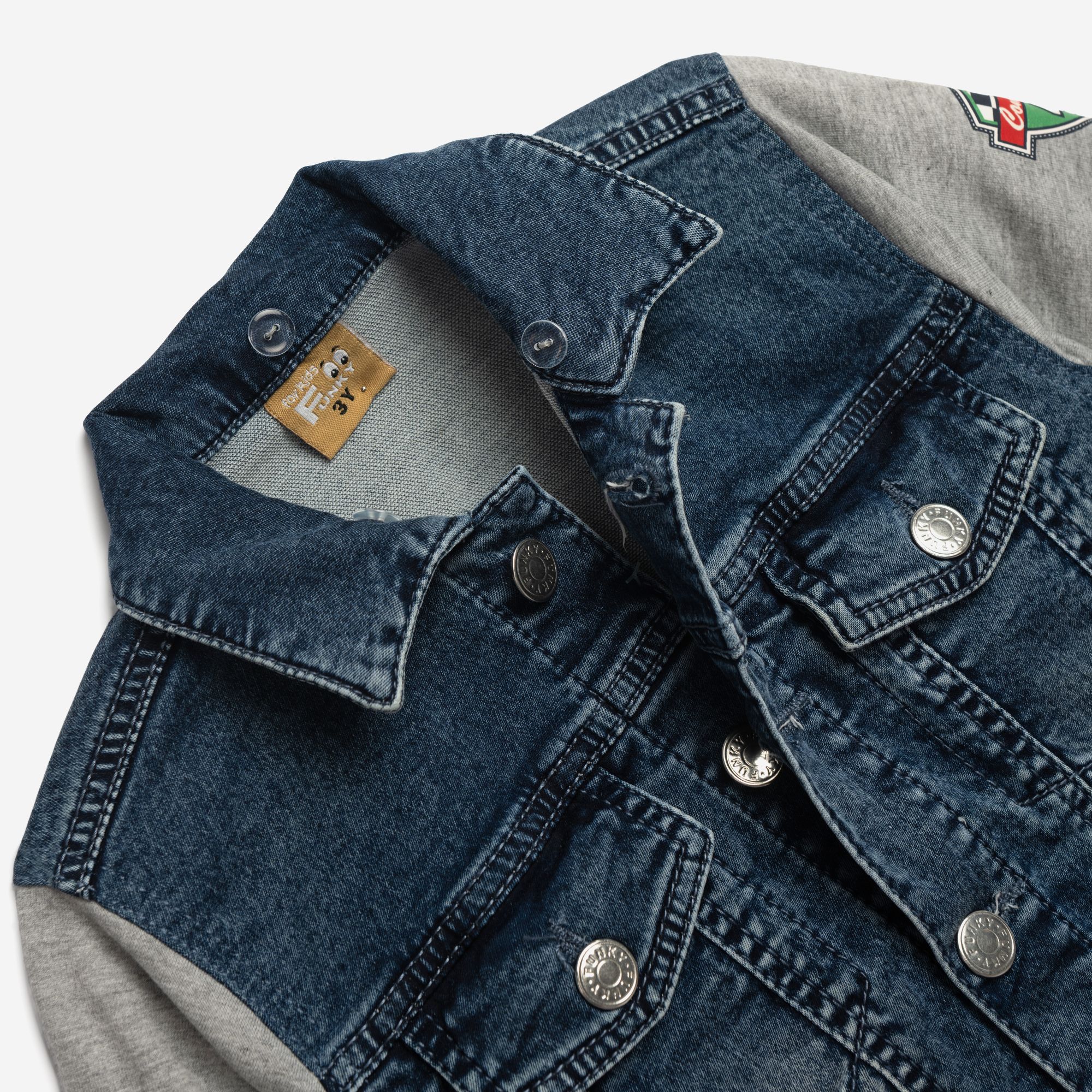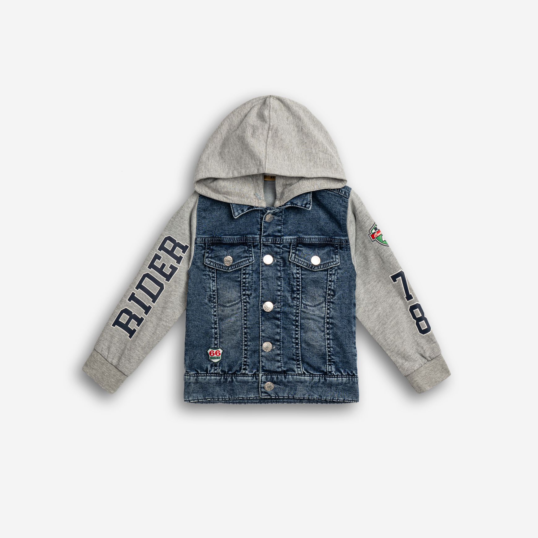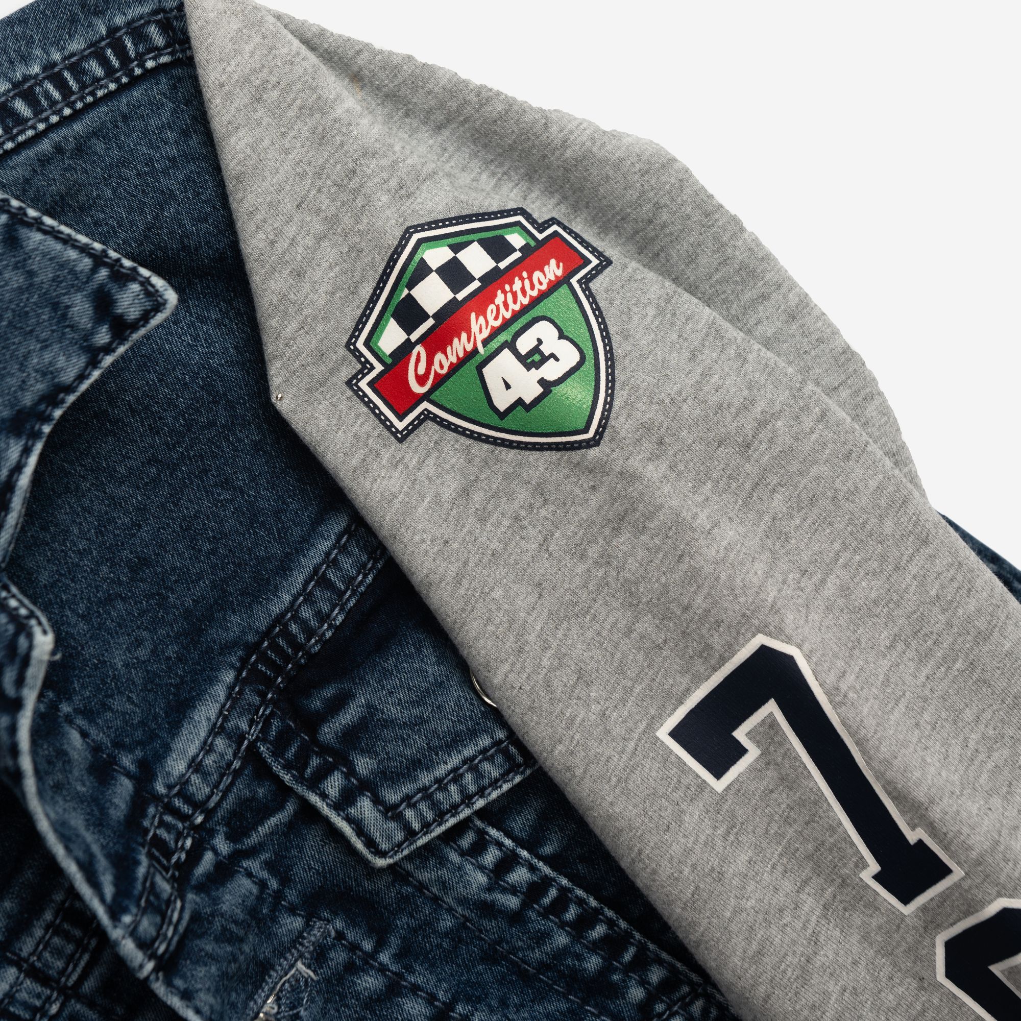 Jacket jean lycra and fleece with hood with printing (rider) and pockets in color blue jean-grey melange for boys 1-6 years
