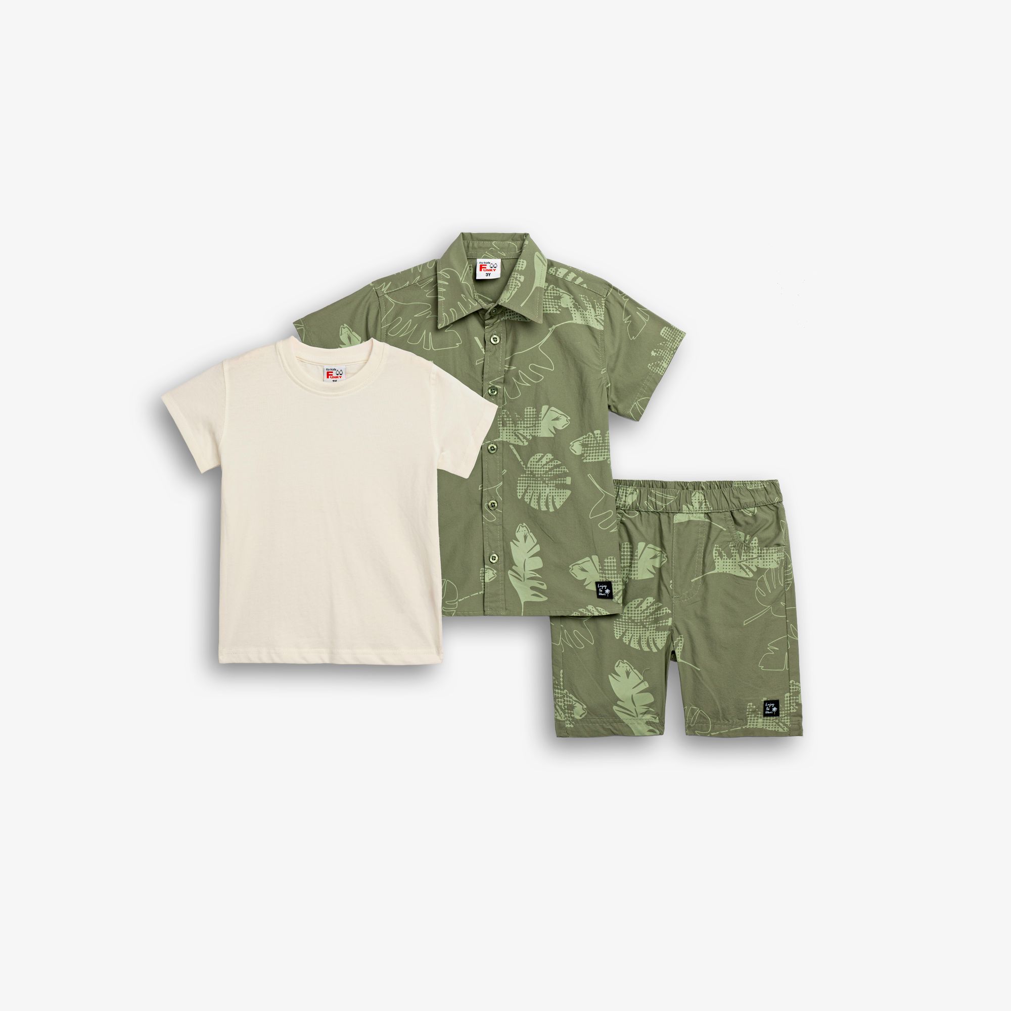 Set 3pcs shirt short-sleeved poplin with printing (leaves) allover and T-Shirt jersey and corduroy poplin with printing allover in color light khaki/ecru/light khaki for boys 1-6 years