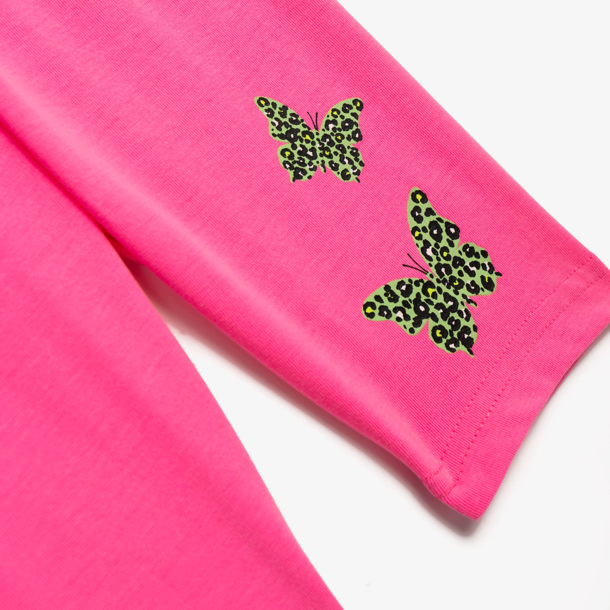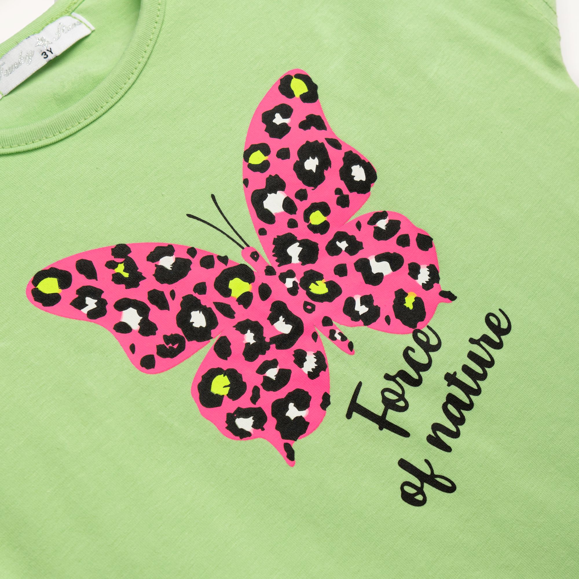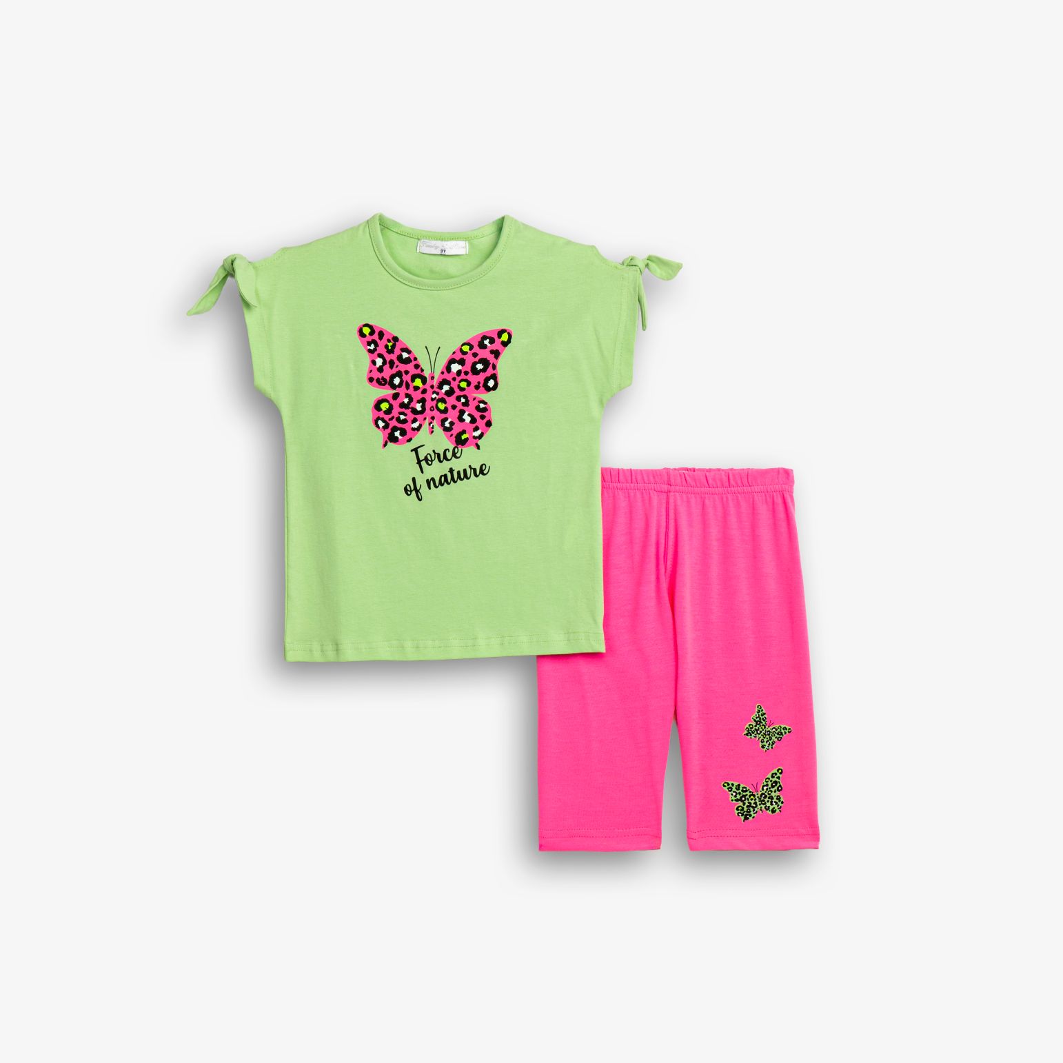 T-Shirt with printing (butterfly) and leggings under the knee jersey lycra with printing in color paradise green/fluorescent pink for girls 1-6 years