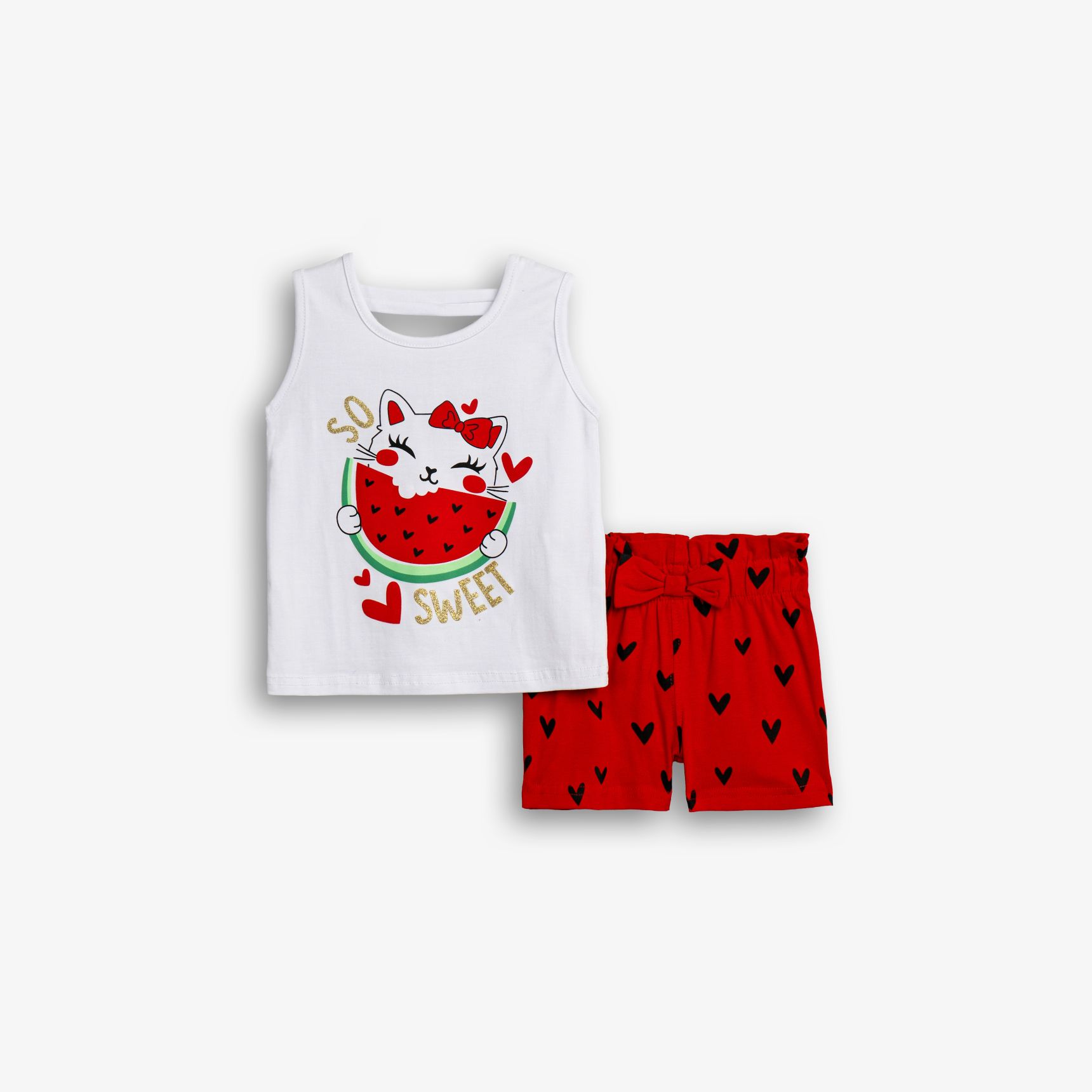 Set blouse jersey lycra with printing (cat with watermellon) and shorts with printing allover in color white/red for girls 1-6 years