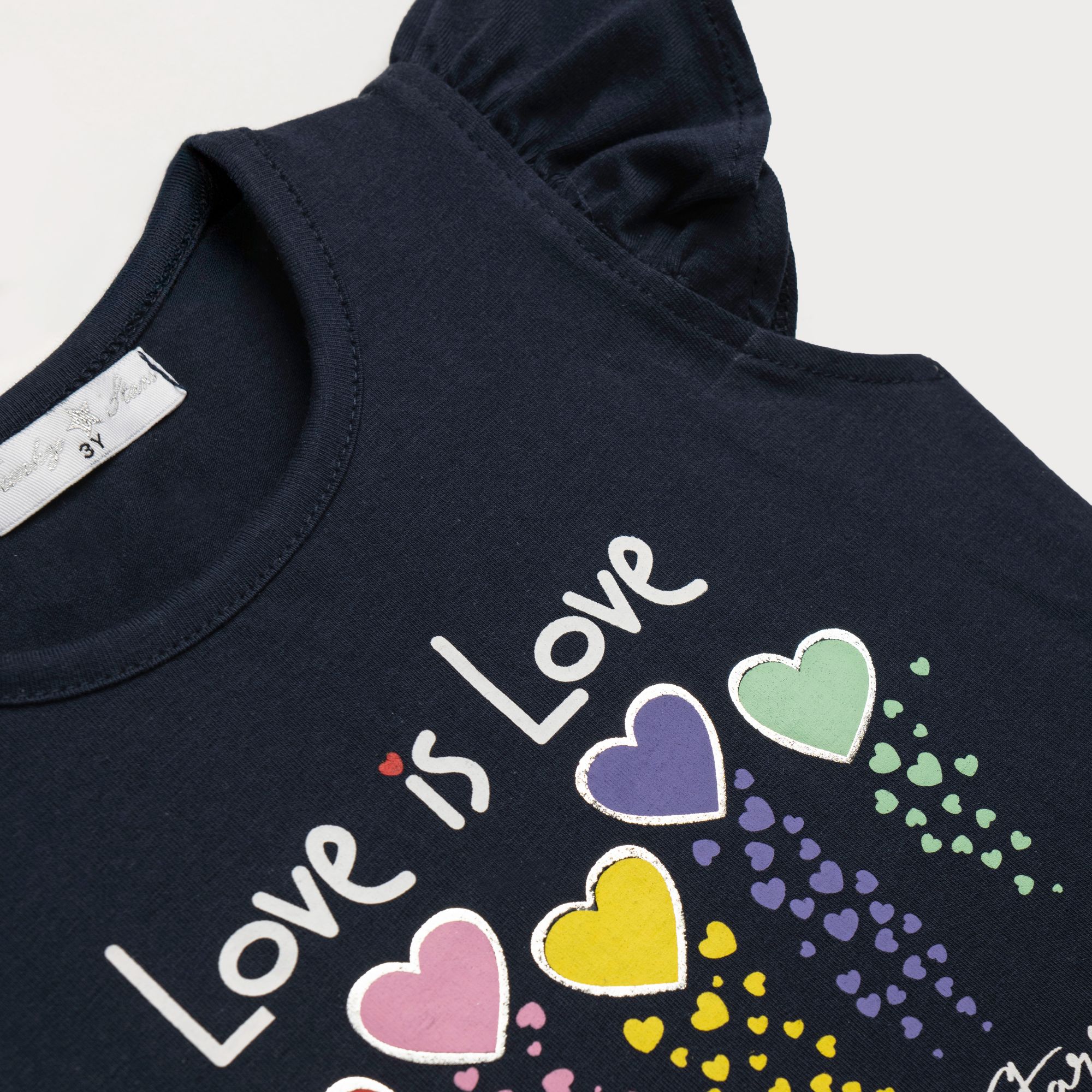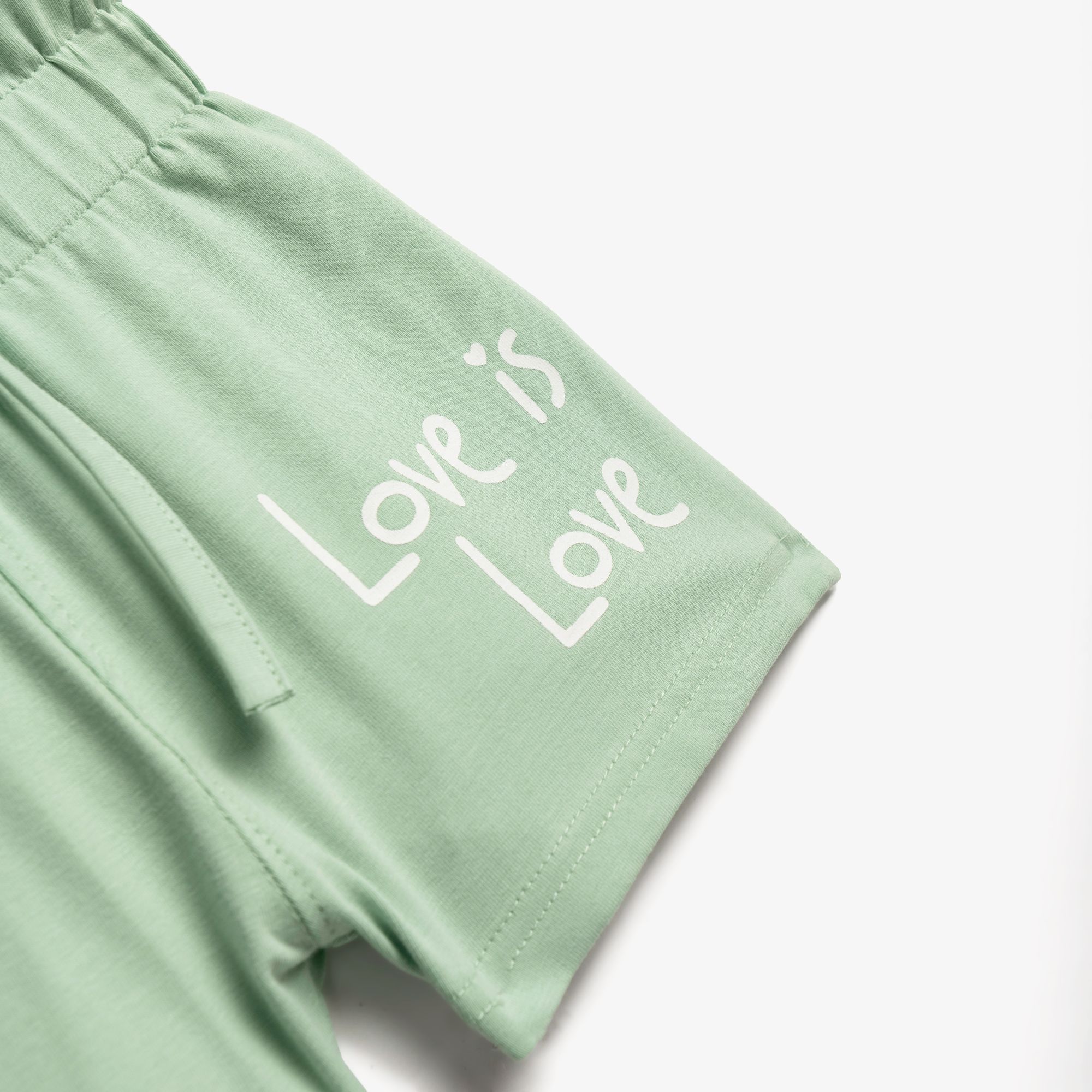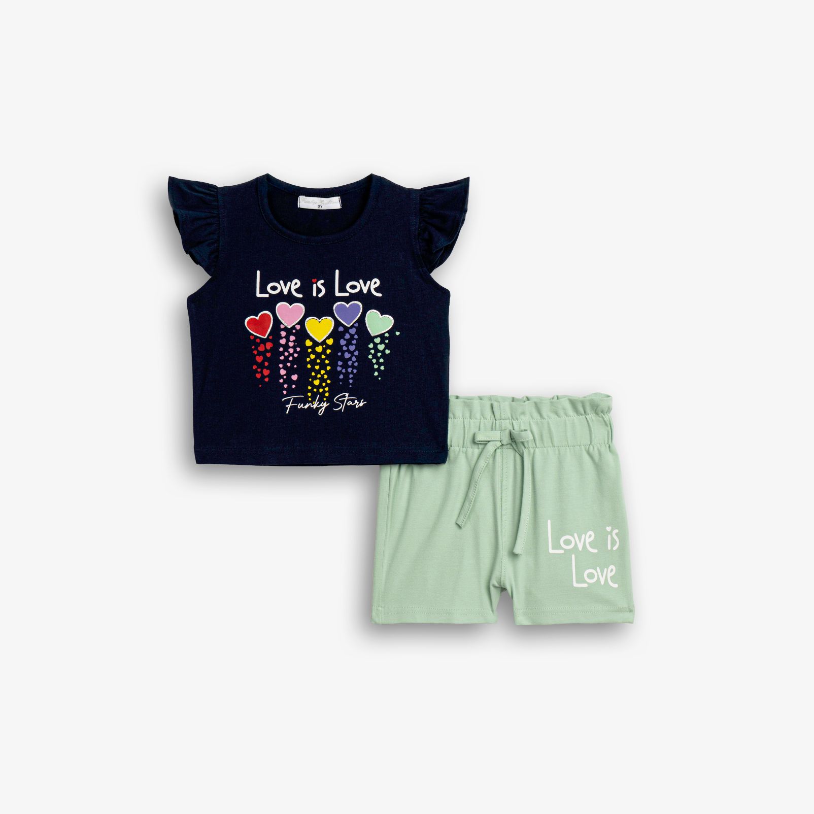 Set blouse jersey lycra with printing (love is love) and shorts with printing in color blue/peanut for girls 1-6 years