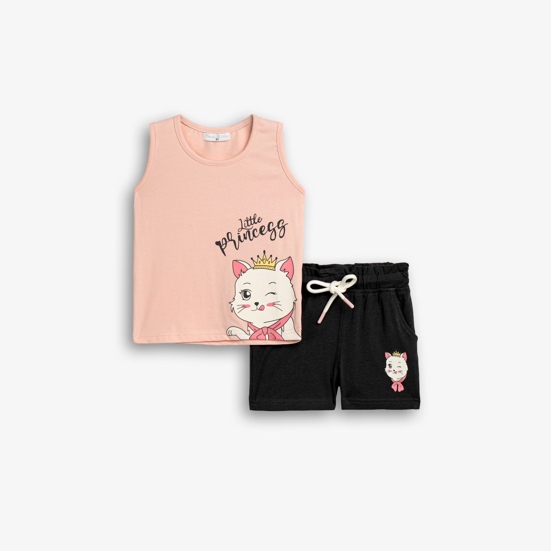 Set blouse jersey lycra with printing (cat) and shorts with printing in color pink powder/anthracite for girls 1-6 years