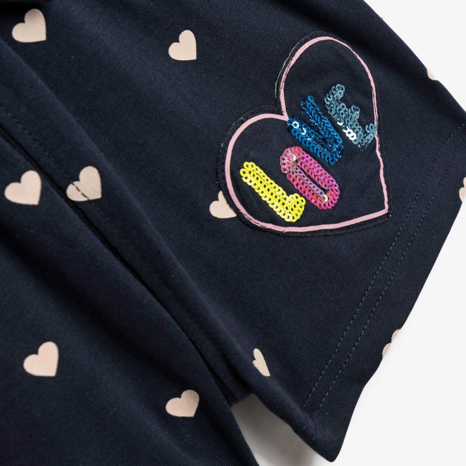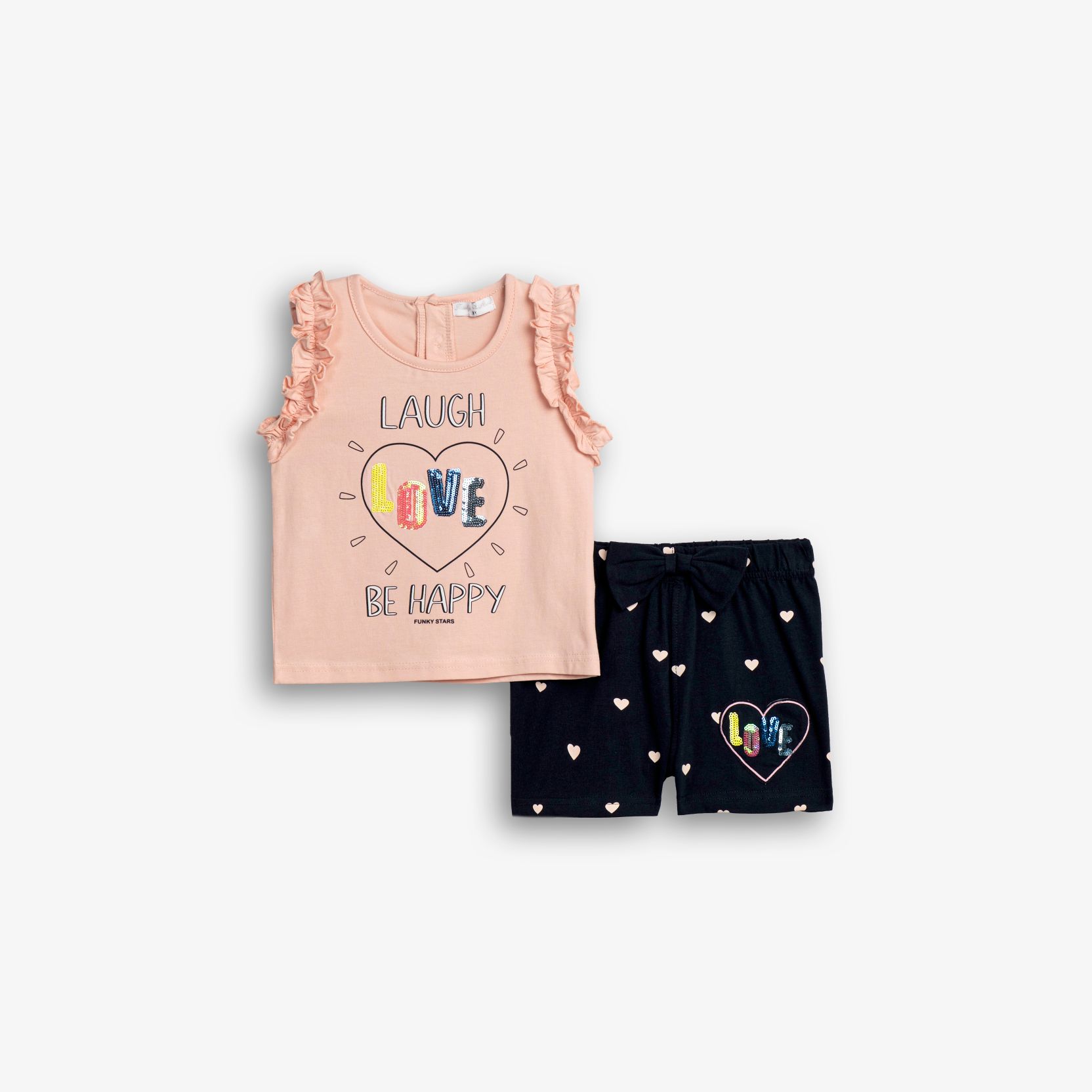 Set blouse jersey lycra with printing (love) and shorts with printing allover in color pink powder/blue for girls 1-6 years