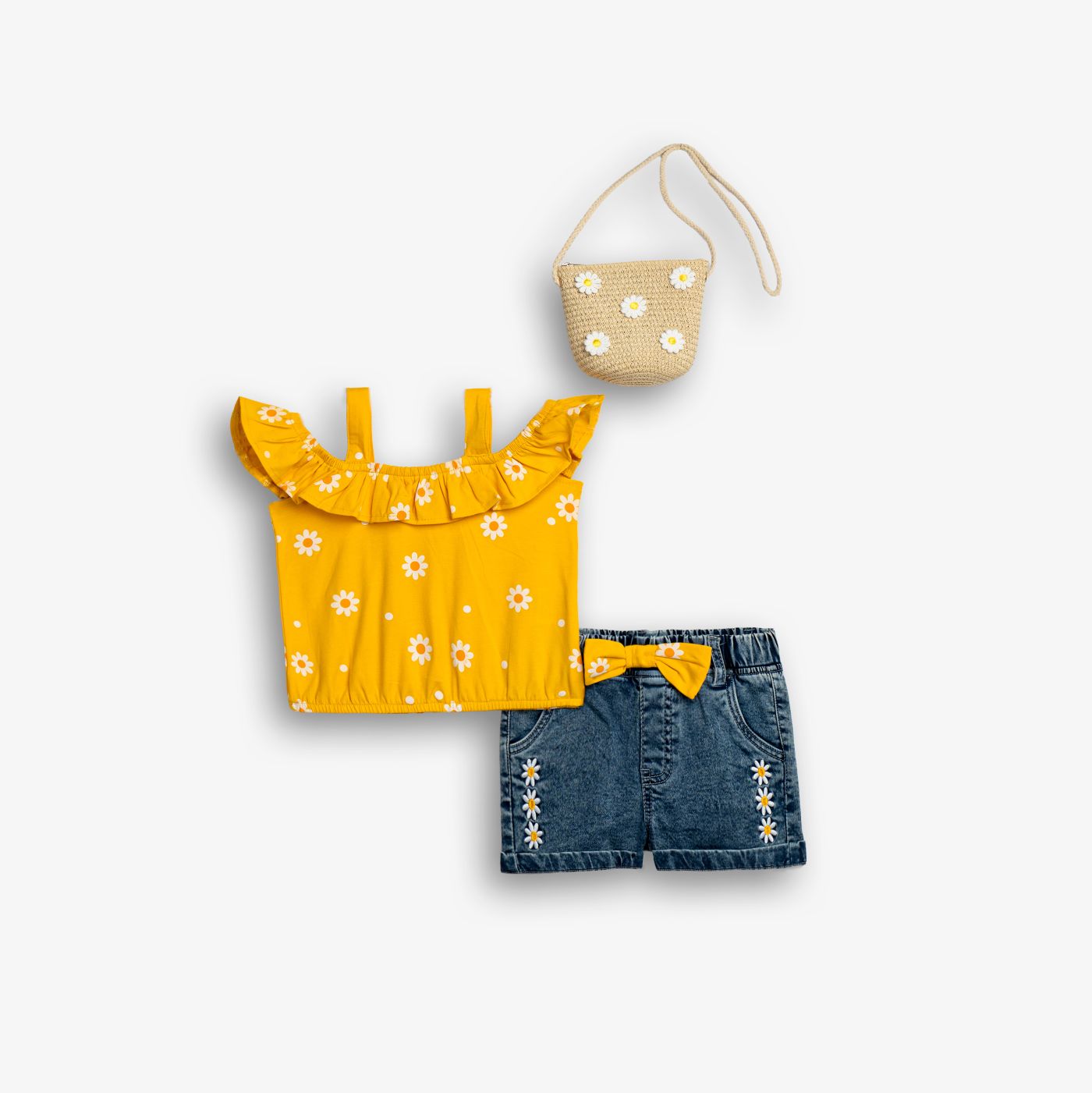 Set blouse jersey lycra with printing (flowers) allover and shorts jean lycra in color egg yellow/blue jean for girls 1-6 years