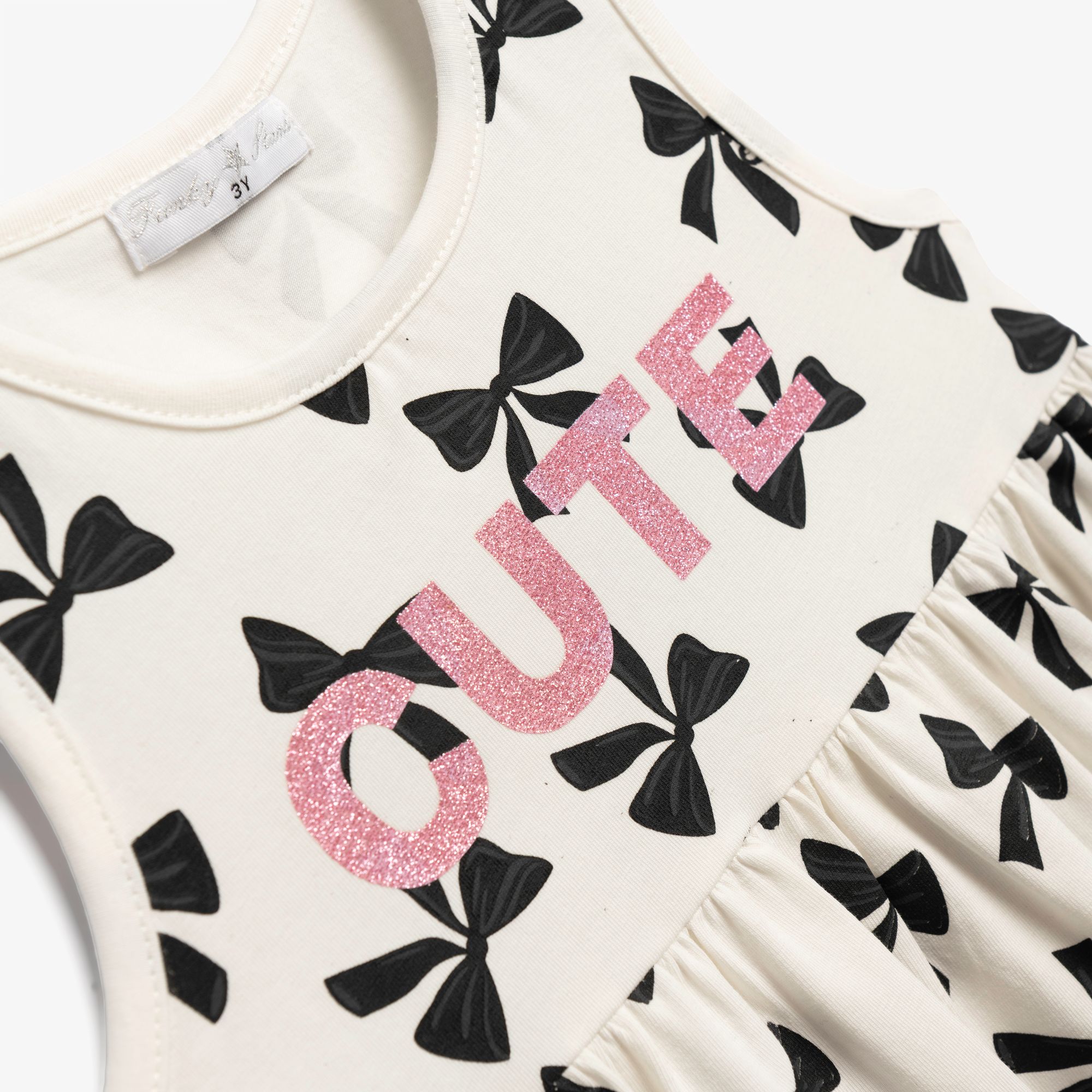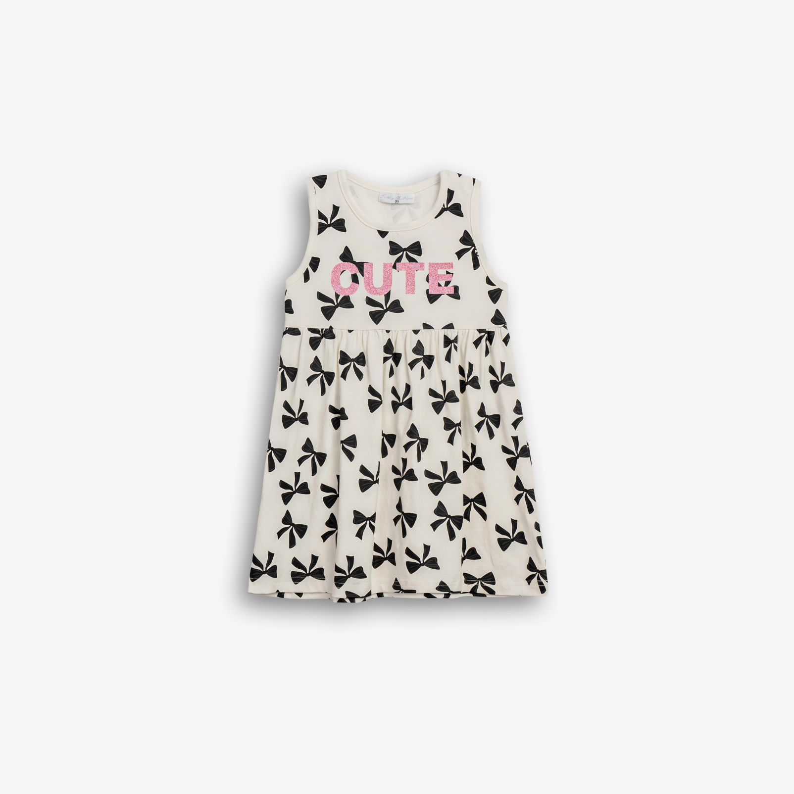 Dress jersey lycra with printing (ribbons) allover in color ecru for girls 1-6 years