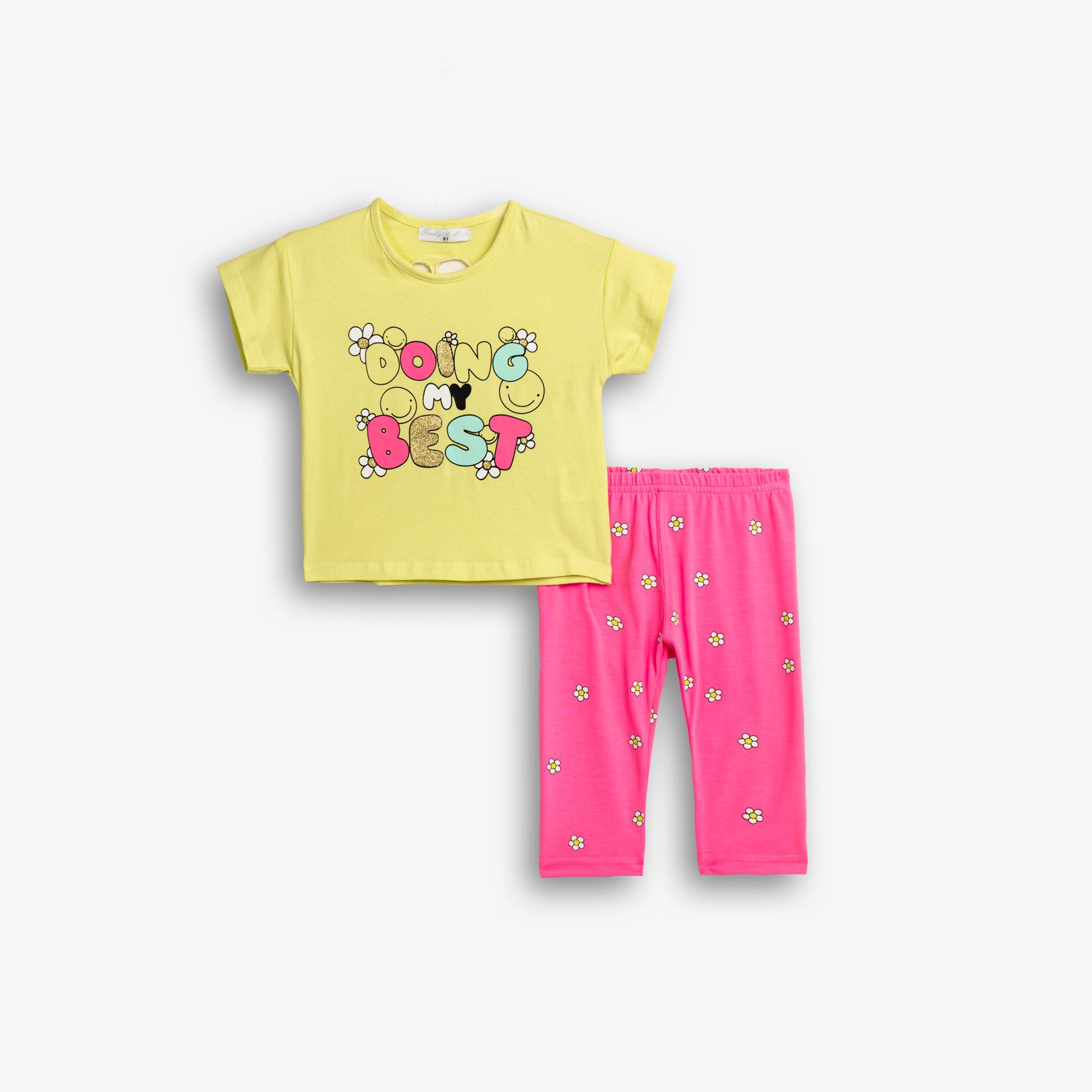 Set blouse with printing (doing my best) and leggings capri jersey with printing allover in color sunny yellow/fluorescent pink for girls 1-6 years