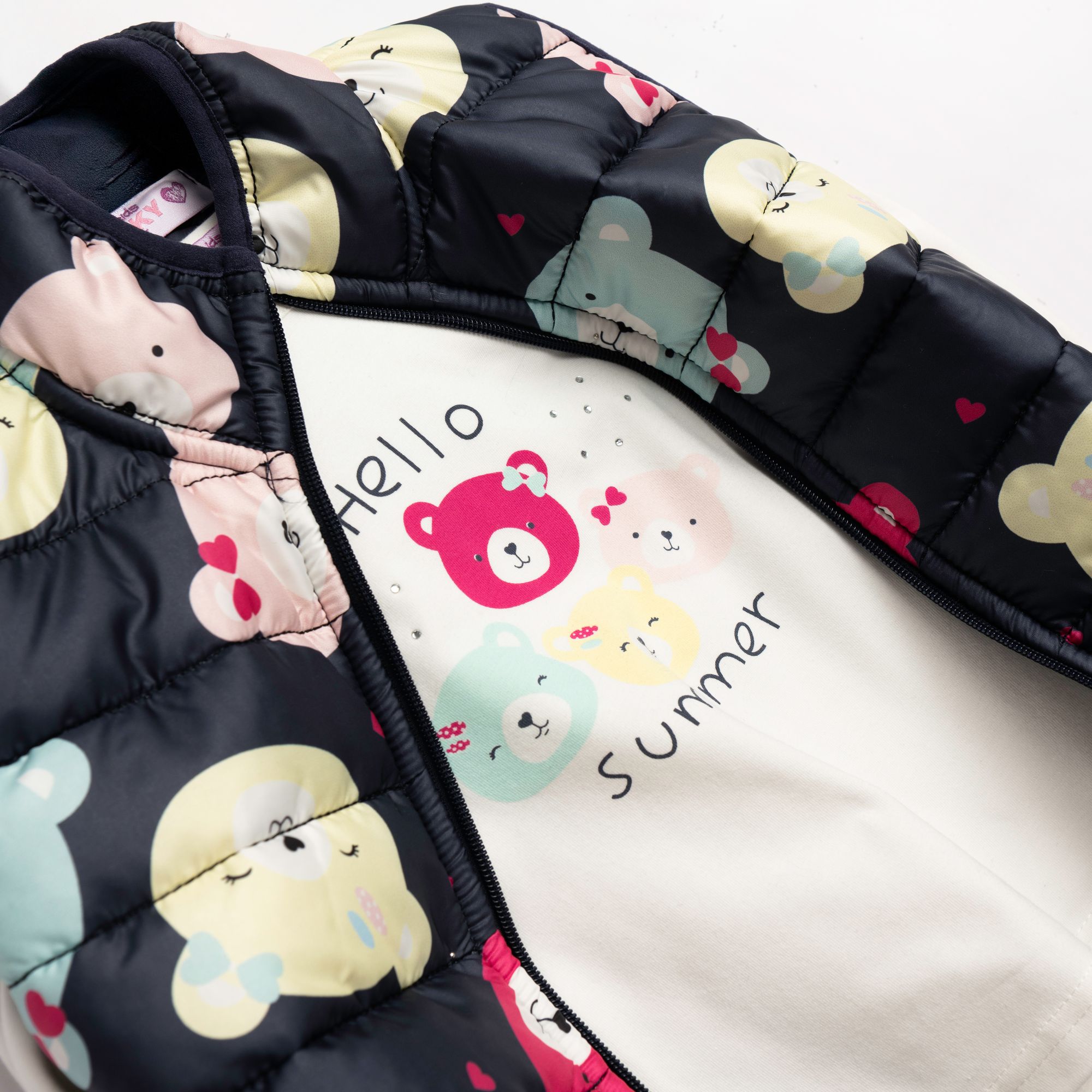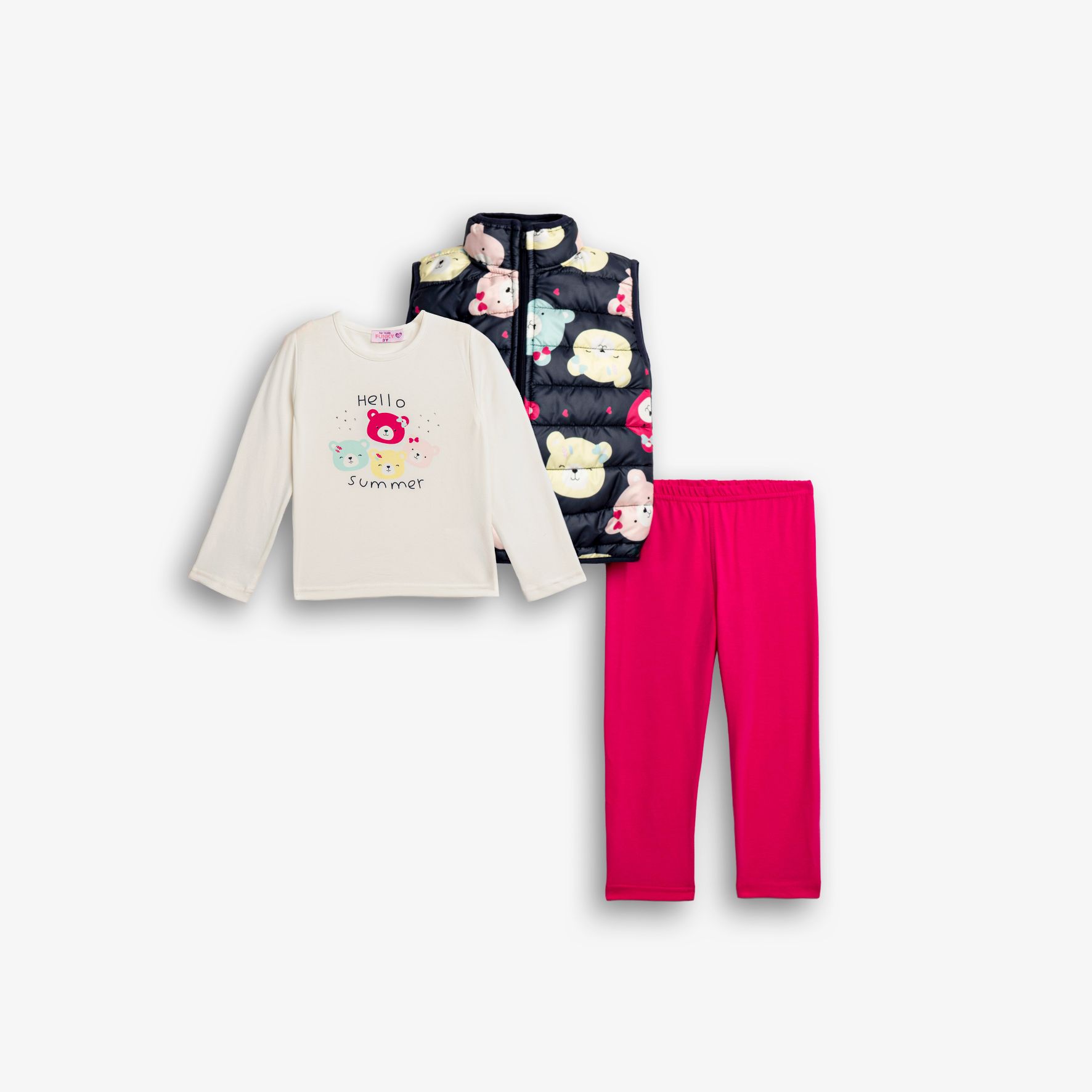 Set 3pcs jacket sleeveless with printing (teddy bears) allover blouse long-sleeved jersey lycra with printing and leggins long jersey lycra in color blue /ecru/fouchsia for girls 1-6 years