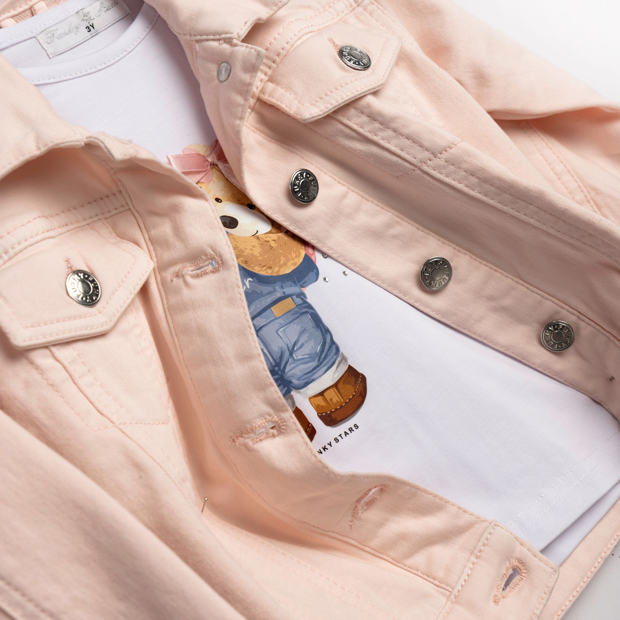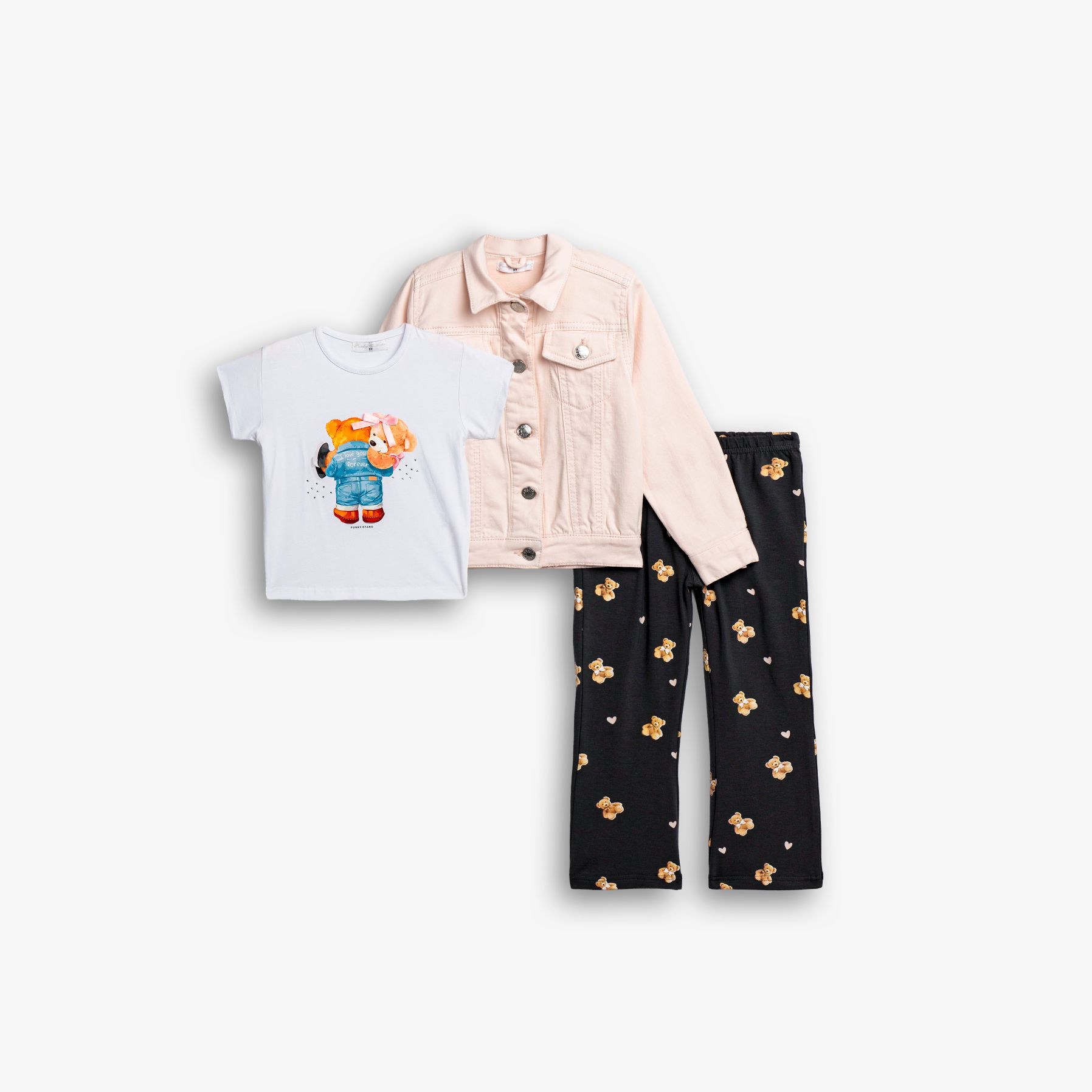 Set 3pcs jacket lycra T-Shirt jersey lycra with printing (teddy bear) and leggins long jersey lycra with printing allover in color pink powder/white/anthracite for girls 1-6 years