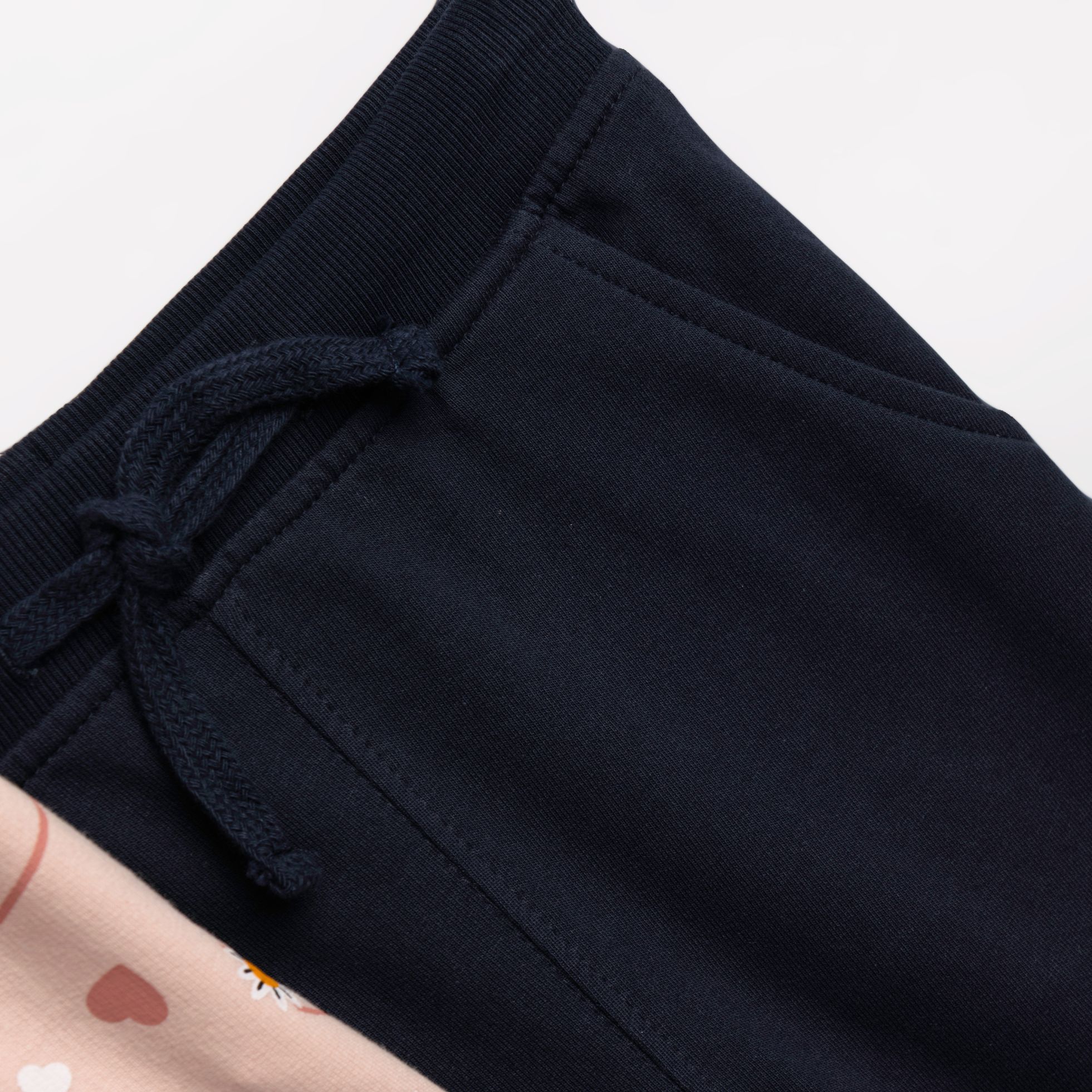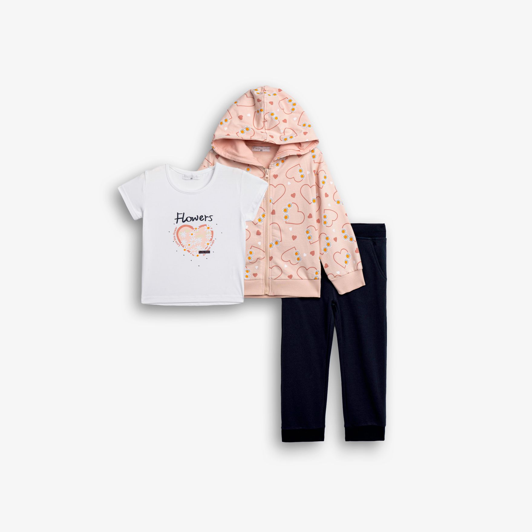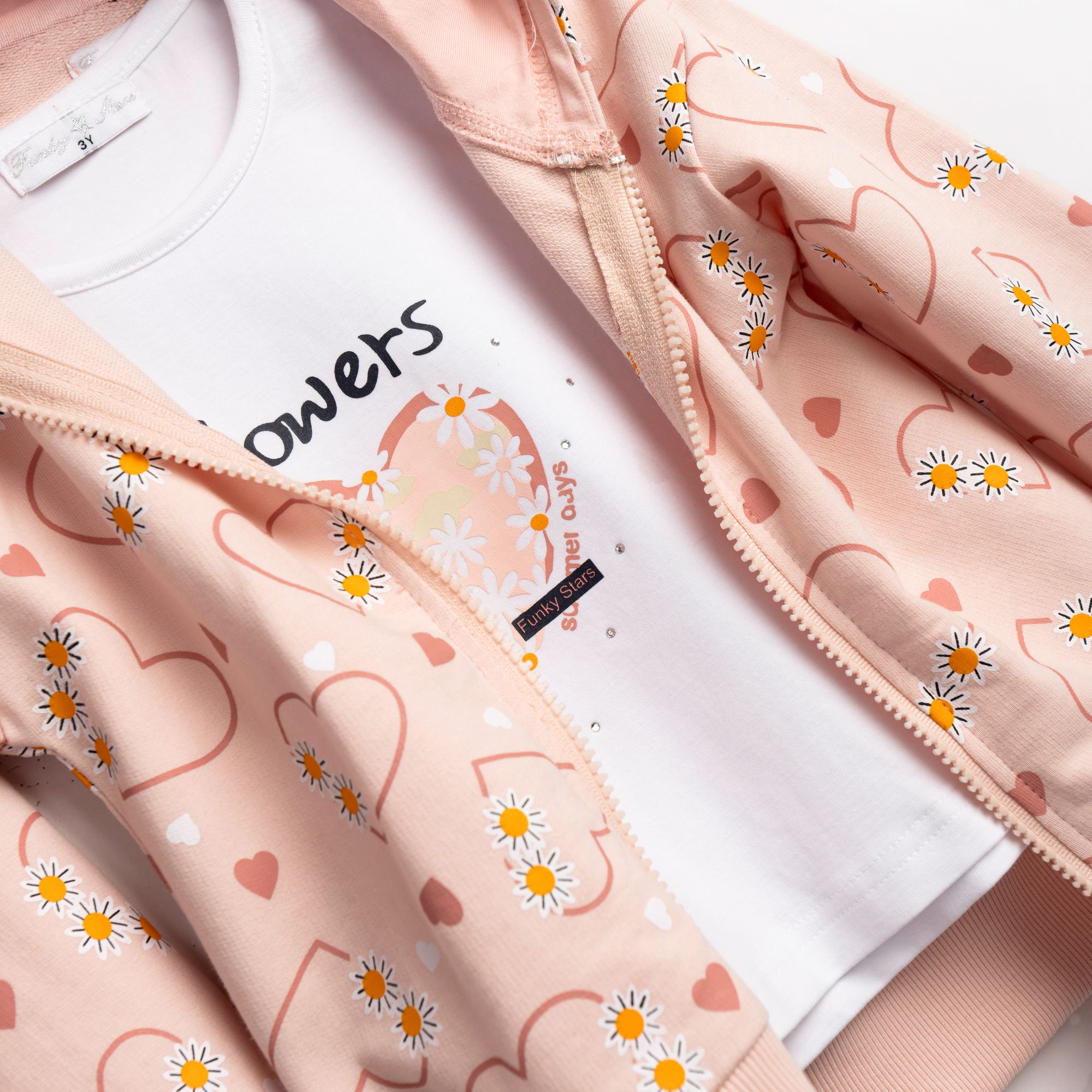 Set 3pcs jacket long-sleeved fleece with printing (hearts and chamomile) allover and T-Shirt jersey lycra with printing and pants fleece unbrushed in color powder pink/white/blue for girls 1-6 years