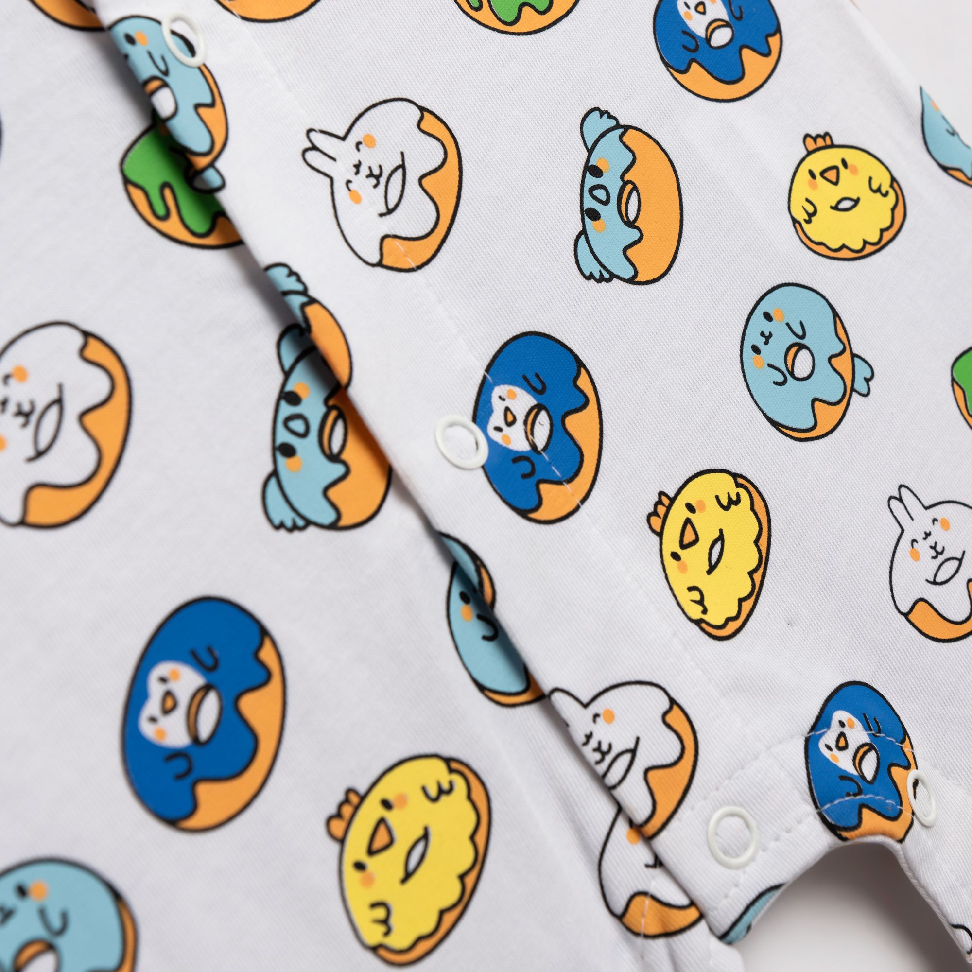 Φορμάκι κοντομάνικο κάλτσα με τύπωμα (ντόνατ ζωάκια) allover σε χρώμα λευκό για αγόρι βρεφανάπτυξη