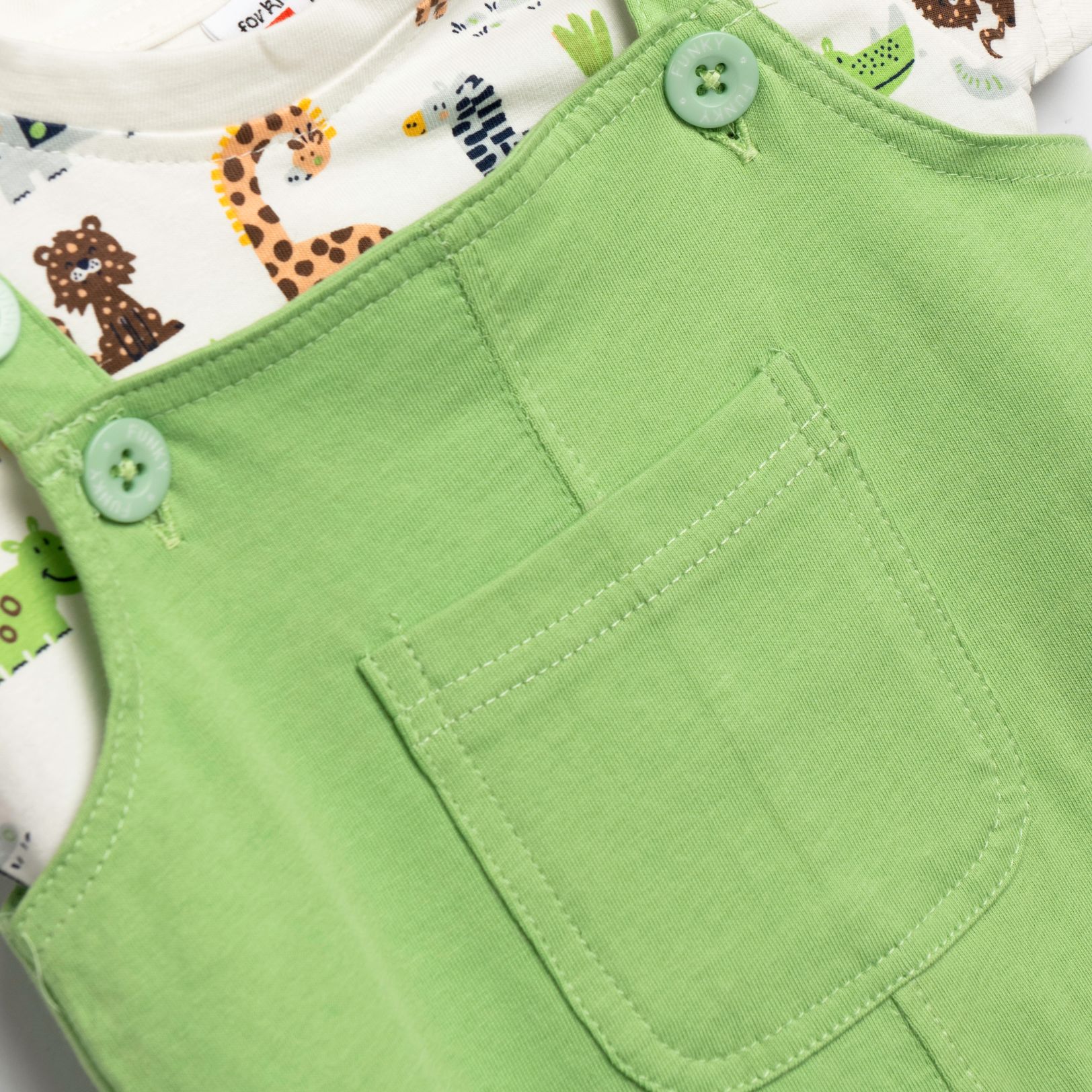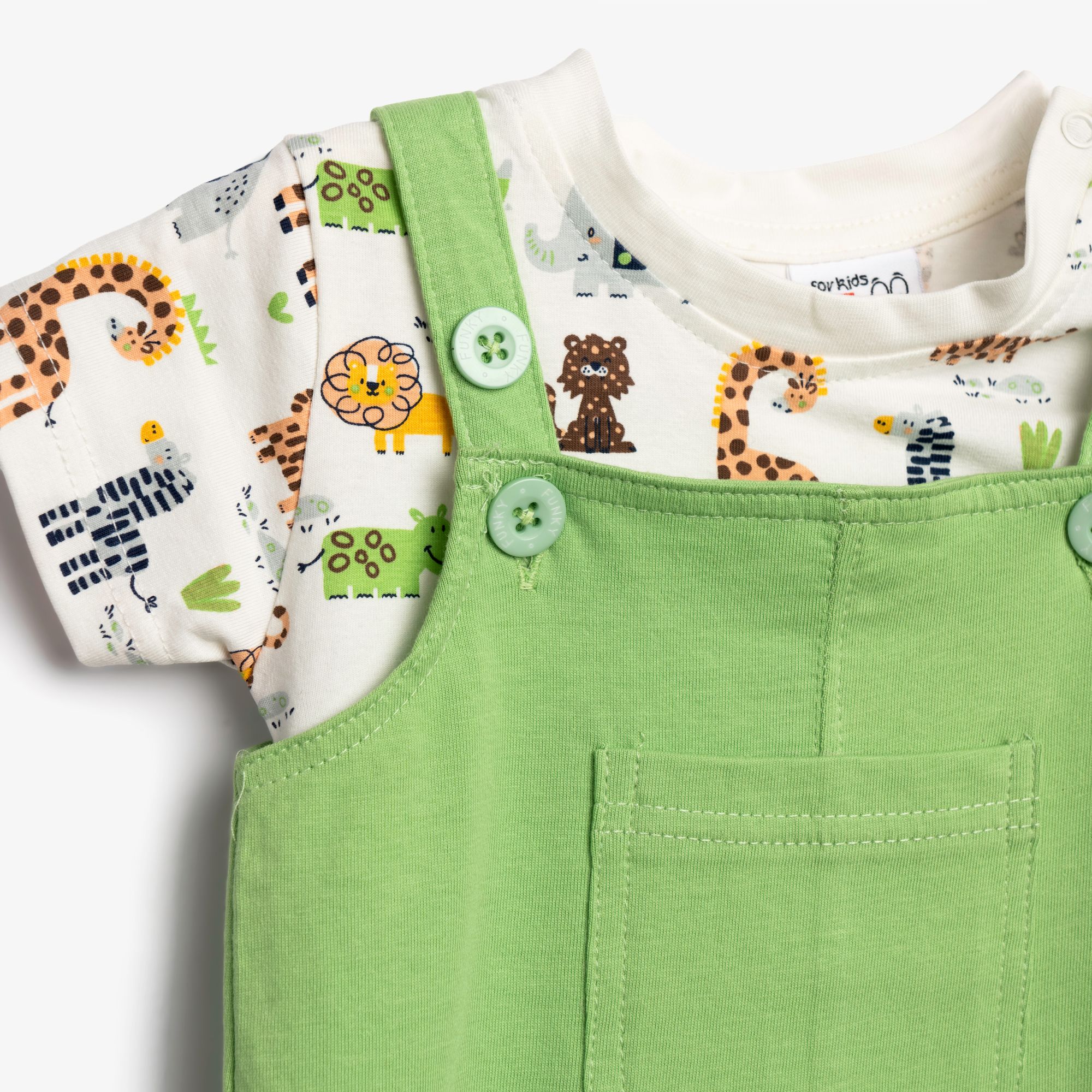 Σετ μπλούζα με τύπωμα (ζωάκια) και σαλοπέτα σε χρώμα εκρού allover-φωτεινό γρασίδι για βρεφανάπτυξη αγόρι