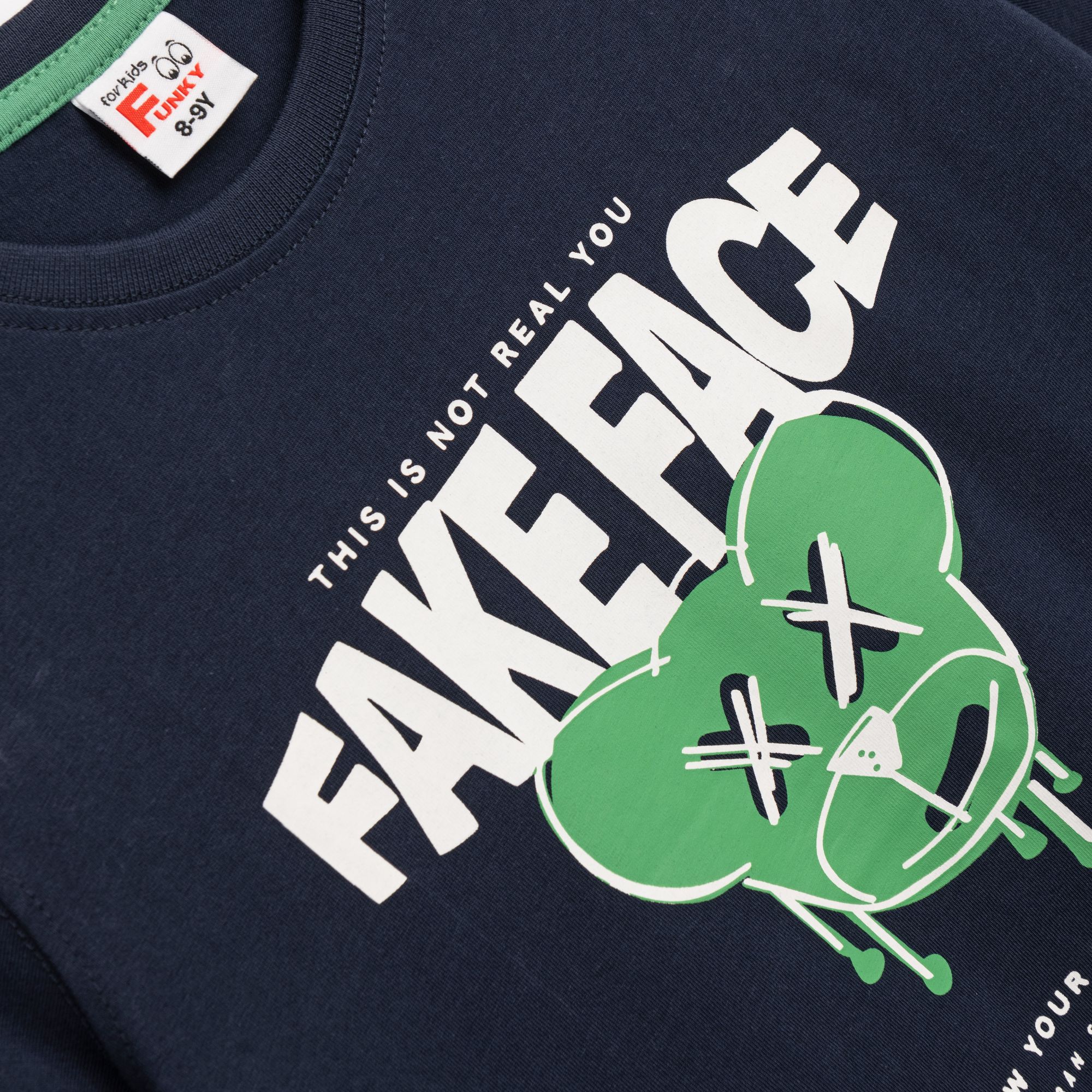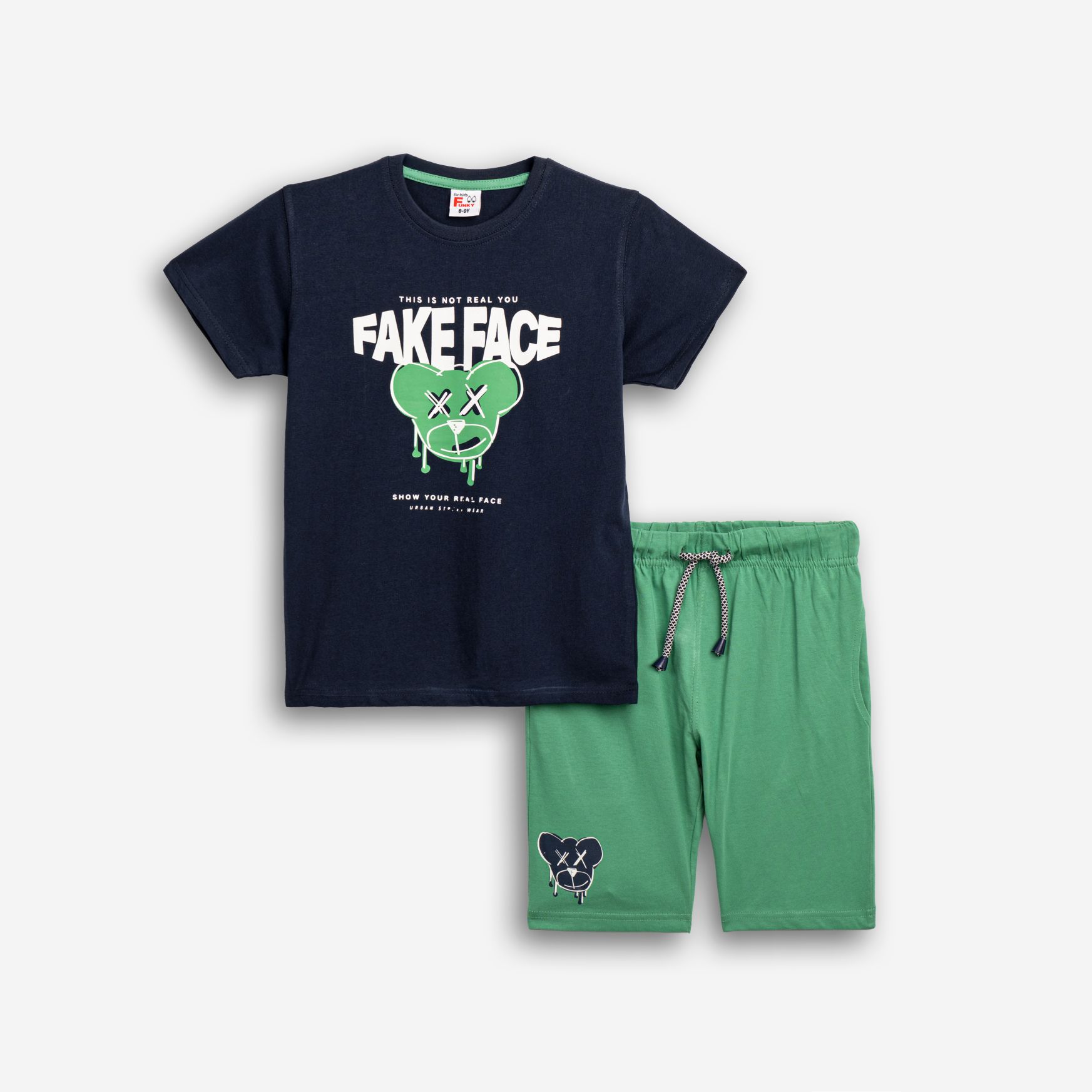 Σετ μακό κοντομάνικη μπλούζα με τύπωμα (fake face) και βερμούδα με τύπωμα σε χρώμα μπλέ/lepreshaun για αγόρι 6-16 ετών