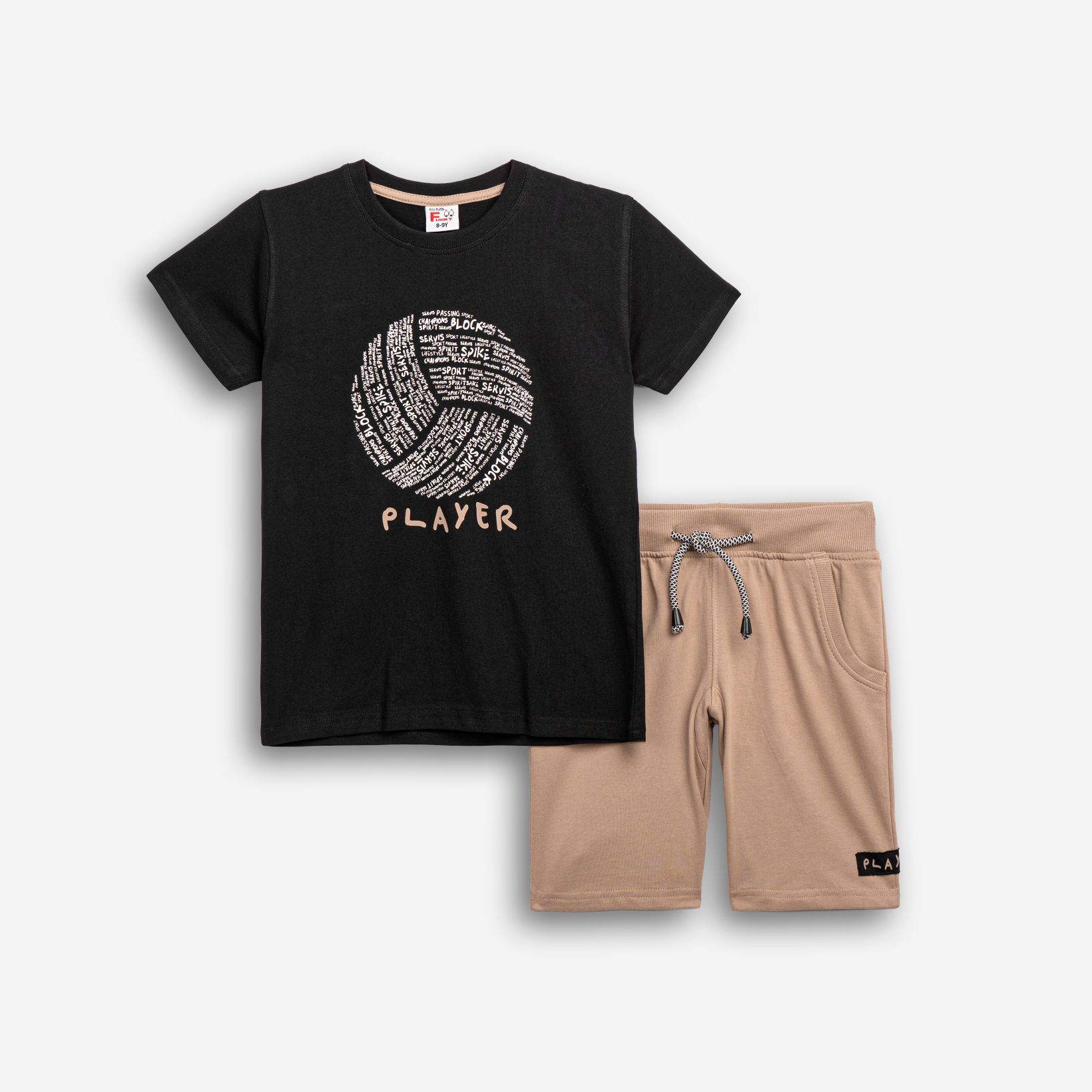 Σετ κοντομάνικη μπλούζα με τύπωμα (volley player) και βερμούδα φούτερ με τύπωμα σε χρώμα μαύρο/αμύγδαλο για αγόρι 6-16 ετών