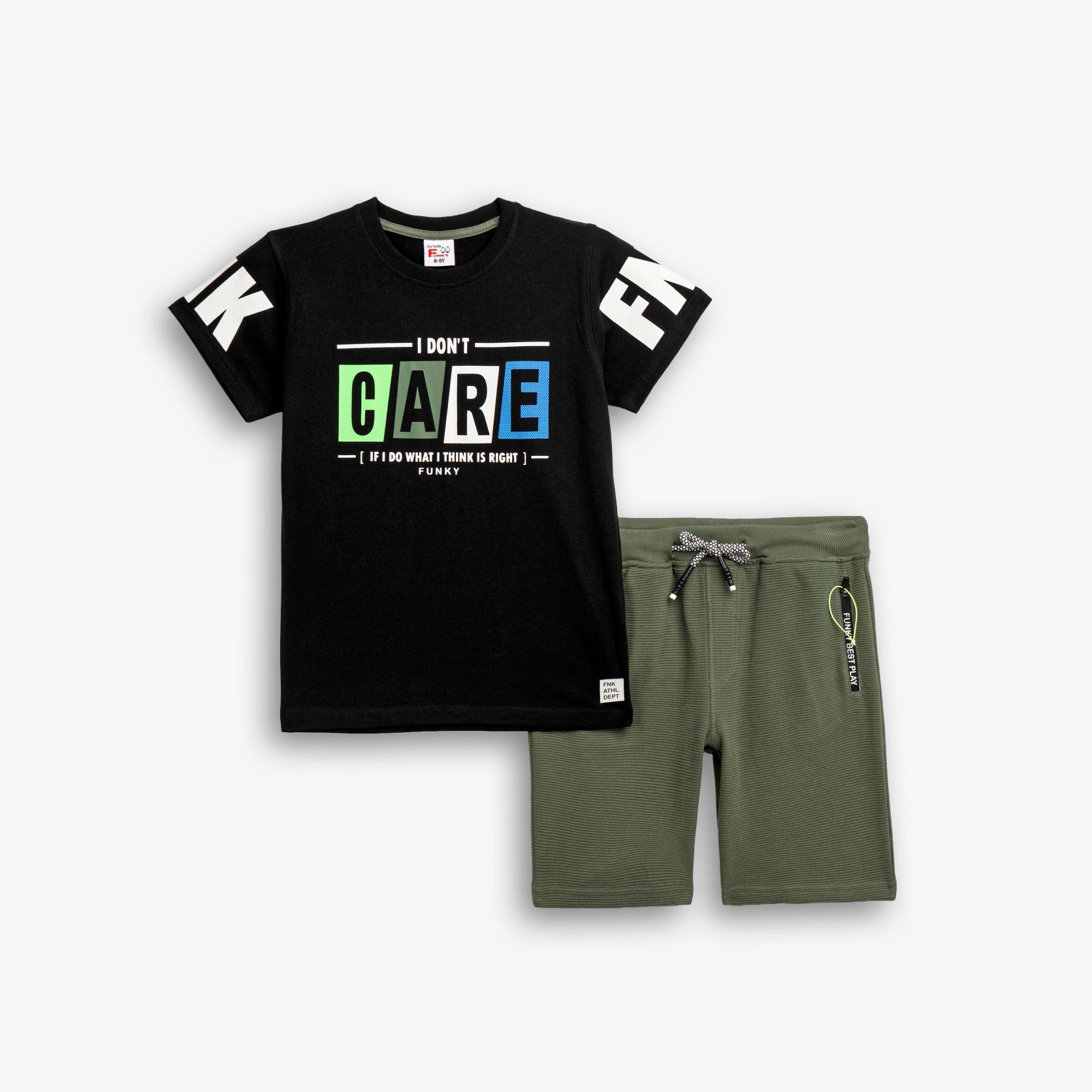 Σετ κοντομάνικη μπλούζα με τύπωμα (I don't care) και βερμούδα σε χρώμα μαύρο/χακί για αγόρι 6-16 ετών