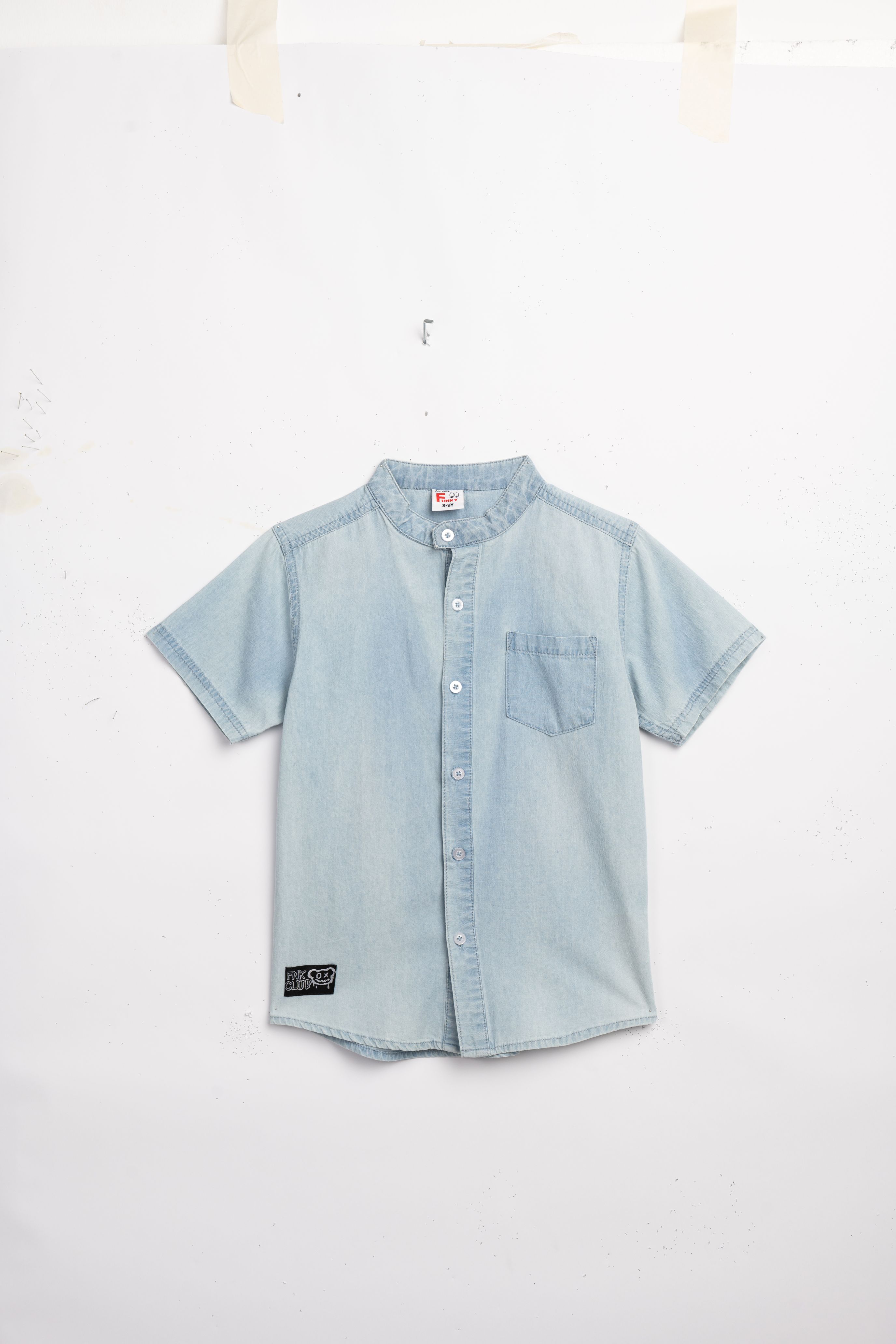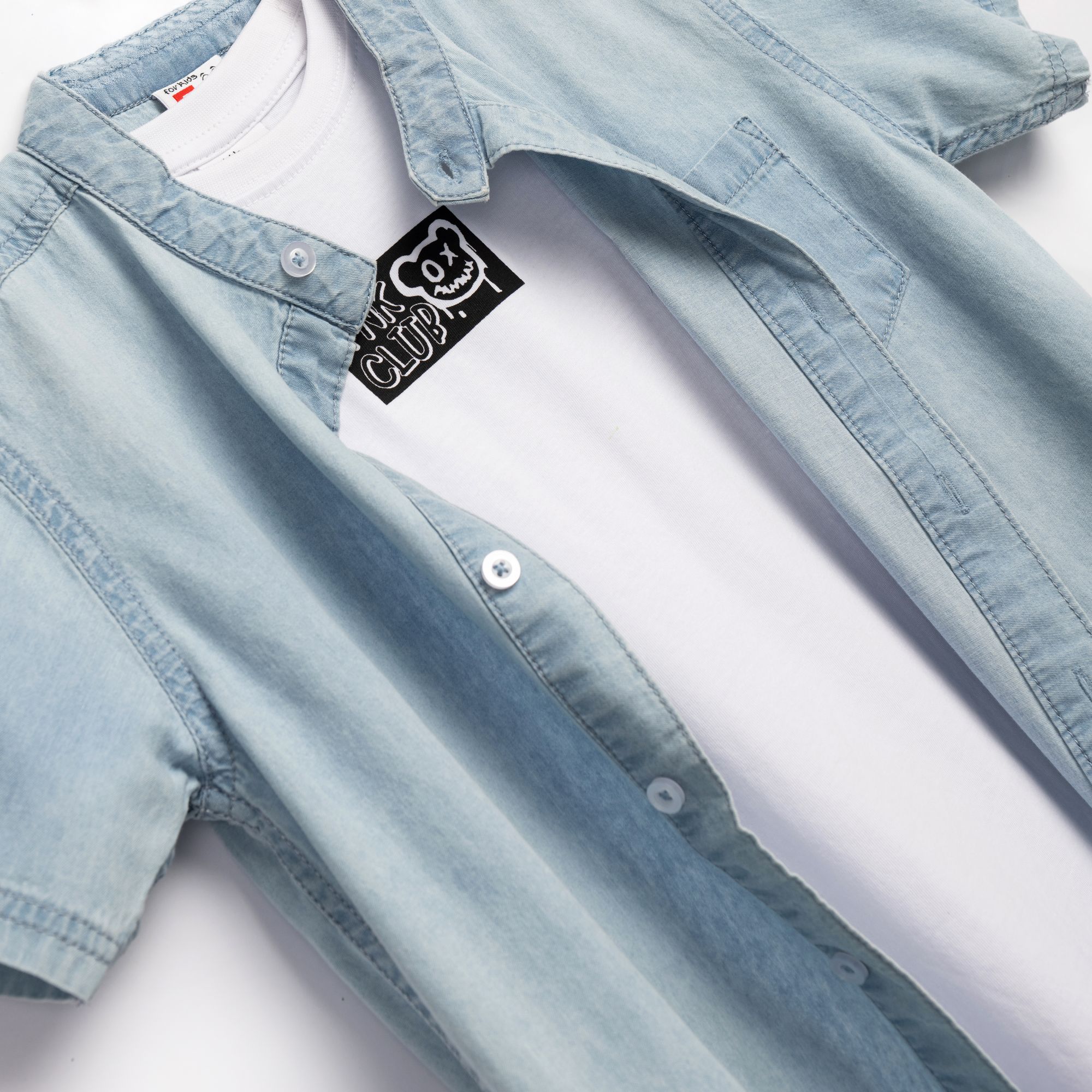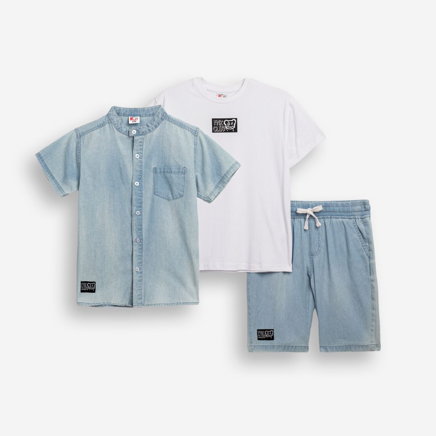 Σετ 3 τεμάχια πουκάμισο κοντομάνικο τζίν μαλακό και μπλούζα κοντομάνικη κάλτσα και βερμούδα τζίν μαλακό σε χρώμα τύπος για αγόρι 6-16 ετών