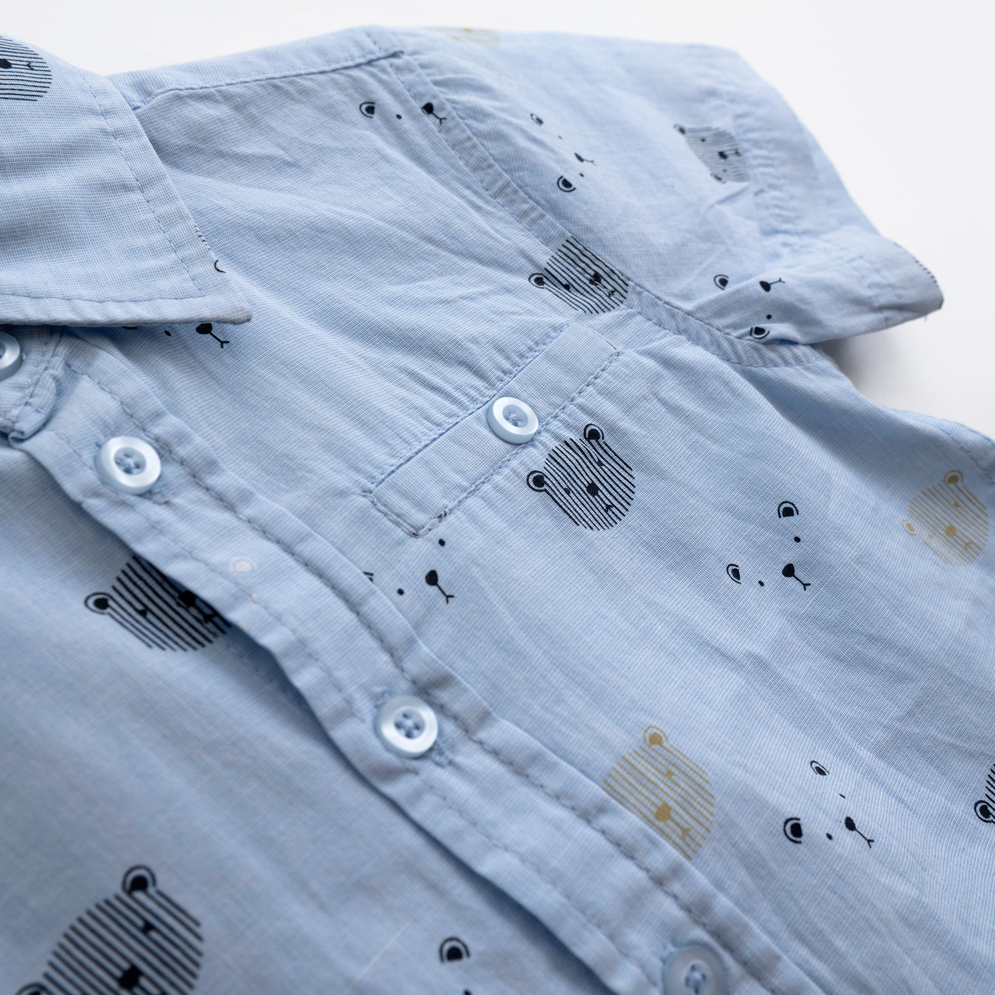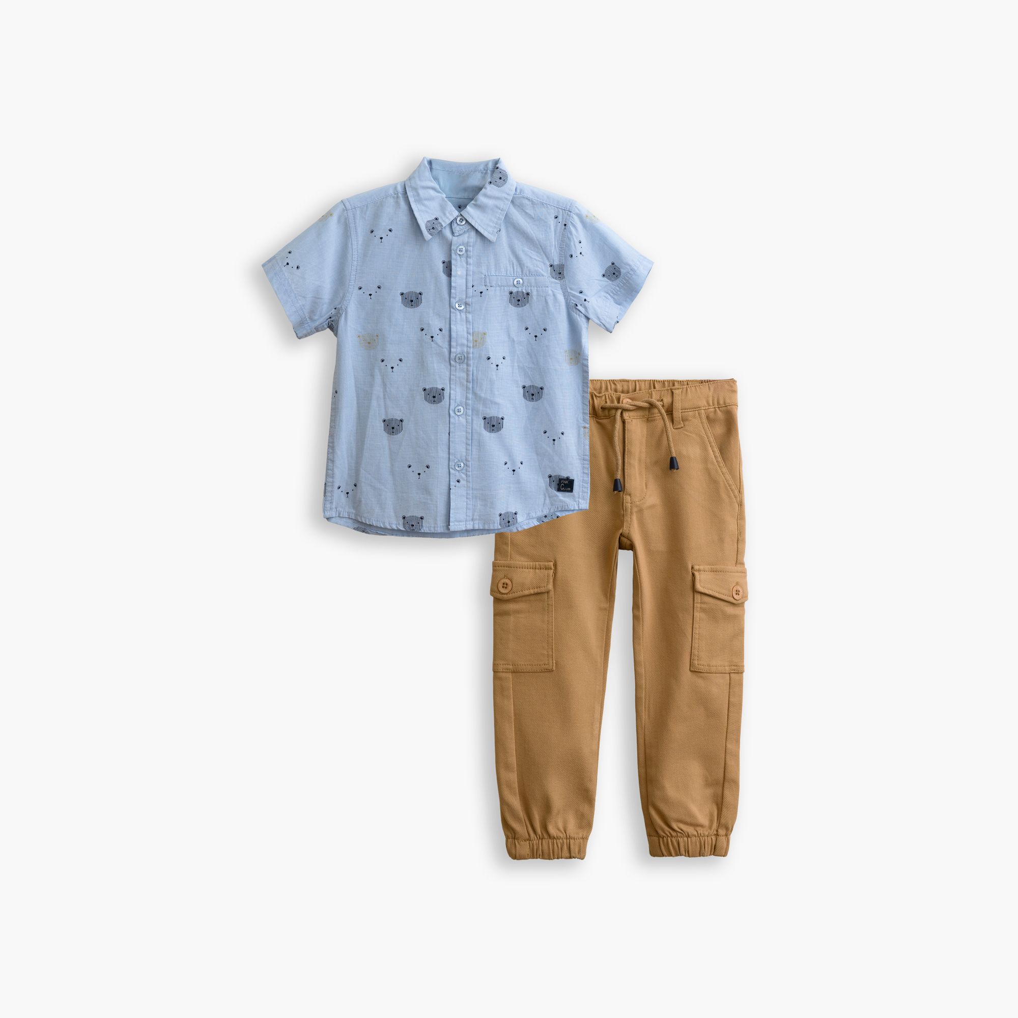 Σετ πουκάμισο κοντομάνικο με τύπωμα (αρκουδάκια) allover και παντελόνι λύκρα με τσέπες και λάστιχο σε χρώμα γαλάζιο/άμμος για αγόρι 1-6 ετών