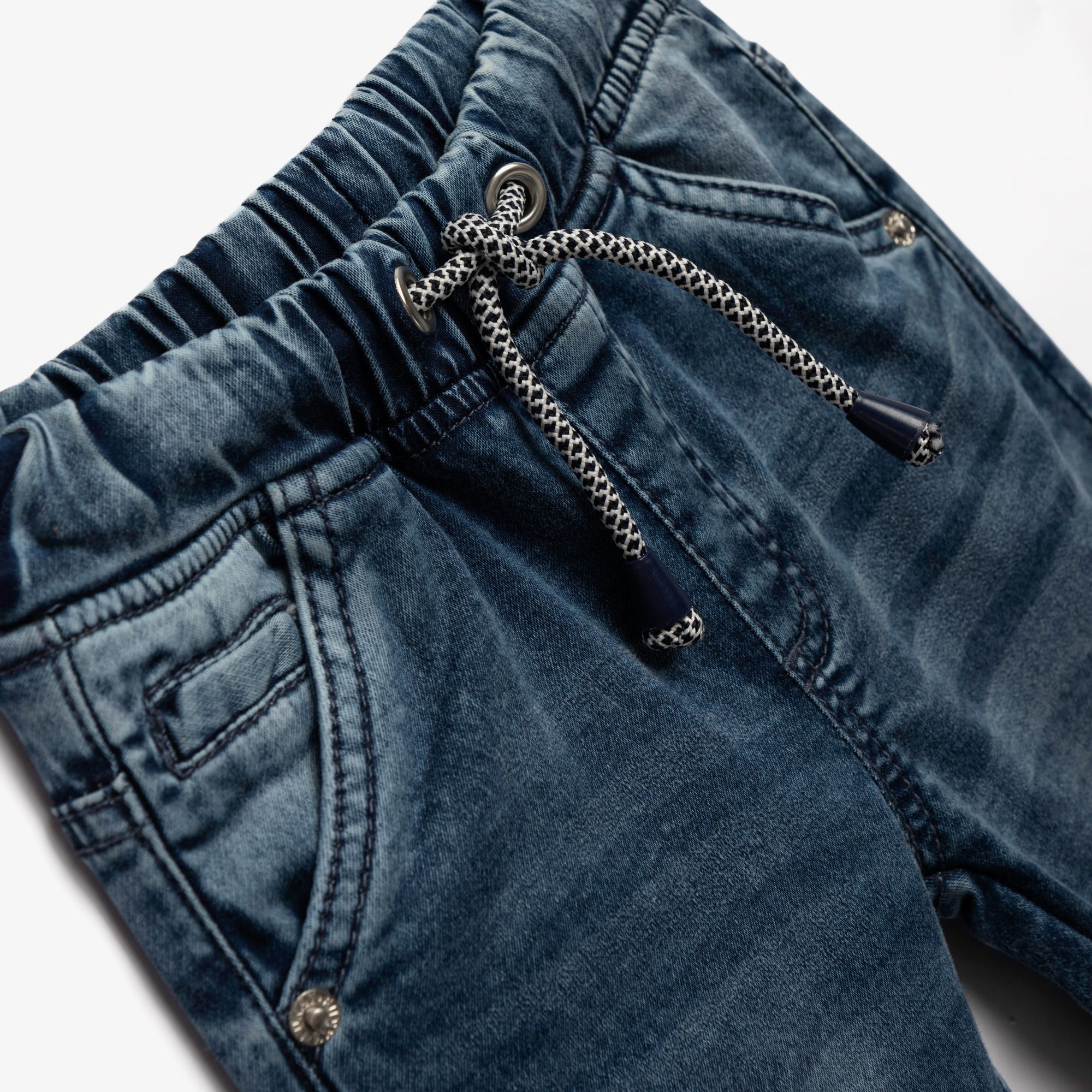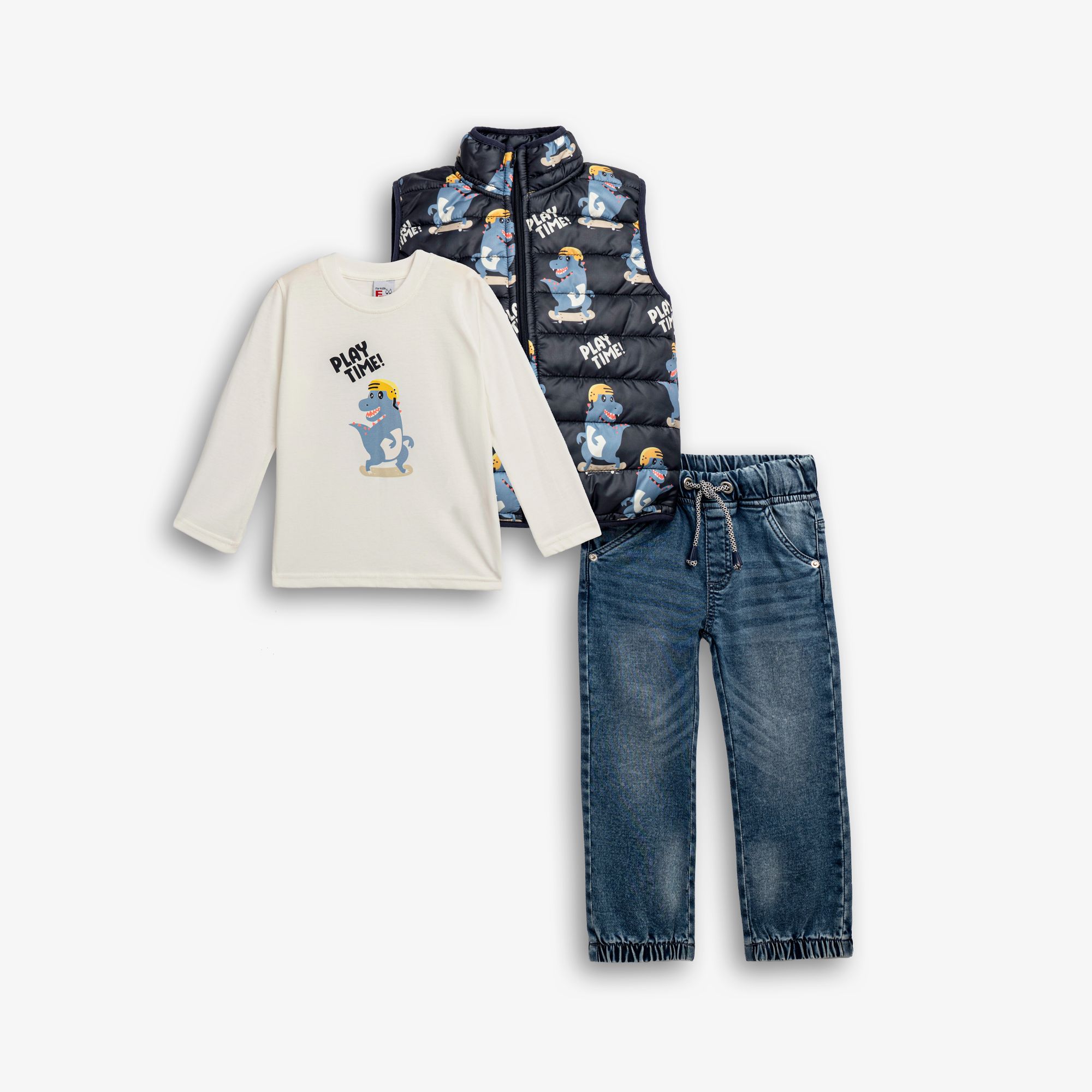 Σετ 3 τεμάχια τζάκετ αμάνικο με τύπωμα (δεινόσαυρους) allover και μπλούζα μακρυμάνικη κάλτσα με τύπωμα και παντελόνι τζίν με λάστιχο σε χρώμα μπλέ/εκρού/μπλέ τζίν για αγόρι 1-6 ετών