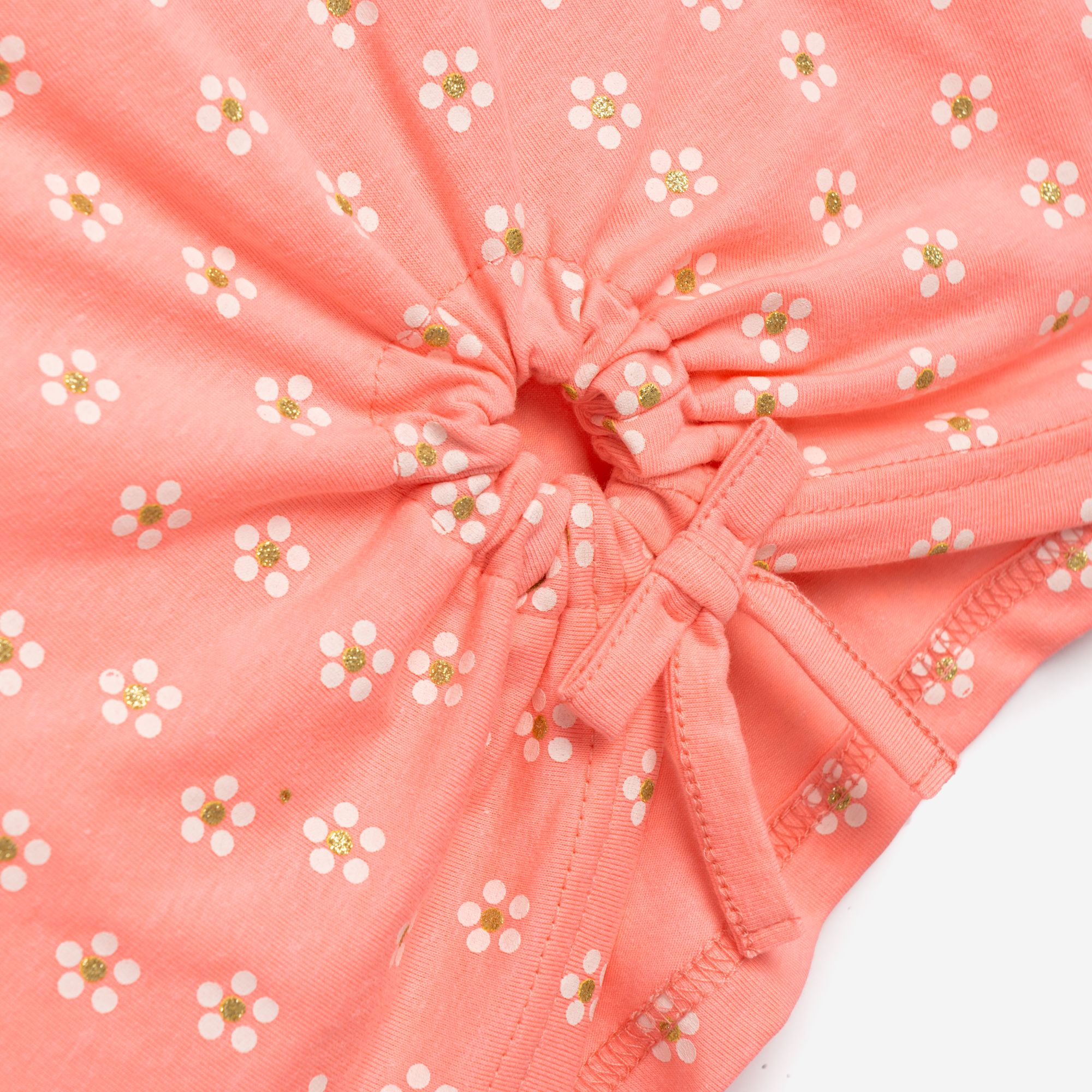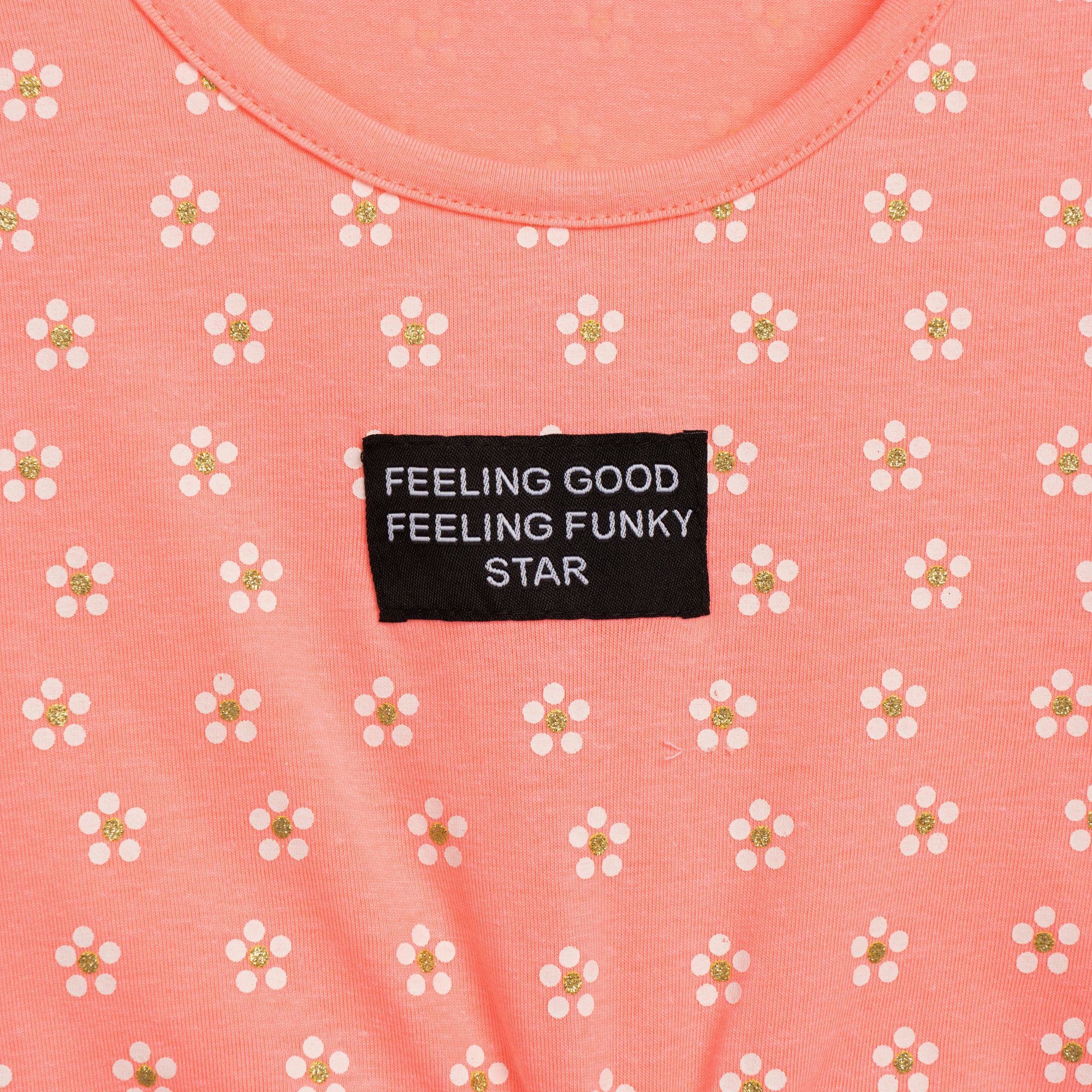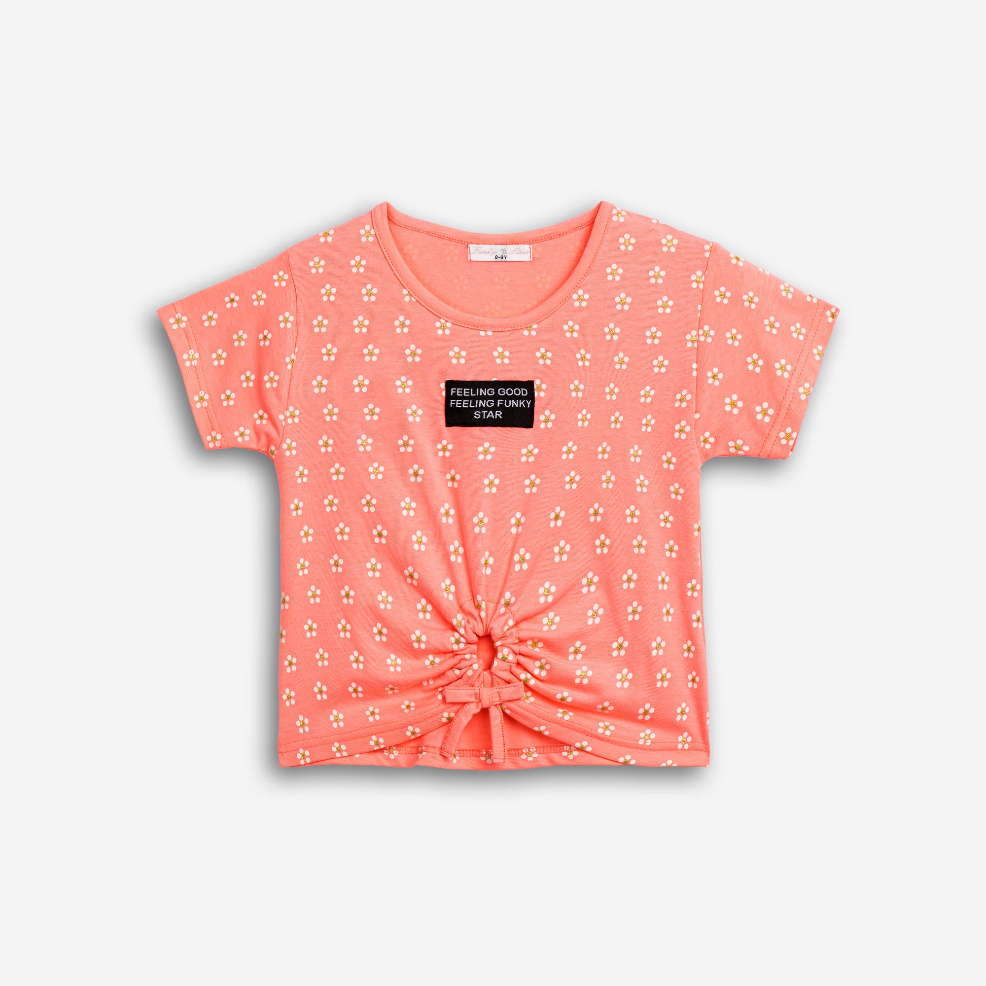 Μπλούζα κοντομάνικη κάλτσα λύκρα με τύπωμα (χαμομήλι) allover και δέσιμο στο κάτω μέρος σε χρώμα φωσφορούχο ανοιχτό σομόν για κορίτσι 6-16 ετών