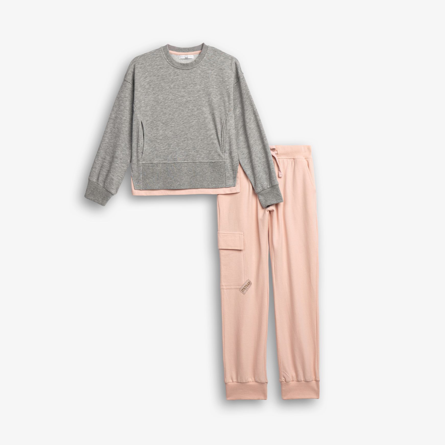 Φόρμα φούτερ με τύπωμα (grow up) και παντελόνι φόρμας με τσέπη και λάστιχο σε χρώμα γκρί μελανζέ/ρόζ πούδρας για κορίτσι 6-16 ετών
