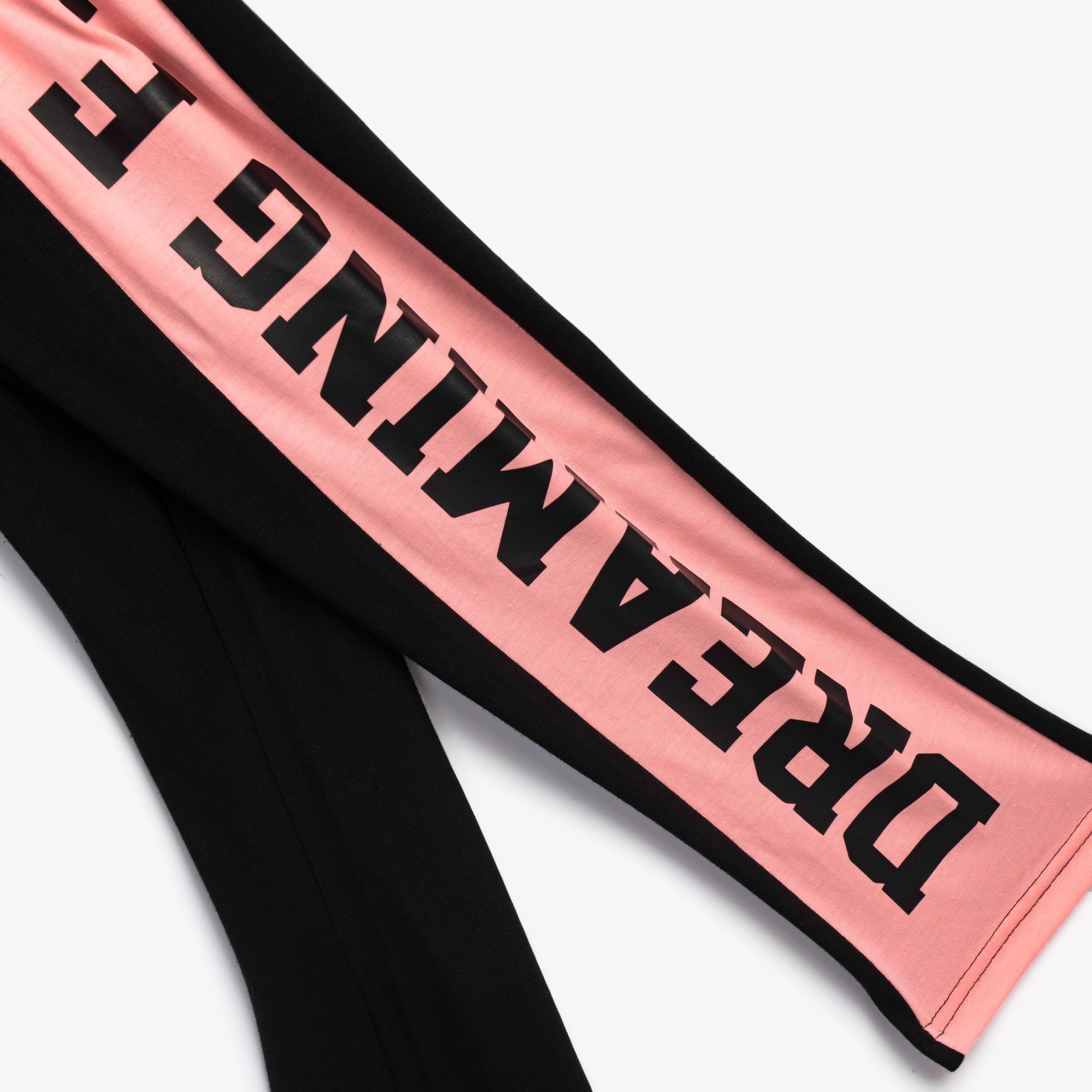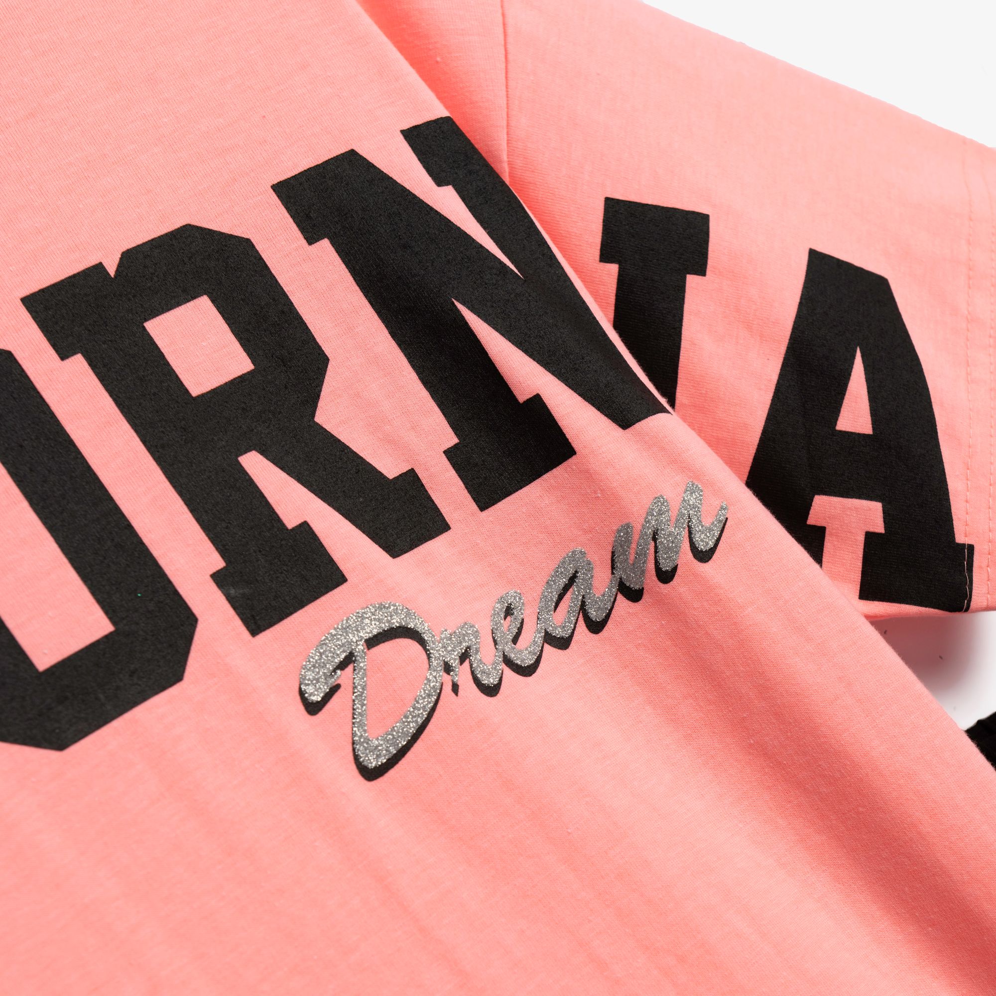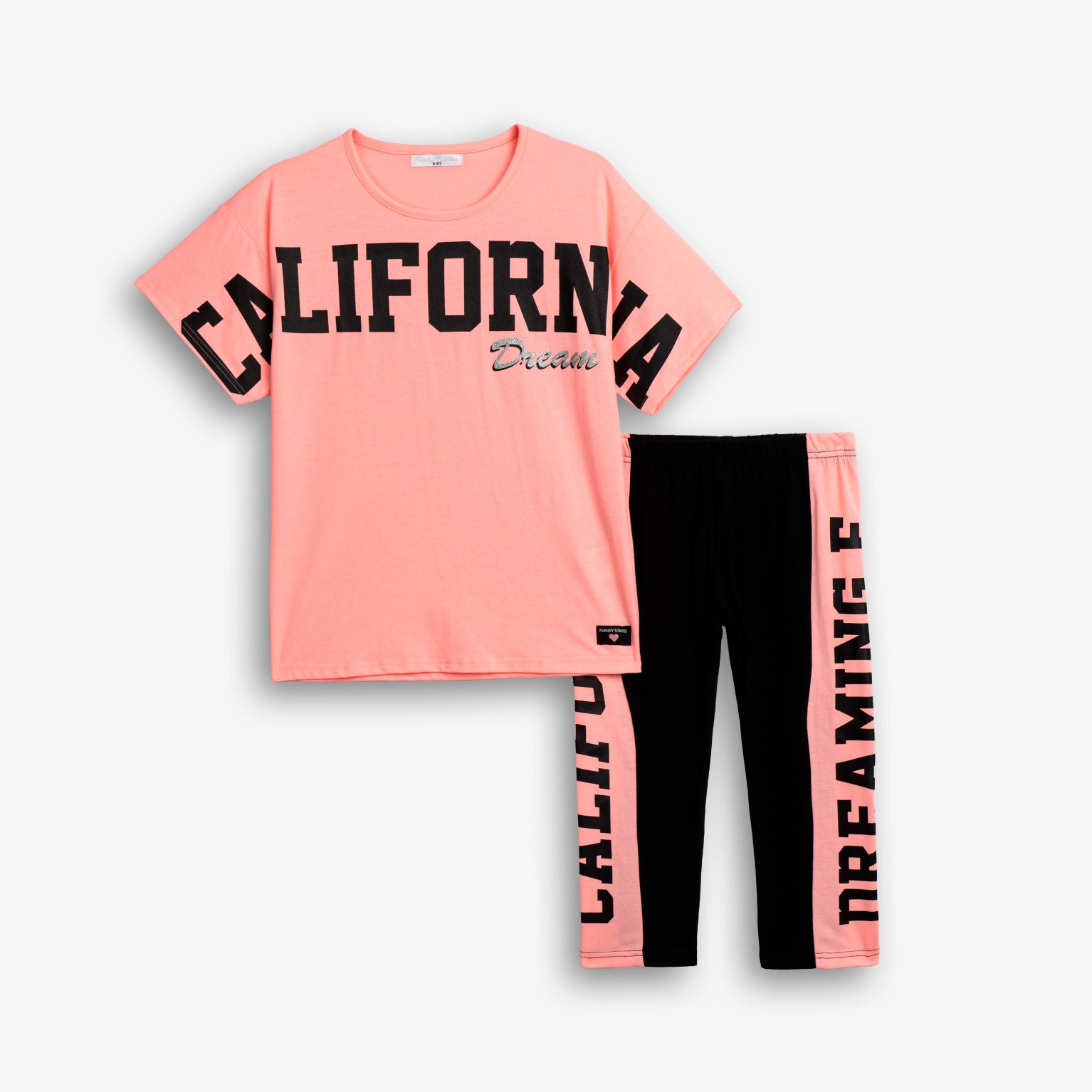 Μπλουζοφόρεμα με τύπωμα (california draming) και κολάν κάλτσα κάπρι λύκρα με τύπωμα σε χρώμα φωσφορύχο ανοιχτό σομόν/μαύρο-φωσφορούχο ανοιχτό σομόν για κορίτσι 6-16 ετών