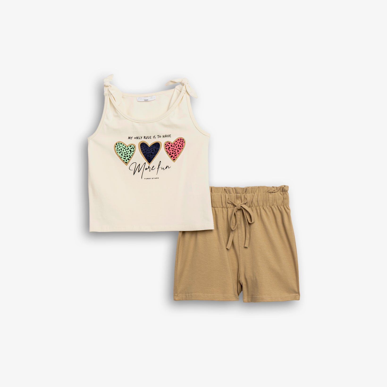 Σετ μπλουζάκι με τύπωμα (καρδιές) και σόρτς κάλτσα λύκρα σε χρώμα εκρού/μόκα για κορίτσι 6-16 ετών