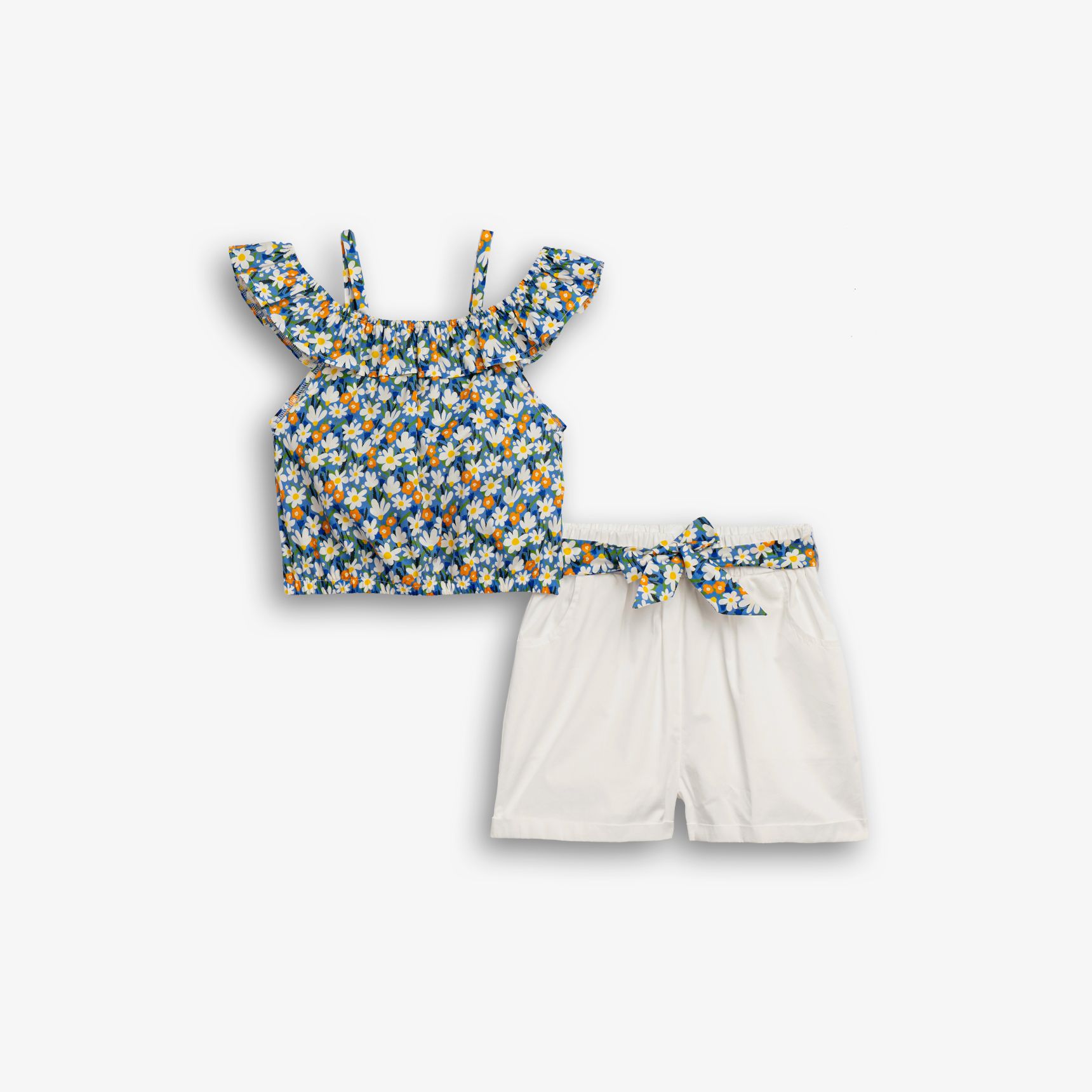 Σετ μπλούζα με τύπωμα (λουλούδια) allover και σόρτς ποπλίνα με ζώνη σε χρώμα τύπος/λευκό για κορίτσι 6-16 ετών