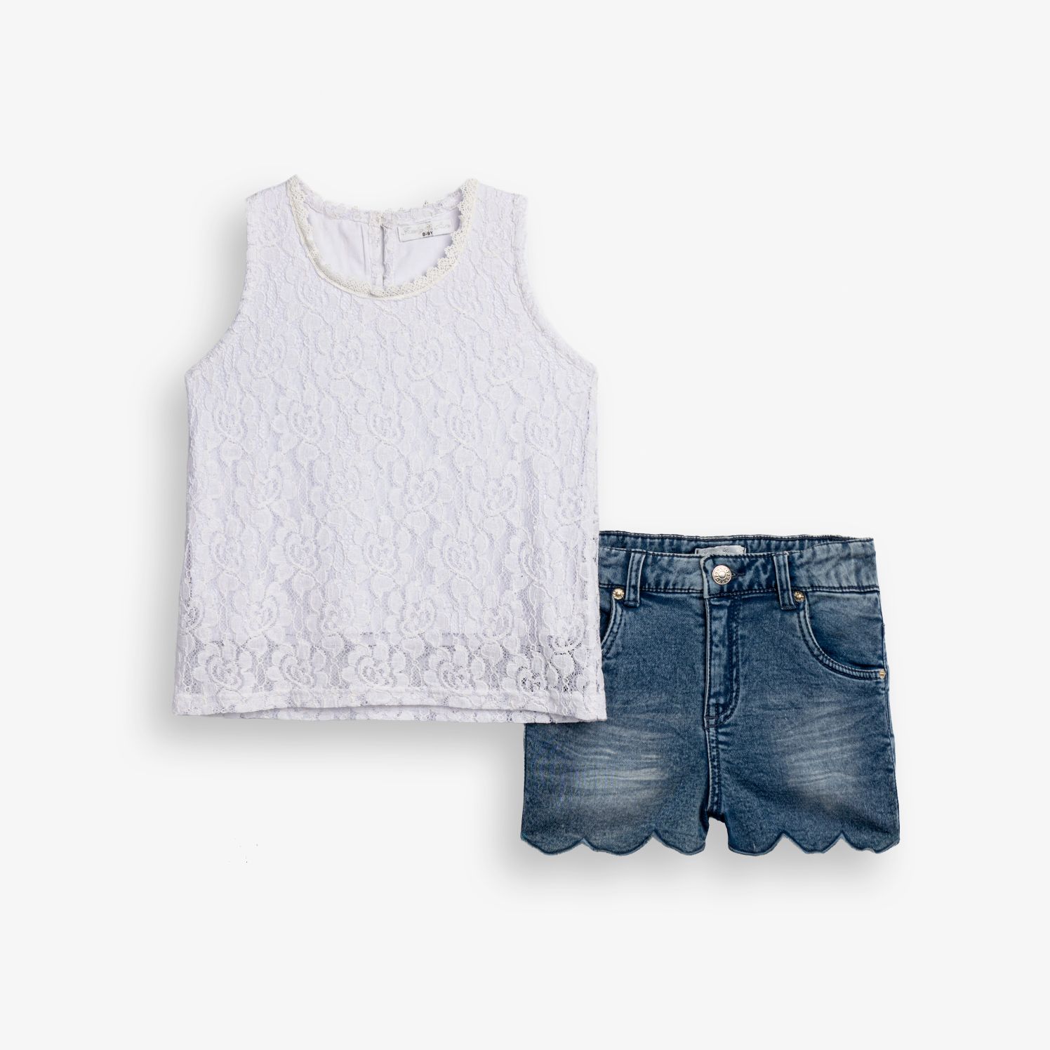 Σετ μπλούζα δαντέλα και κάλτσα λύκρα και σόρτς τζίν λύκρα σε χρώμα λευκό/μπλέ τζίν για κορίτσι 6-16 ετών