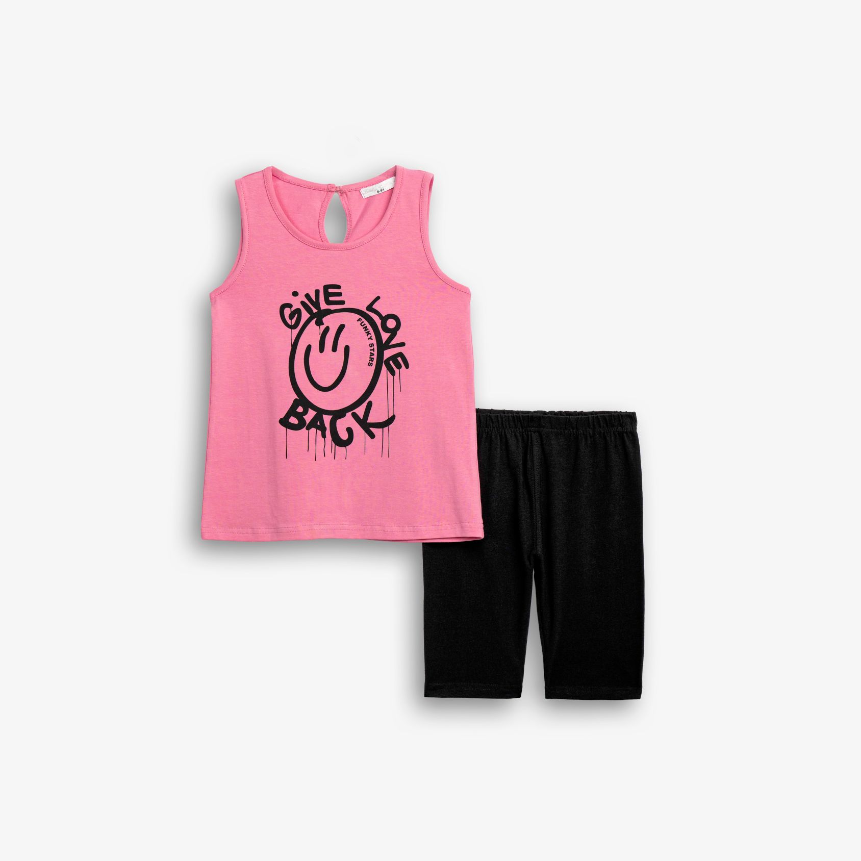 Σετ μπλούζα κάλτσα λύκρα με τύπωμα (give love back) και κολάν ποδηλατικό με τύπωμα σε χρώμα candy pink/μαύρο για κορίτσι 6-16 ετών