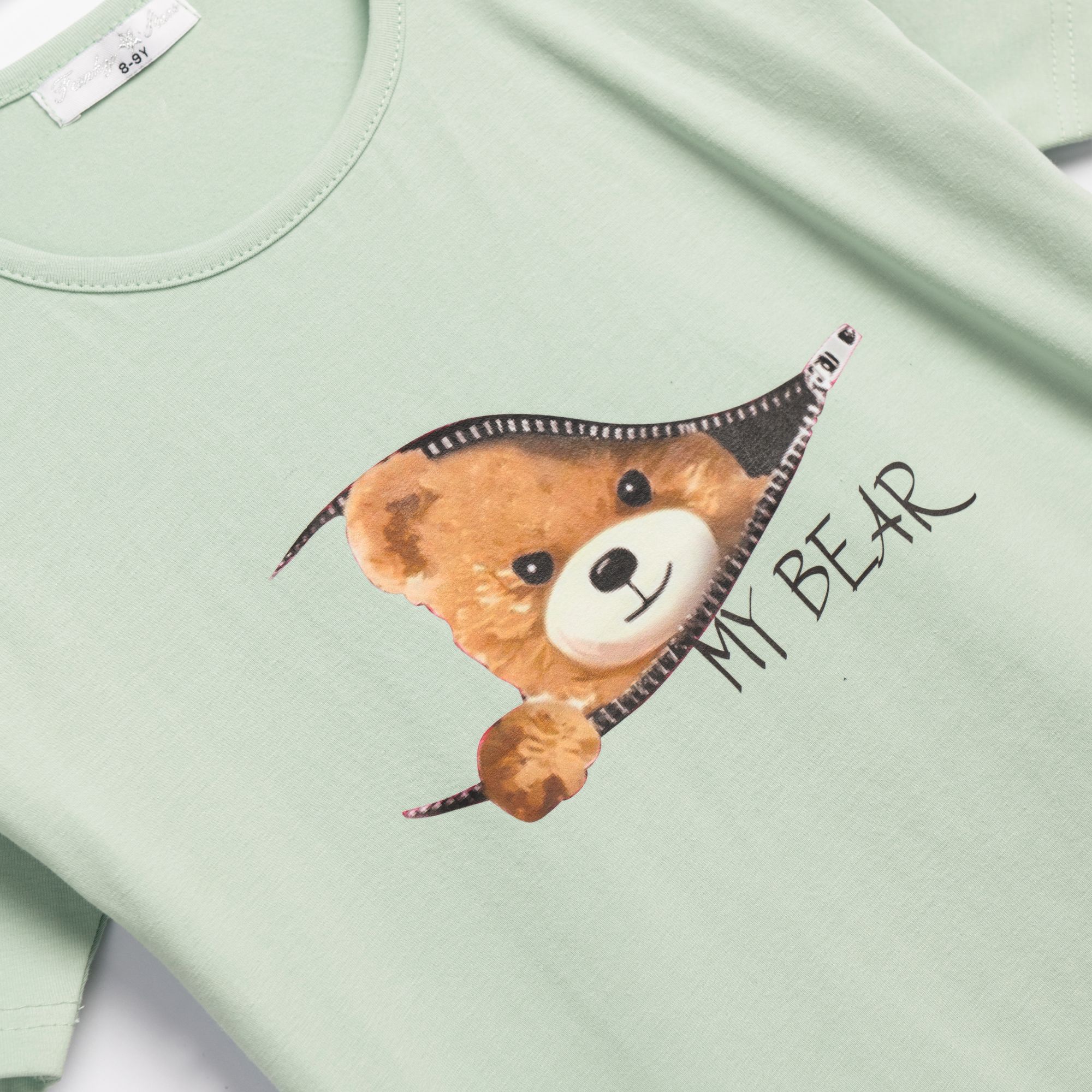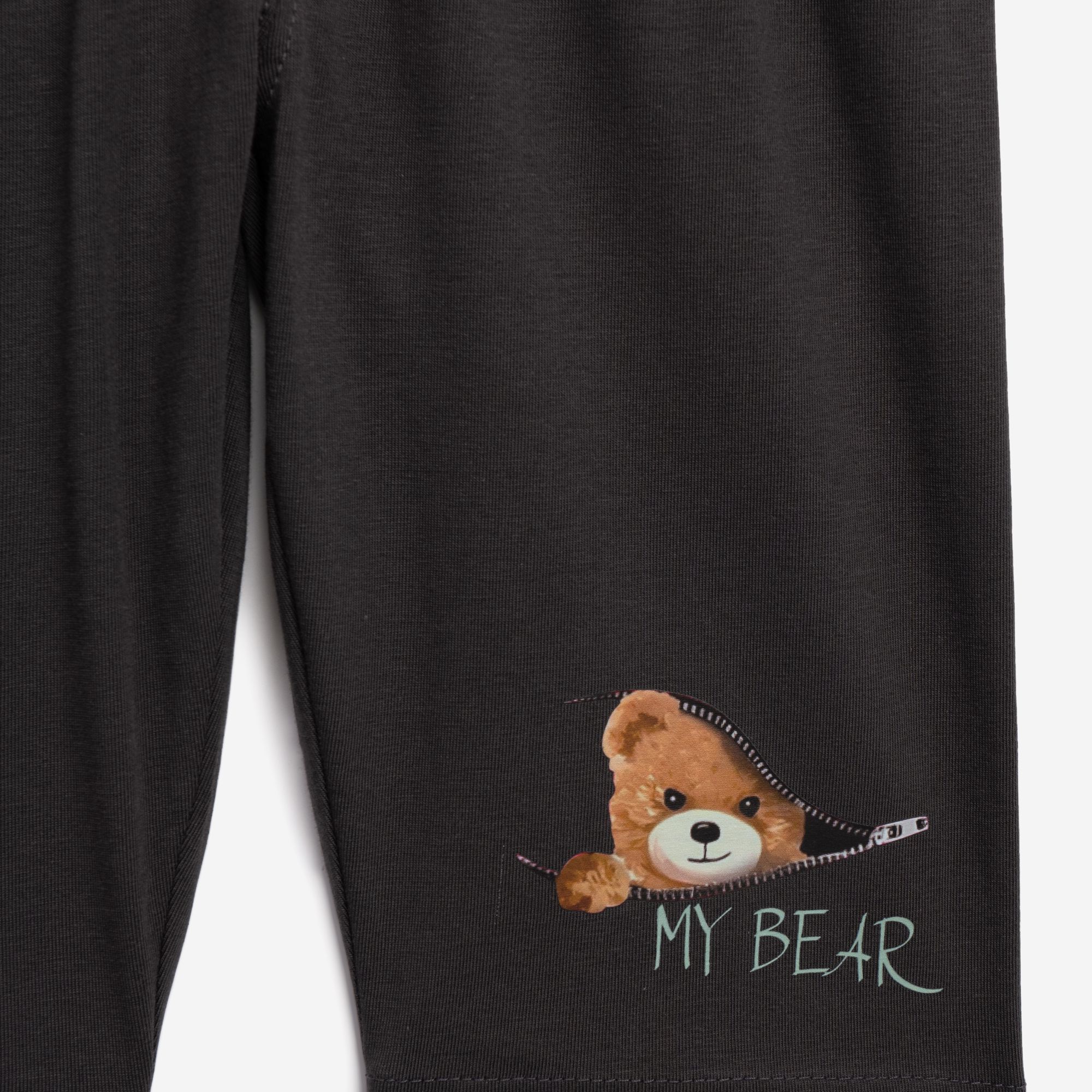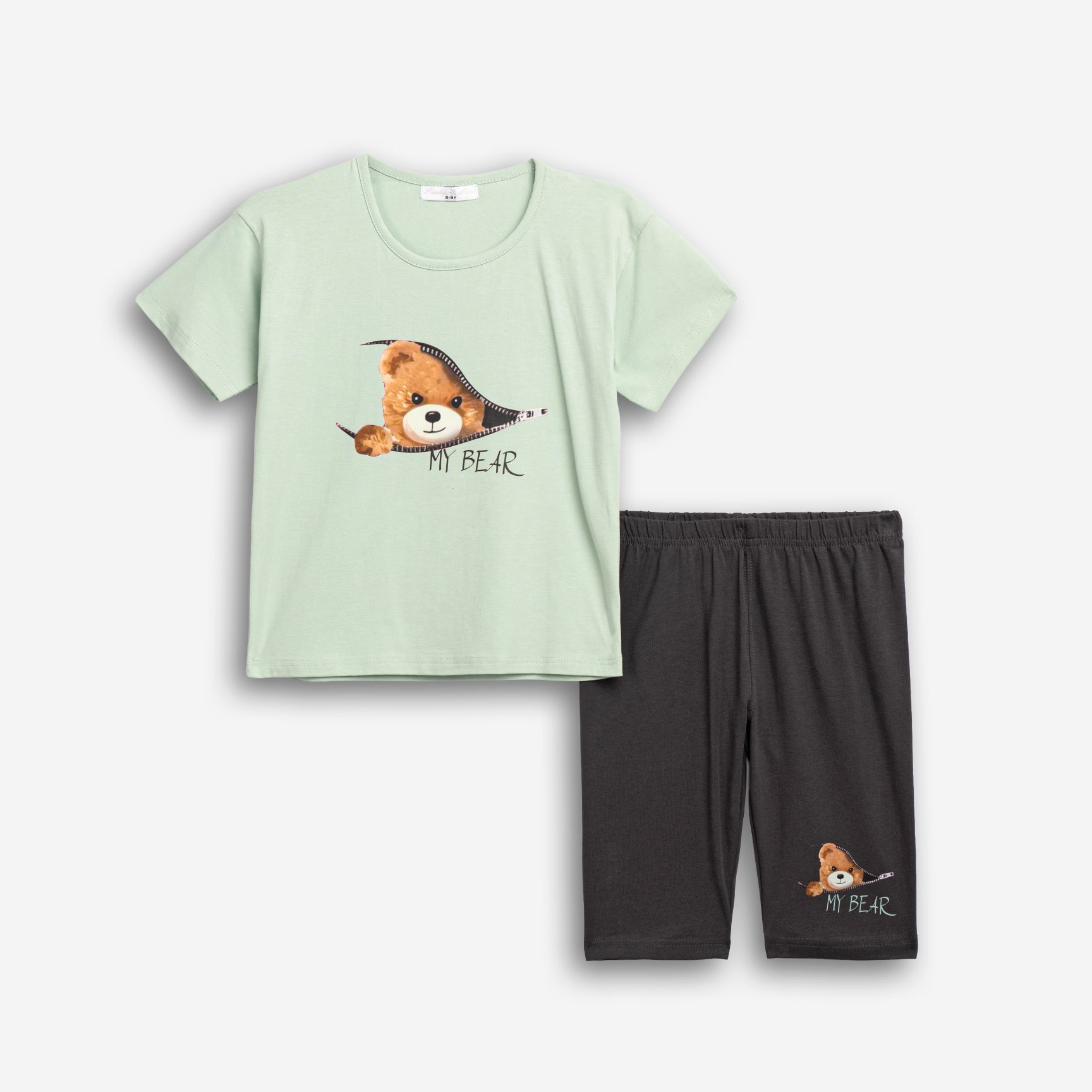 Σετ μπλούζα κάλτσα λύκρα με τύπωμα (αρκουδάκι) και κολάν ποδηλατικό με τύπωμα σε χρώμα φυστικί/ανθρακί για κορίτσι 6-16 ετών