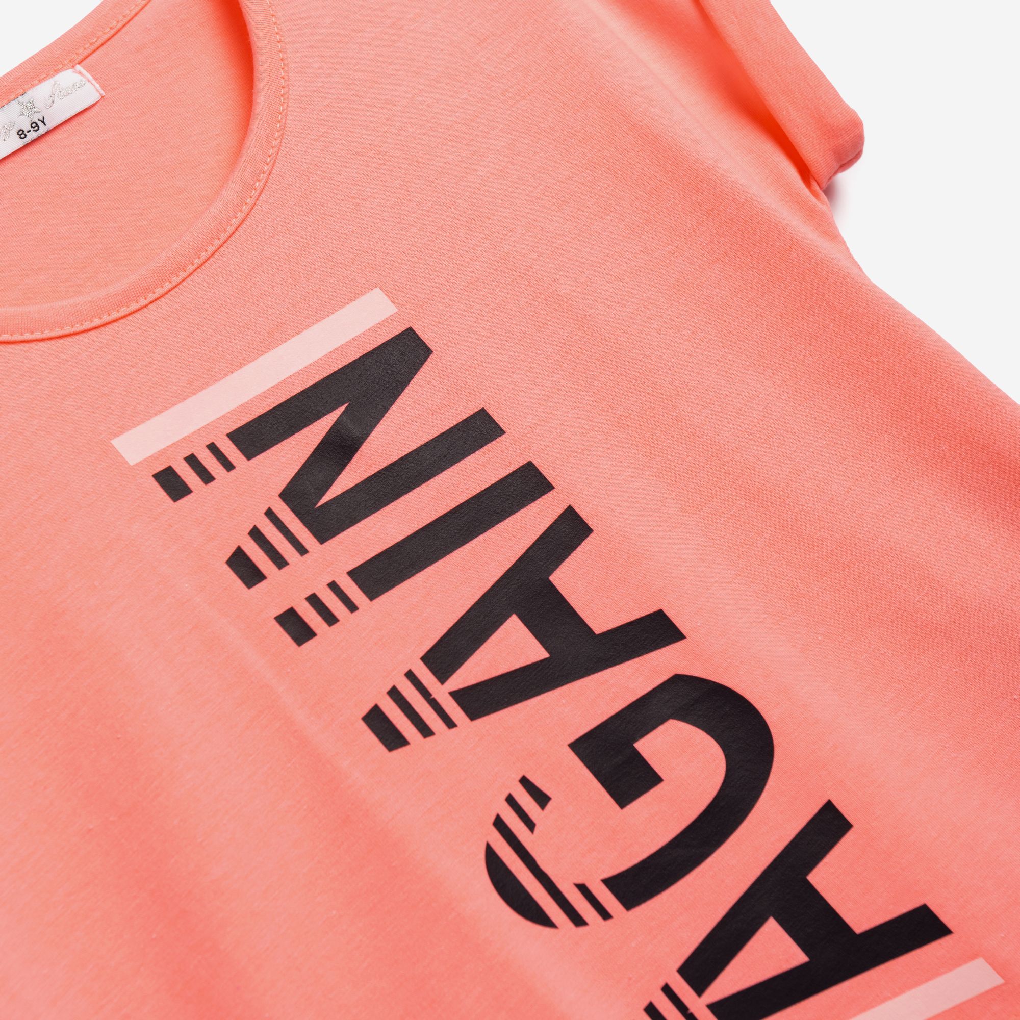 Σετ μπλούζα κάλτσα λύκρα με τύπωμα (again) και βερμούδα με τύπωμα σε χρώμα φωσφορούχο ανοιχτό σομόν/μπλέ για κορίτσι 6-16 ετών