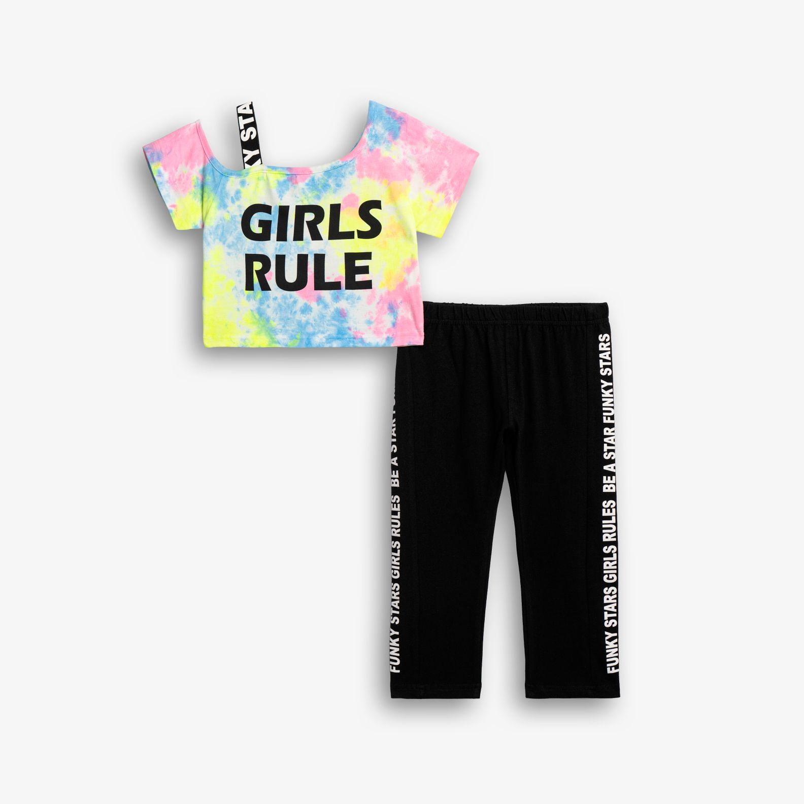 Σετ μπλούζα με τύπωμα (girls rule) και κολάν κάπρι κάλτσα λύκρα με τύπωμα σε χρώμα tie dye-φωσφορούχο πεπονί-ουρανί-φωσφορούχο ρόζ/μαύρο για κορίτσι 6-16 ετών