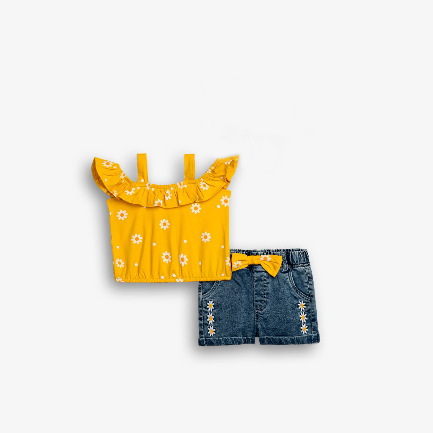 Σετ μπλούζα κάλτσα λύκρα με τύπωμα (λουλούδια) allover και σόρτς τζίν λύκρα σε χρώμα κροκί/μπλέ τζίν για κορίτσι 1-6 ετών