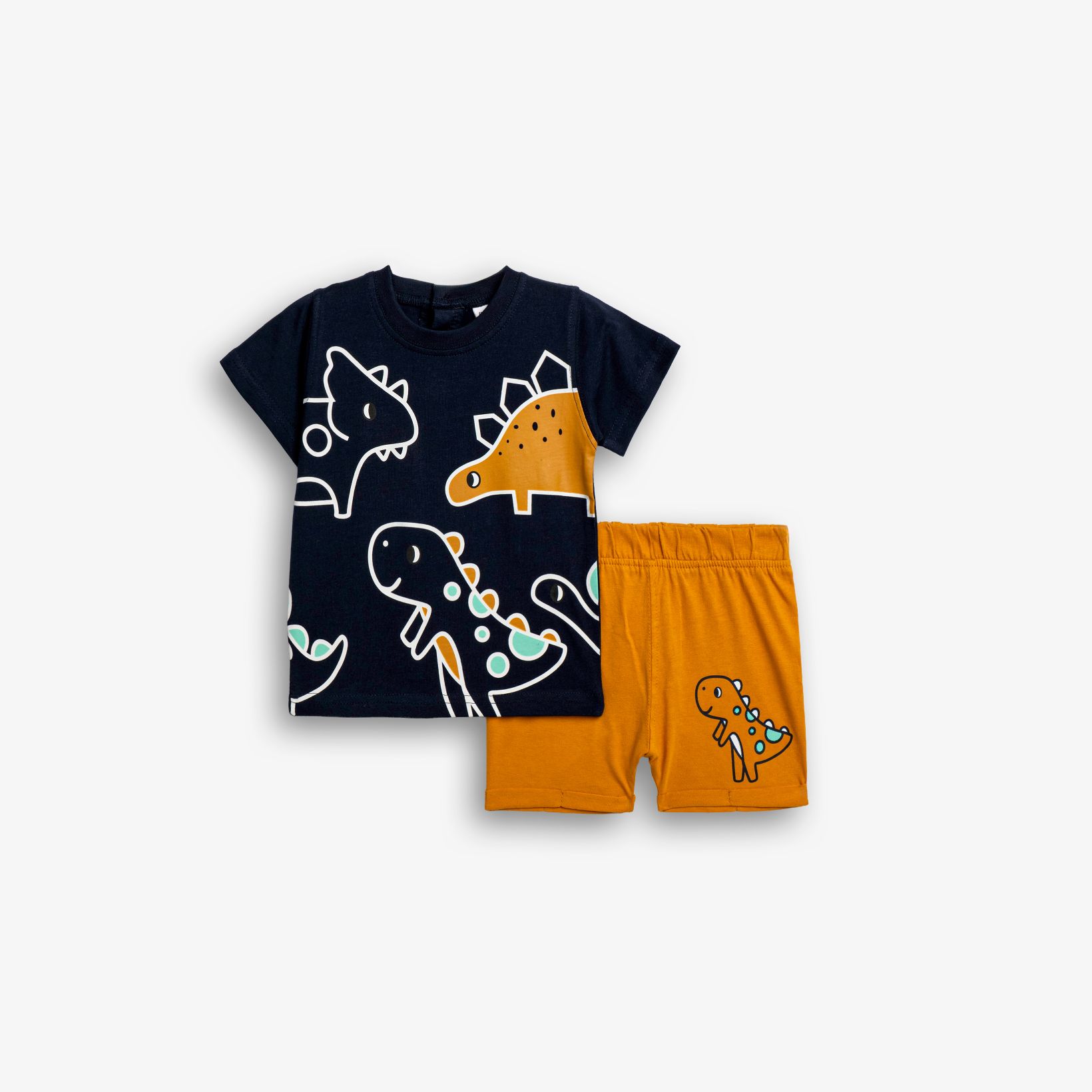 Σετ μπλούζα μακό με τύπωμα (δεινοσαυράκια) και σόρτς με τύπωμα σε χρώμα μπλέ/τζίντζερ για αγόρι μηνών