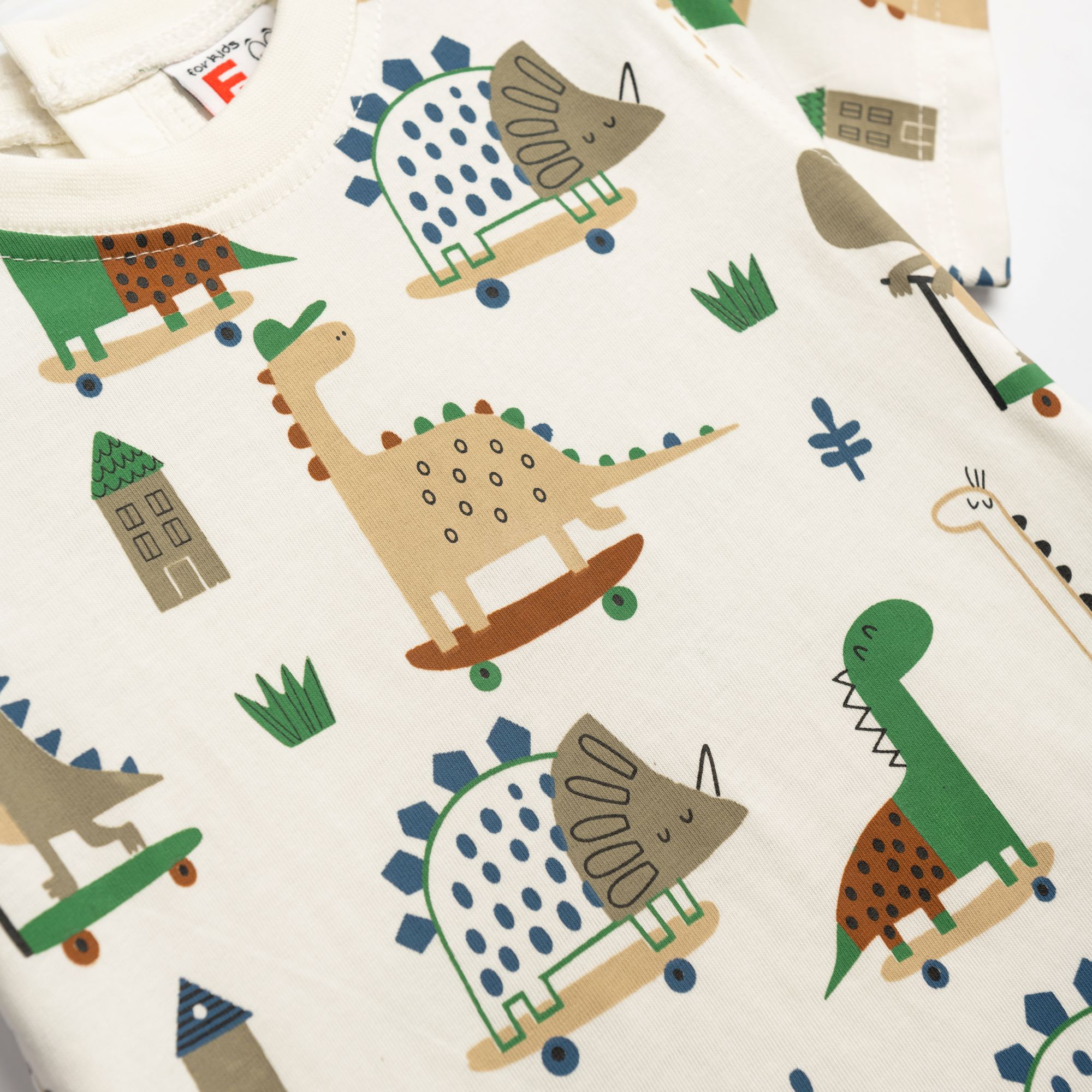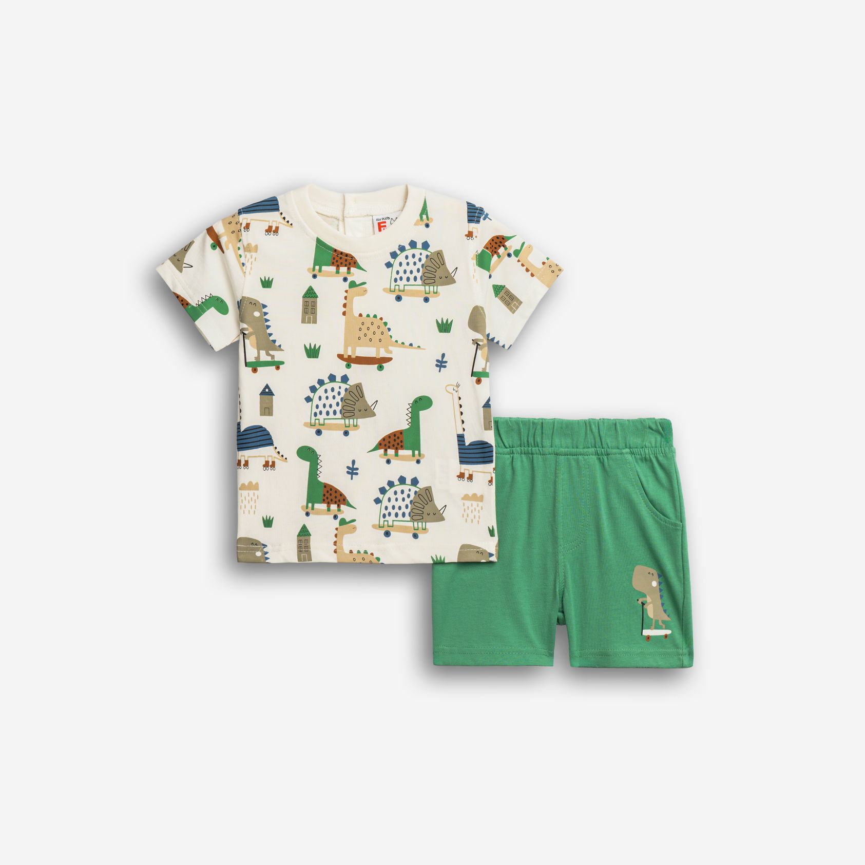 Σετ μπλούζα μακό με τύπωμα (δεινοσαυράκια) allover και σόρτς με τύπωμα σε χρώμα εκρού/leprechaun για αγόρι μηνών