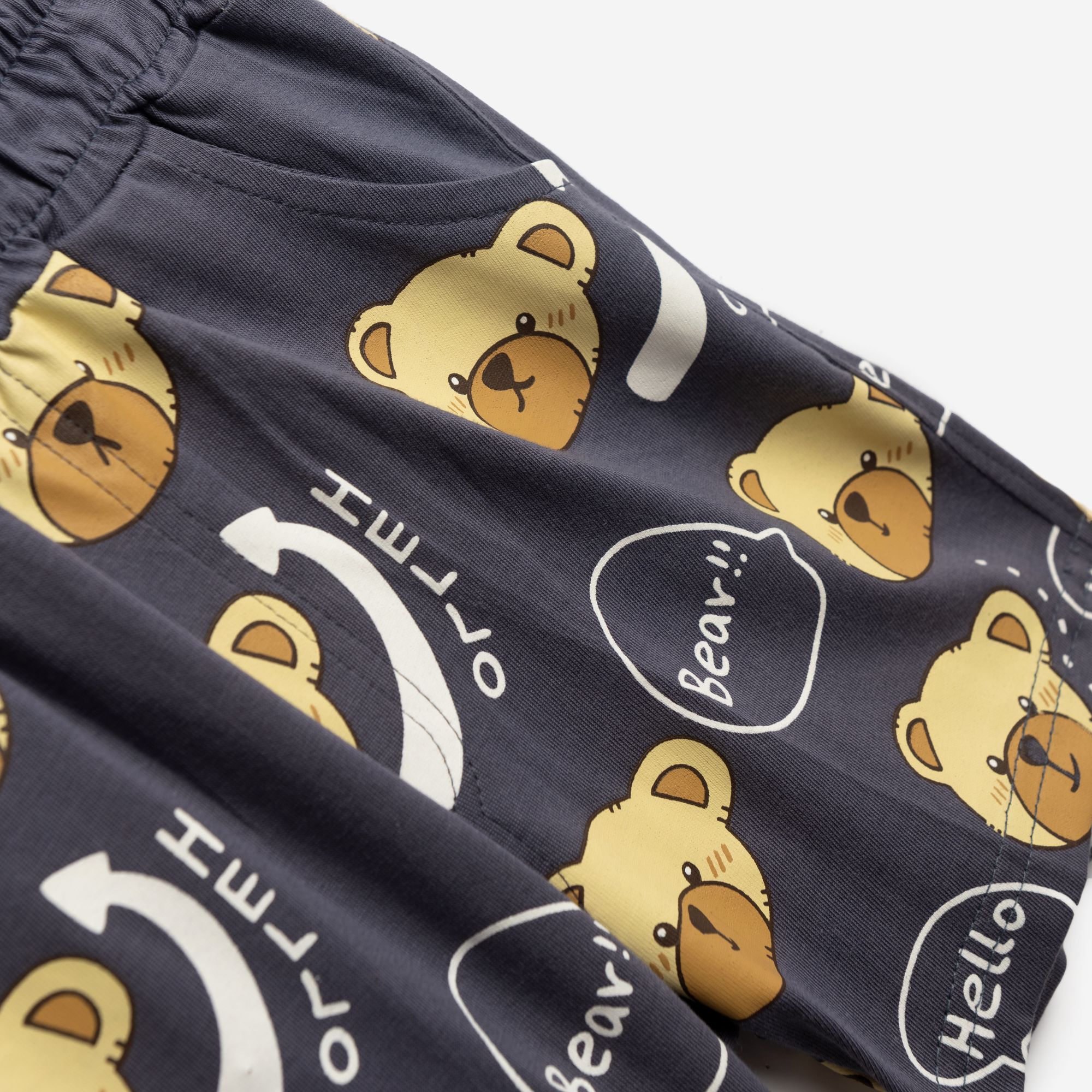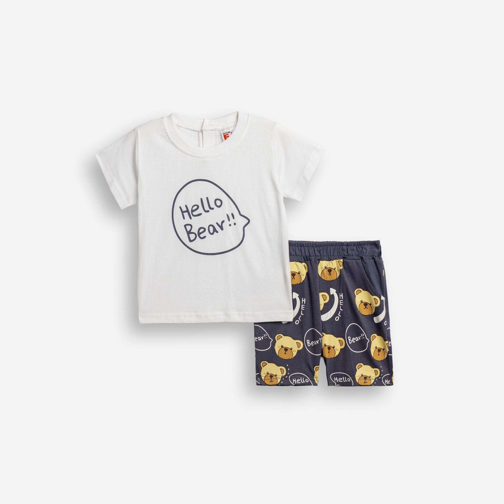 Σετ μπλούζα μακό με τύπωμα (hello bear) και σόρτς με τύπωμα allover σε χρώμα λευκό/ραφ για αγόρι μηνών