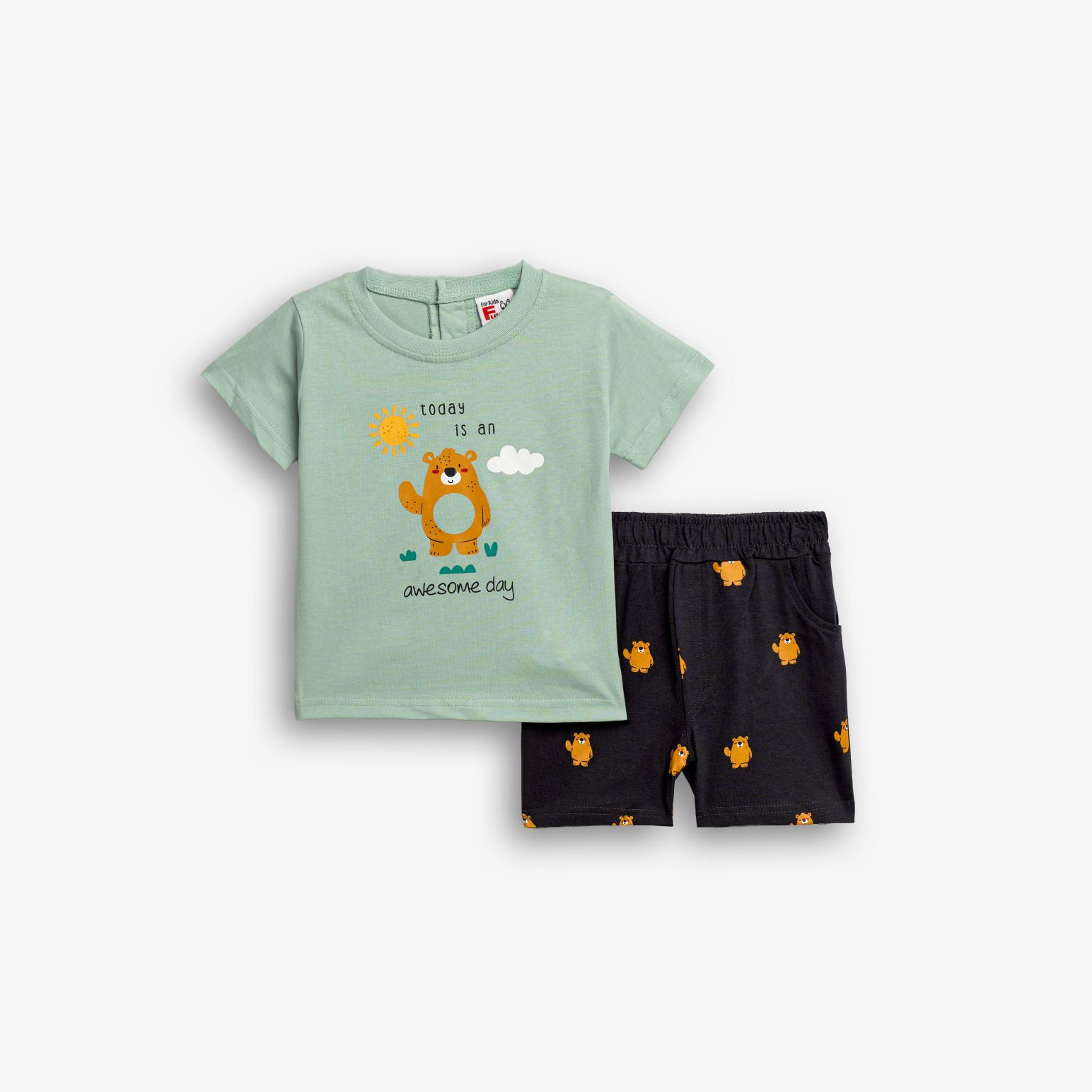 Σετ μπλούζα μακό με τύπωμα (αρκουδάκι) allover και σόρτς με τύπωμα allover σε χρώμα φυστικί/ανθρακί για αγόρι μηνών
