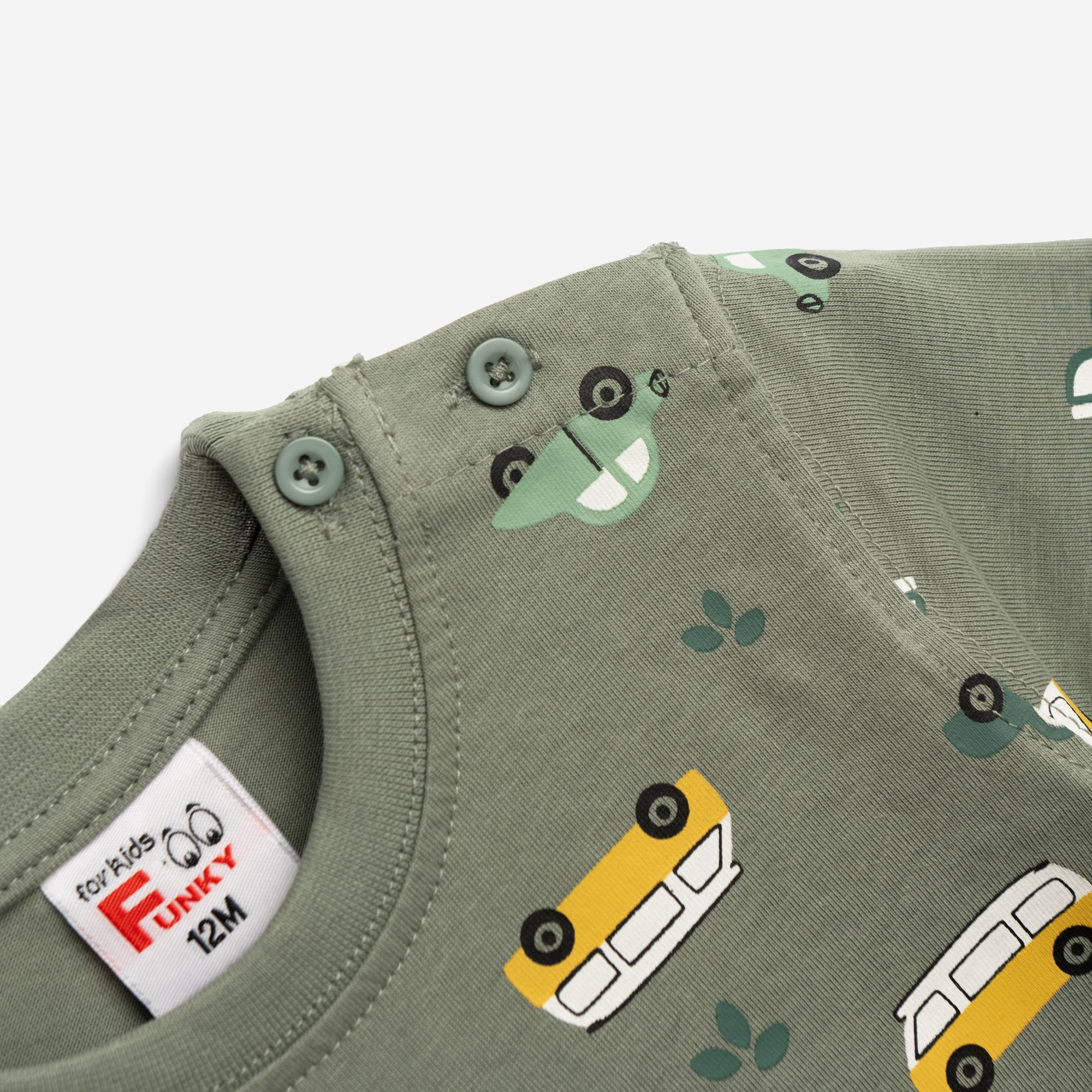 Σετ μπλούζα με τύπωμα (αυτοκινητάκια) allover και βερμούδα σταθερή με τσέπες σε χρώμα ανοιχτό χακί/μπέζ άμμου για αγόρι μηνών