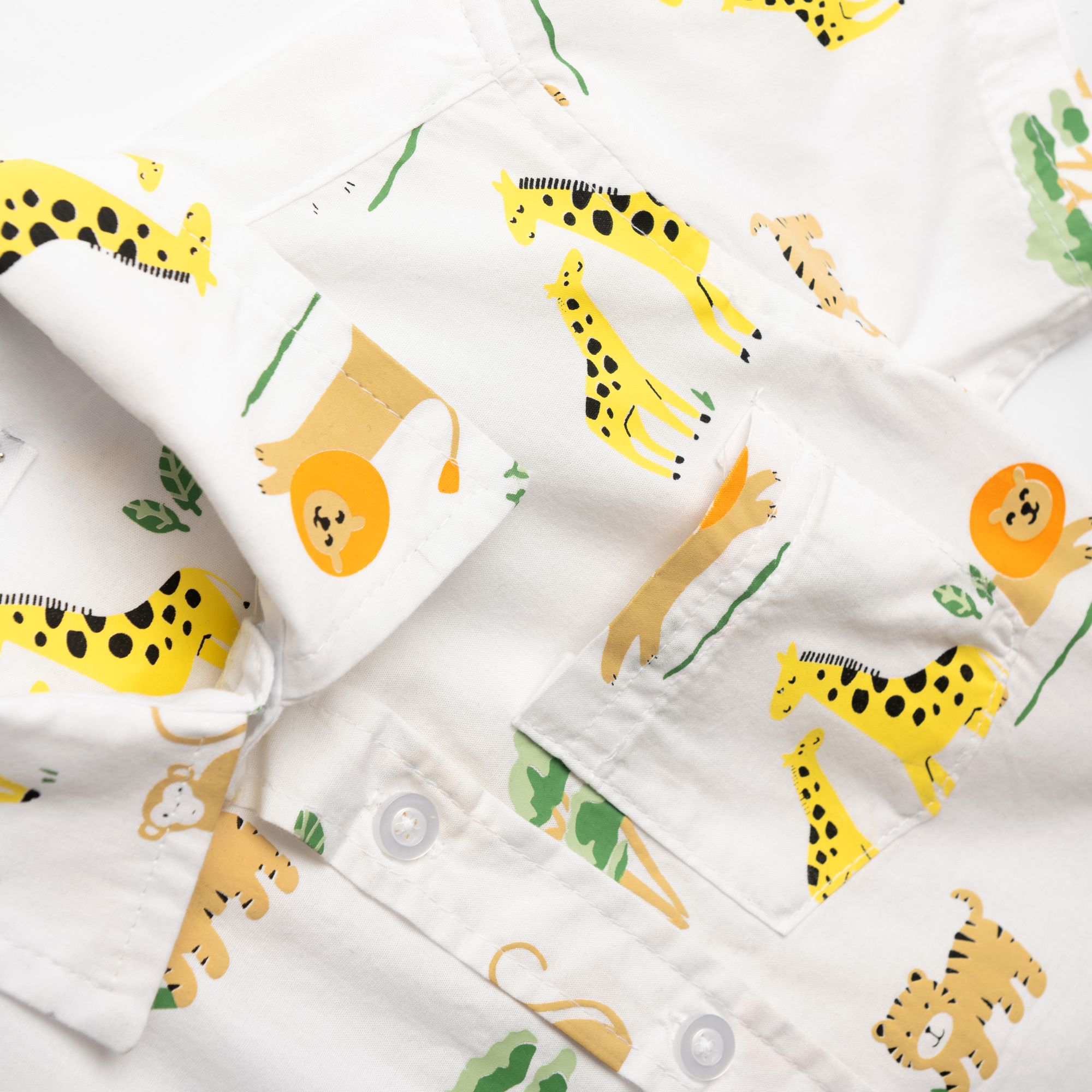 Σετ πουκάμισο κοντομάνικο ποπλίνα με τύπωμα (ζωάκια) και παντελόνι λινό σε χρώμα λευκό/άμμος για αγόρι μηνών