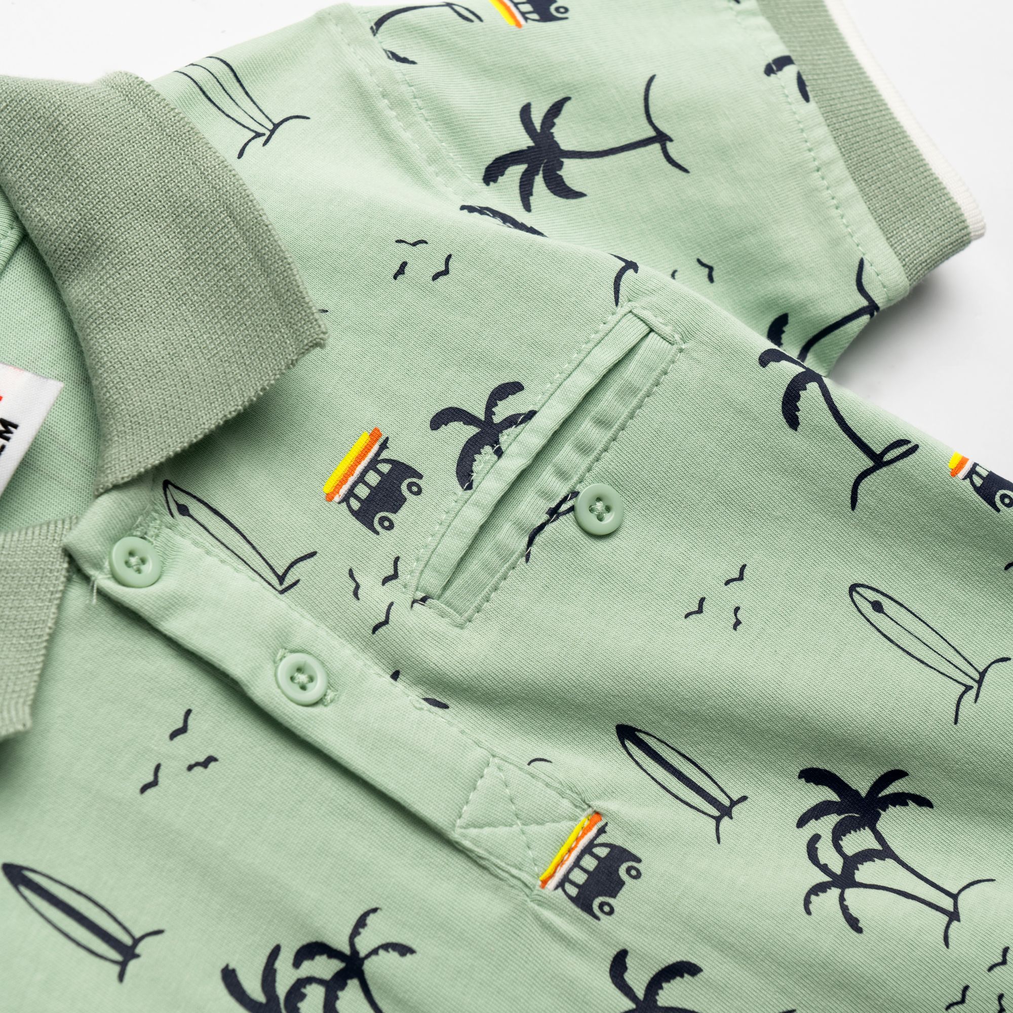 Σετ μπλούζα κοντομάνικη πόλο κάλτσα με τύπωμα (καλοκαιρινά σχέδια) allover και βερμούδα λύκρα με τσέπες σε χρώμα φυστικί/μπλέ για αγόρι μηνών