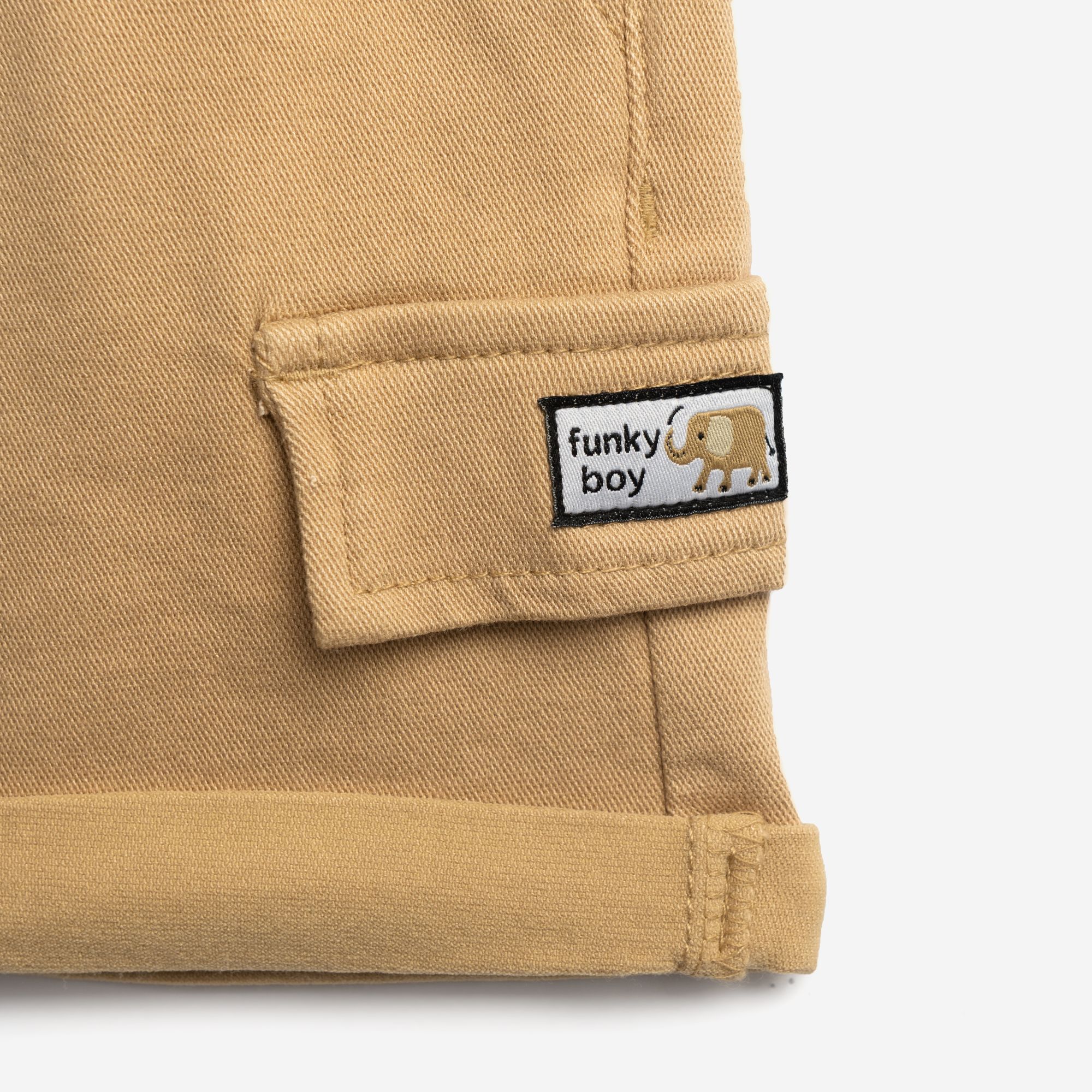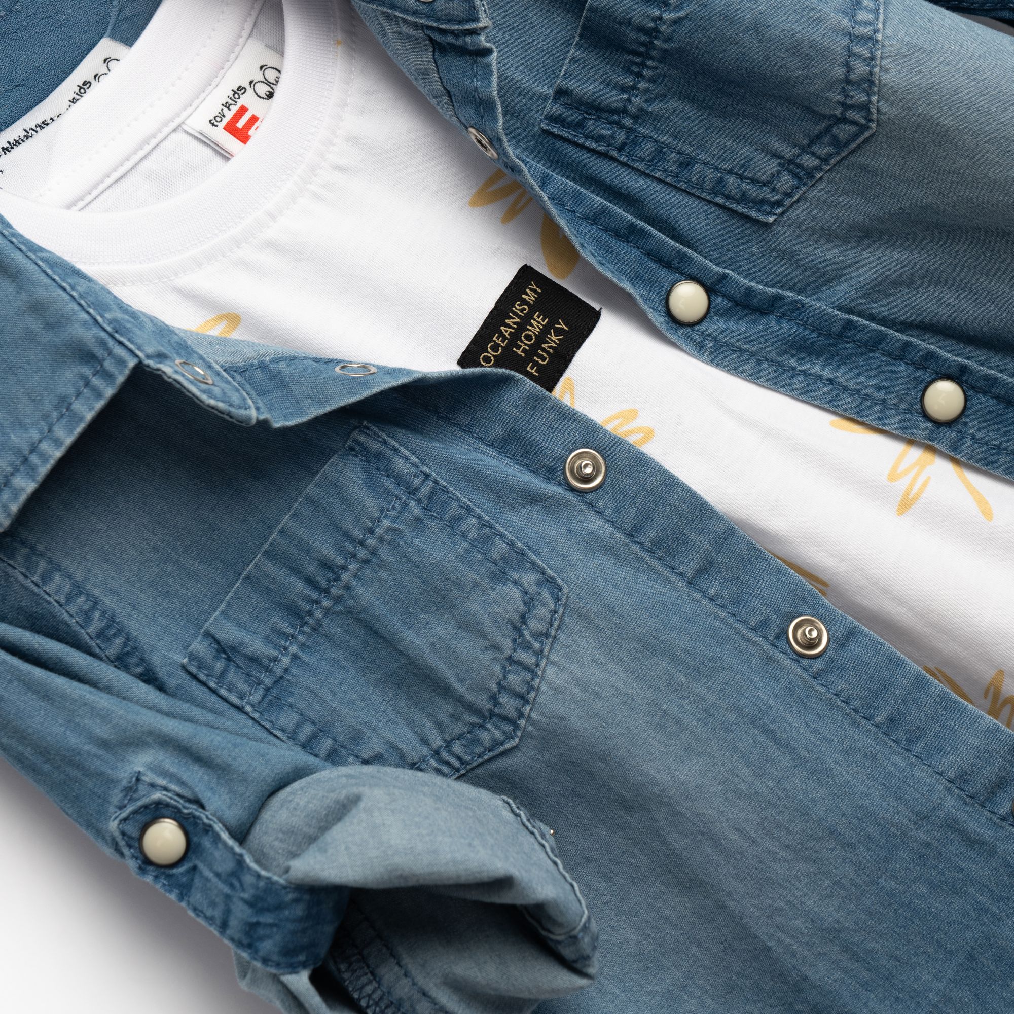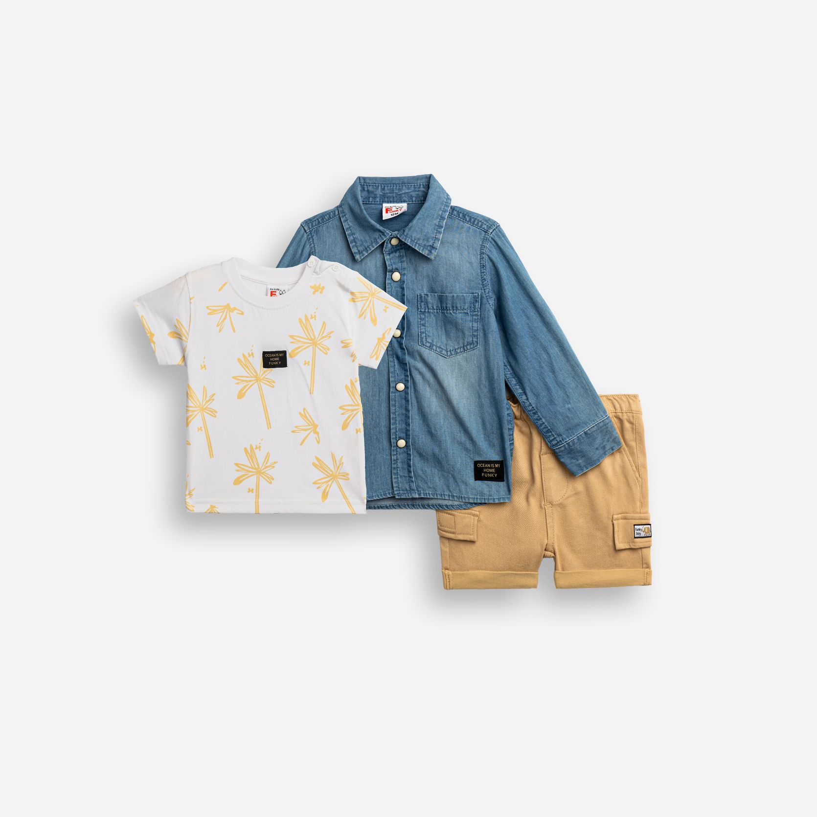 Σετ 3 τεμάχια πουκάμισο μακρυμάνικο τζίν μαλακό με τσέπες και μπλούζα κοντομάνικη με τύπωμα (φοίνικες) allover και βερμούδα λύκρα με τσέπες σε χρώμα τζίν/λευκό/άμμος για αγόρι μηνών