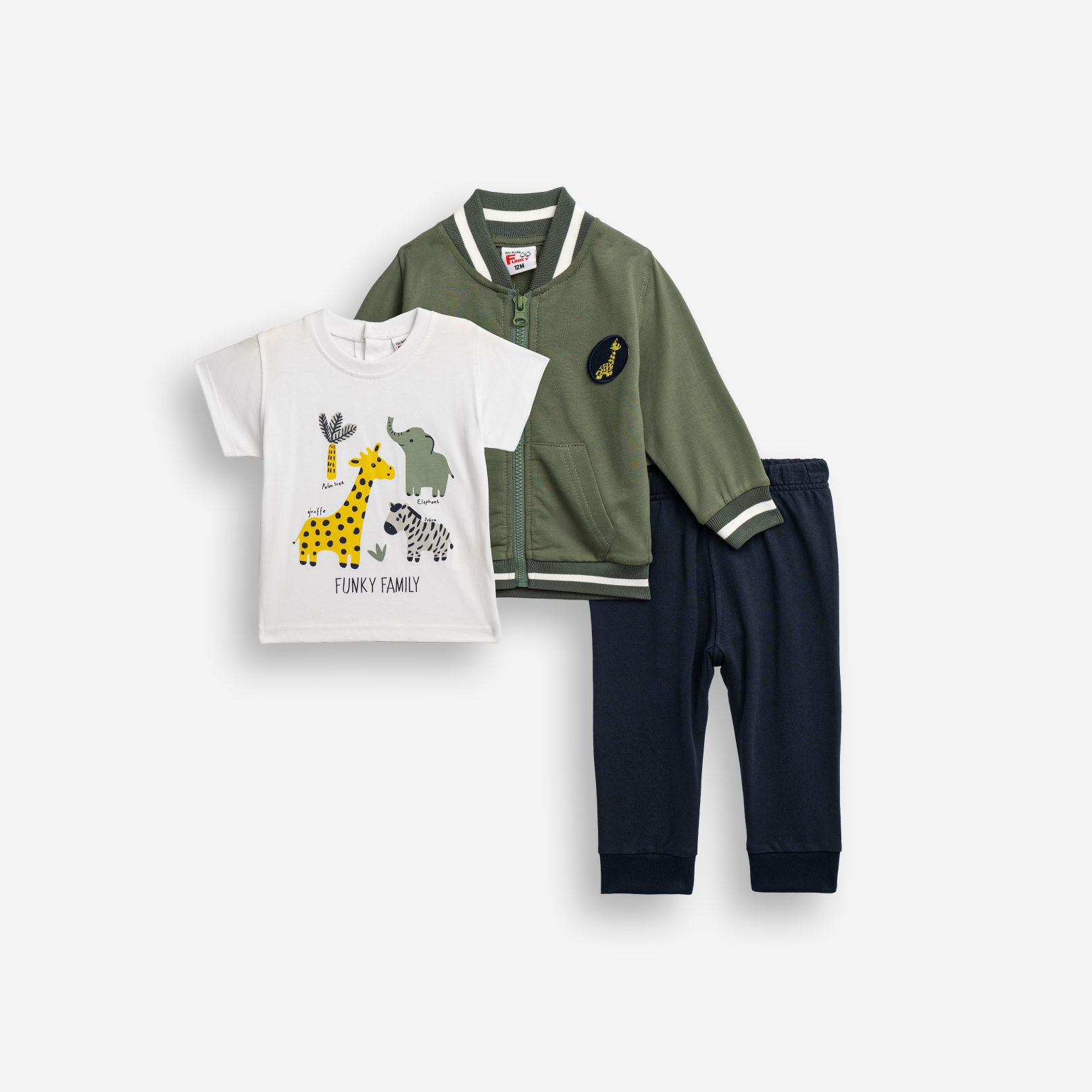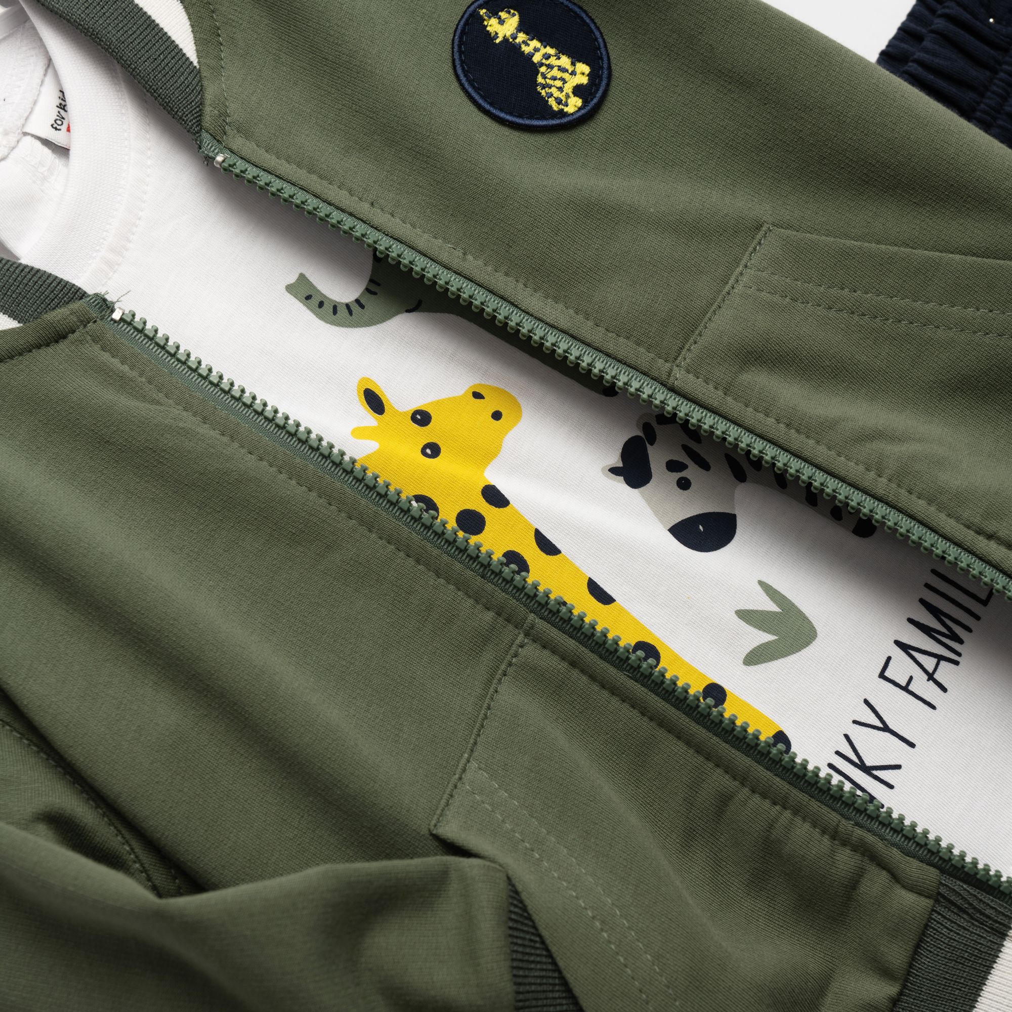 Σετ 3 τεμάχια ζακέτα φούτερ και μπλούζα κοντομάνικη κάλτσα με τύπωμα (ζωάκια) και παντελόνι φούτερ χακί/λευκό/μπλε για αγόρι μηνών