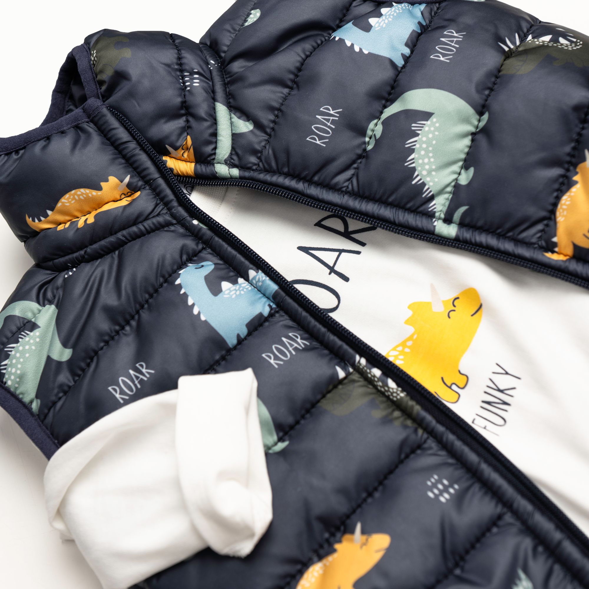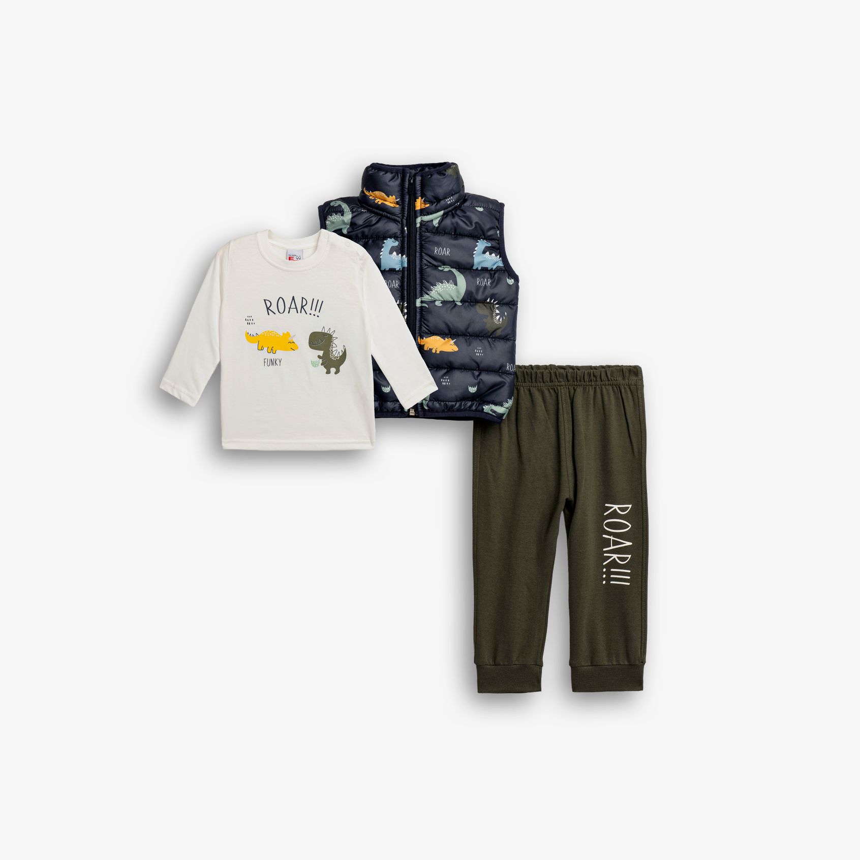 Σετ 3 τεμάχια τζάκετ αμάνικο με τύπωμα allover και μπλούζα μακρυμάνικη κάλτσα με τύπωμα (δεινόσαυροι) και παντελόνι φούτερ με τύπωμα μπλέ/εκρού/χακί για αγόρι μηνών
