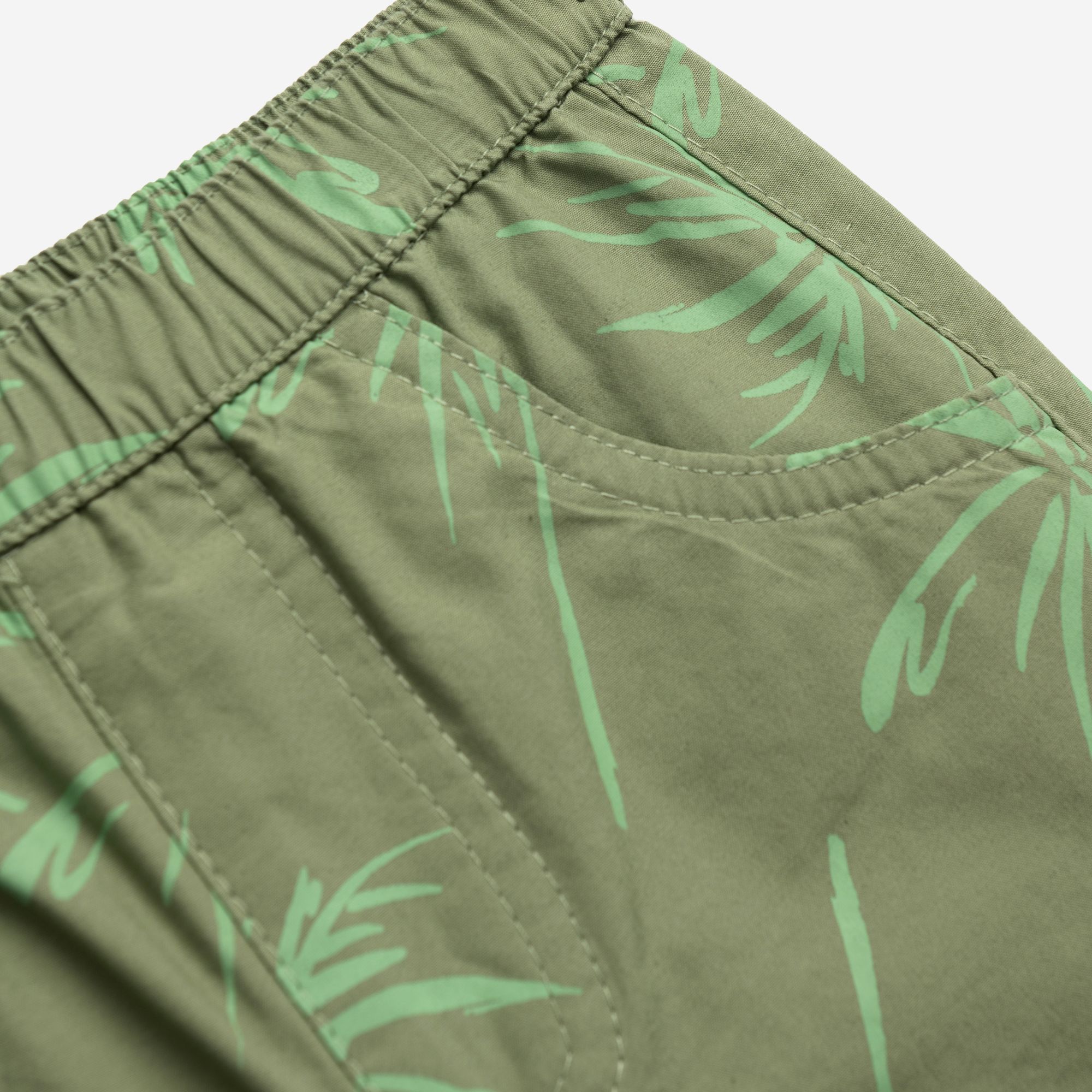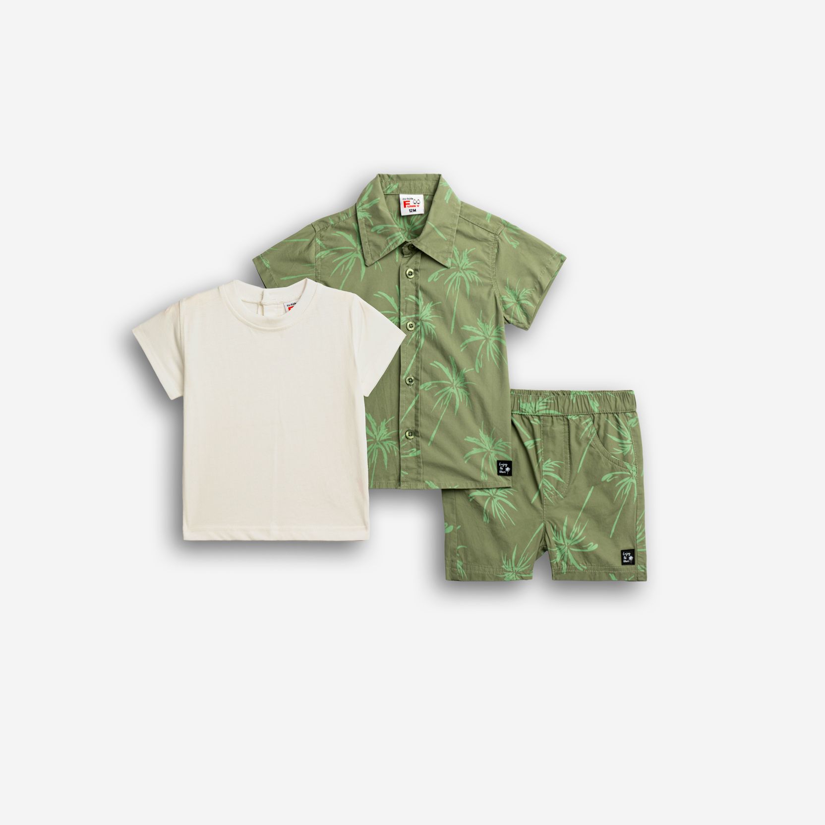 Σετ 3 τεμάχια πουκάμισο κοντομάνικο ποπλίνα με τύπωμα (φοίνικες) allover και μπλούζα κοντομάνικη και βερμούδα ποπλίνα με τύπωμα allover σε χρώμα ανοιχτό χακί/εκρού/ανοιχτό χακί για αγόρι μηνών