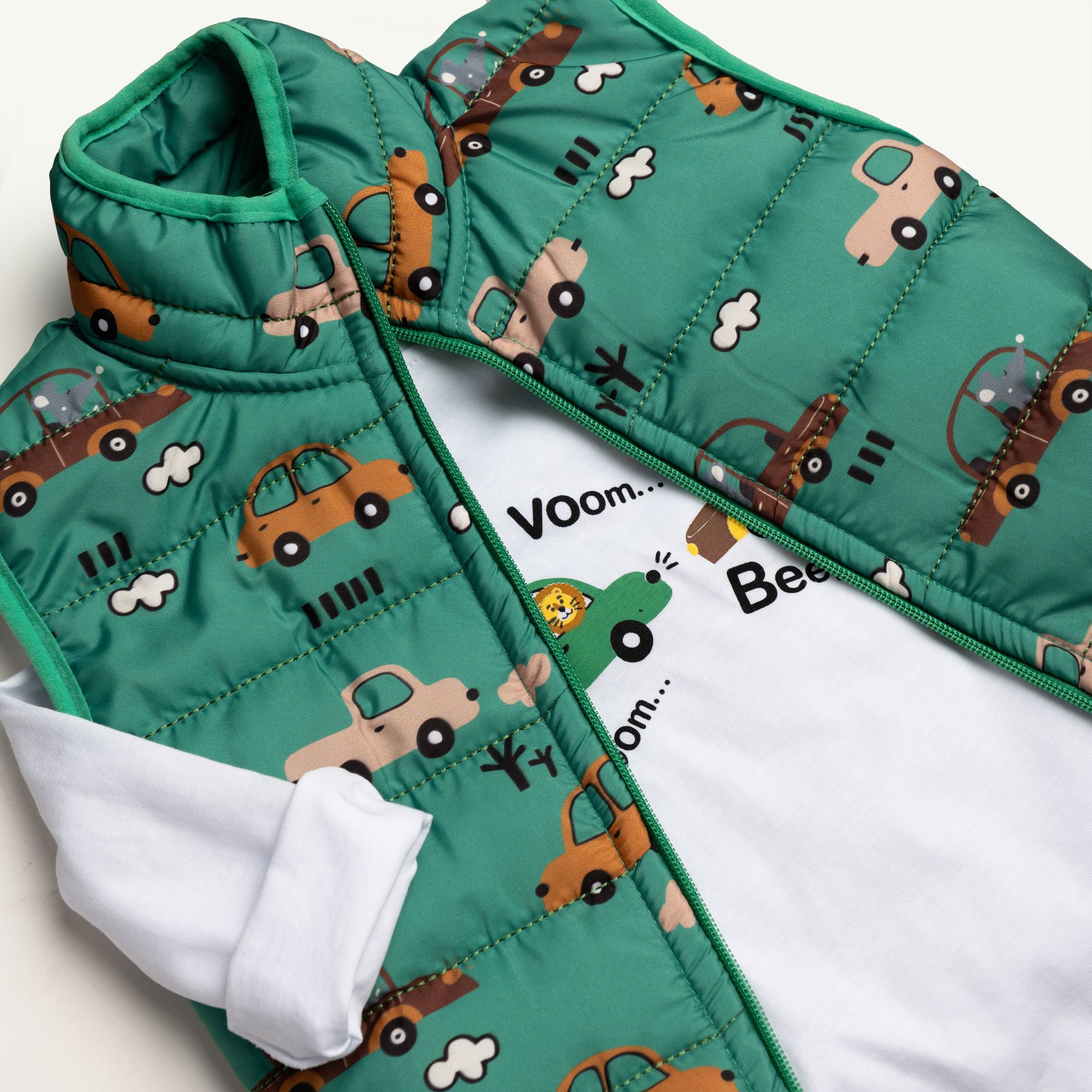 Σετ 3 τεμάχια τζάκετ αμάνικο με τύπωμα (αμαξάκια) allover και μπλούζα μακρυμάνικη κάλτσα με τύπωμα και παντελόνι σε χρώμα τύπος/μαύρο για αγόρι μηνών