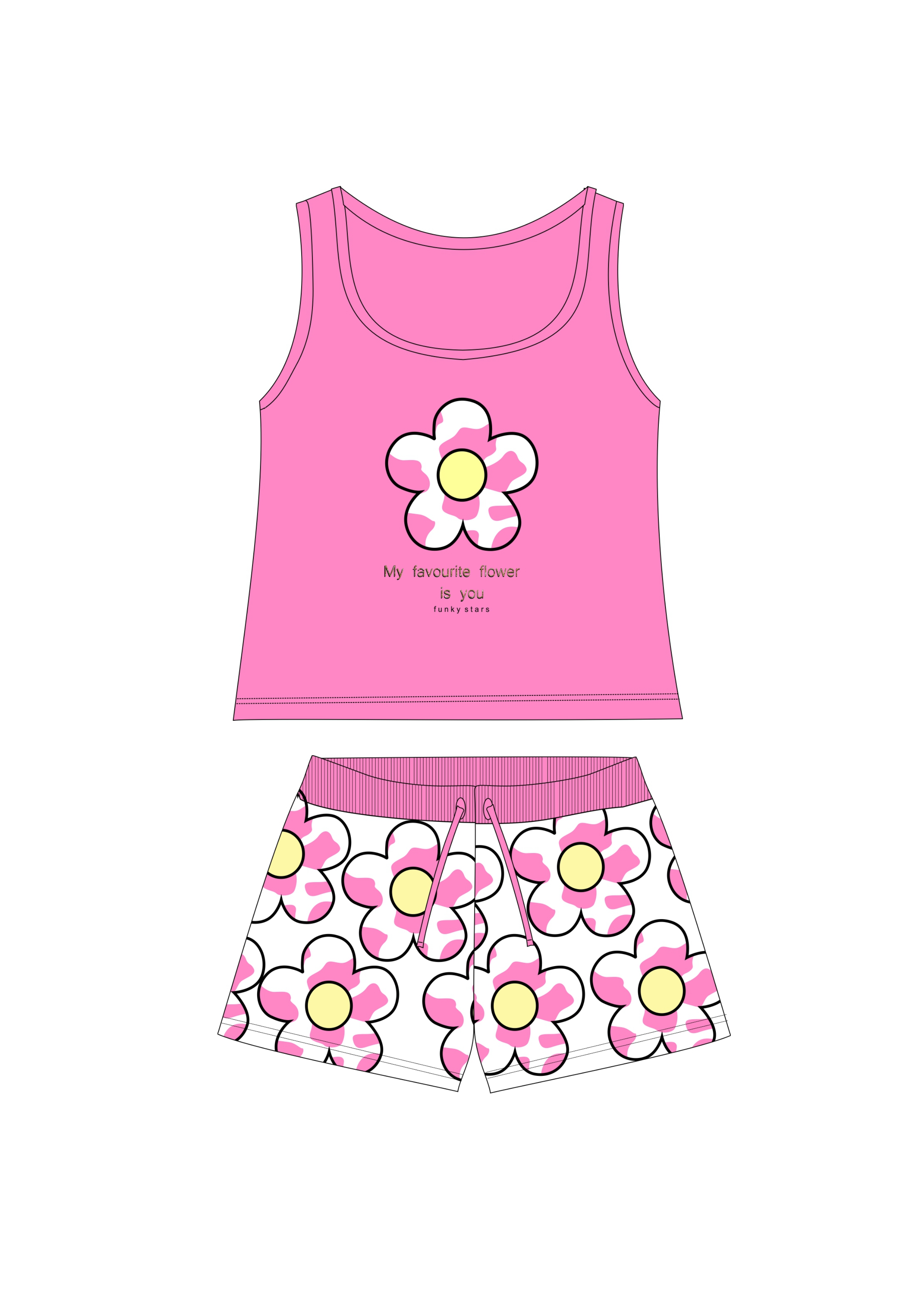 Set blouse jersey lycra with printing (flower) and shorts with printing in color fluorescent pink/white for girls 1-6 years