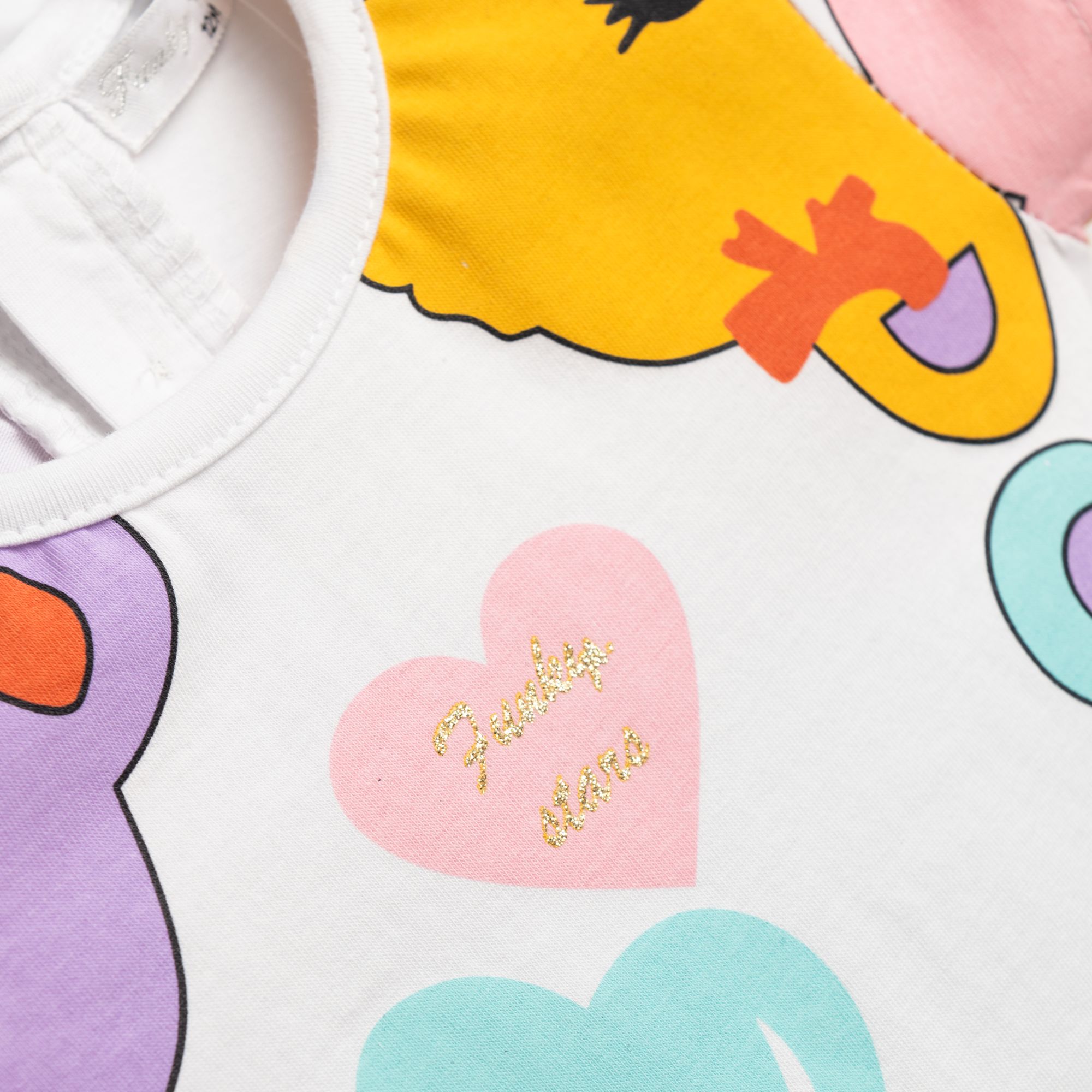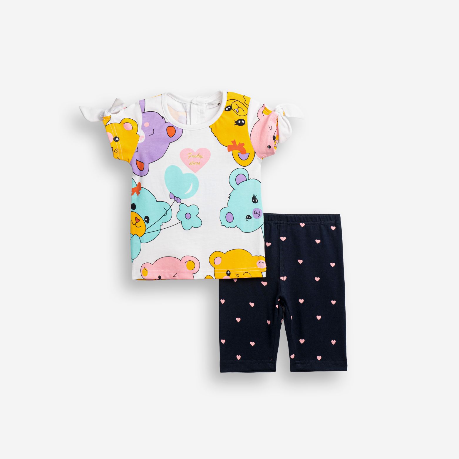 T-Shirt jersey lycra with printing (teddy bears) allover and leggings capri with printing allover in color white/blue for girls months