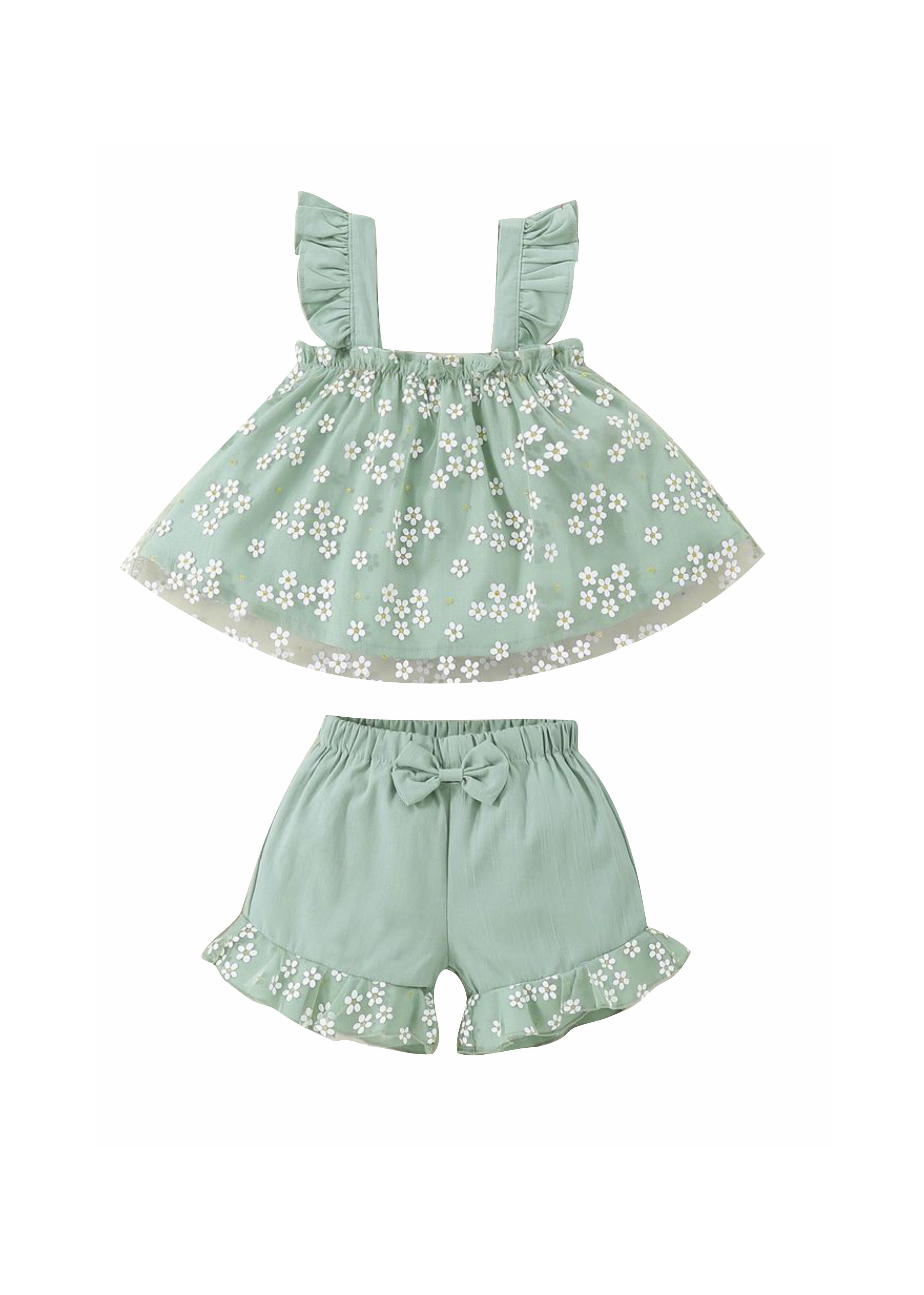 Set blouse jersey lycra with tulle and printing (chamomile) allover and shorts in color peanut/peanut for girls months